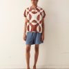 This short sleeve shirt is inspired by a textile salesman’s swatch circa the 19th century. The original fabric was made and printed in England for the Indian market under trade practices that prioritized importing English textiles over domestically produced Indian cotton. The pattern was faithfully reproduced from a small swatch.
