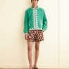 These shorts are inspired by a canvas vest from the 1960s. We reproduced the striped yardage and snaps for this style. The shorts are cut in a classic rugby silhouette, with a short inseam and wide leg opening.