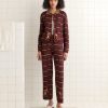 This cardigan is inspired by a vintage French cardigan, sourced in Paris. We reproduced the silhouette, with its pointed collar and its tie-neck detail, in purple cashmere with beaded trim.