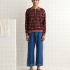 This cardigan is a historical reproduction of a baby cardigan from the 1960s. We reproduced the geometric red stripe pattern for this style.