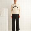 This style is inspired by a tennis sweater from the 1960s. It features wide navy and burgundy stripes around the collar, cuffs, and hem. The front is embroidered with a Bode logo.