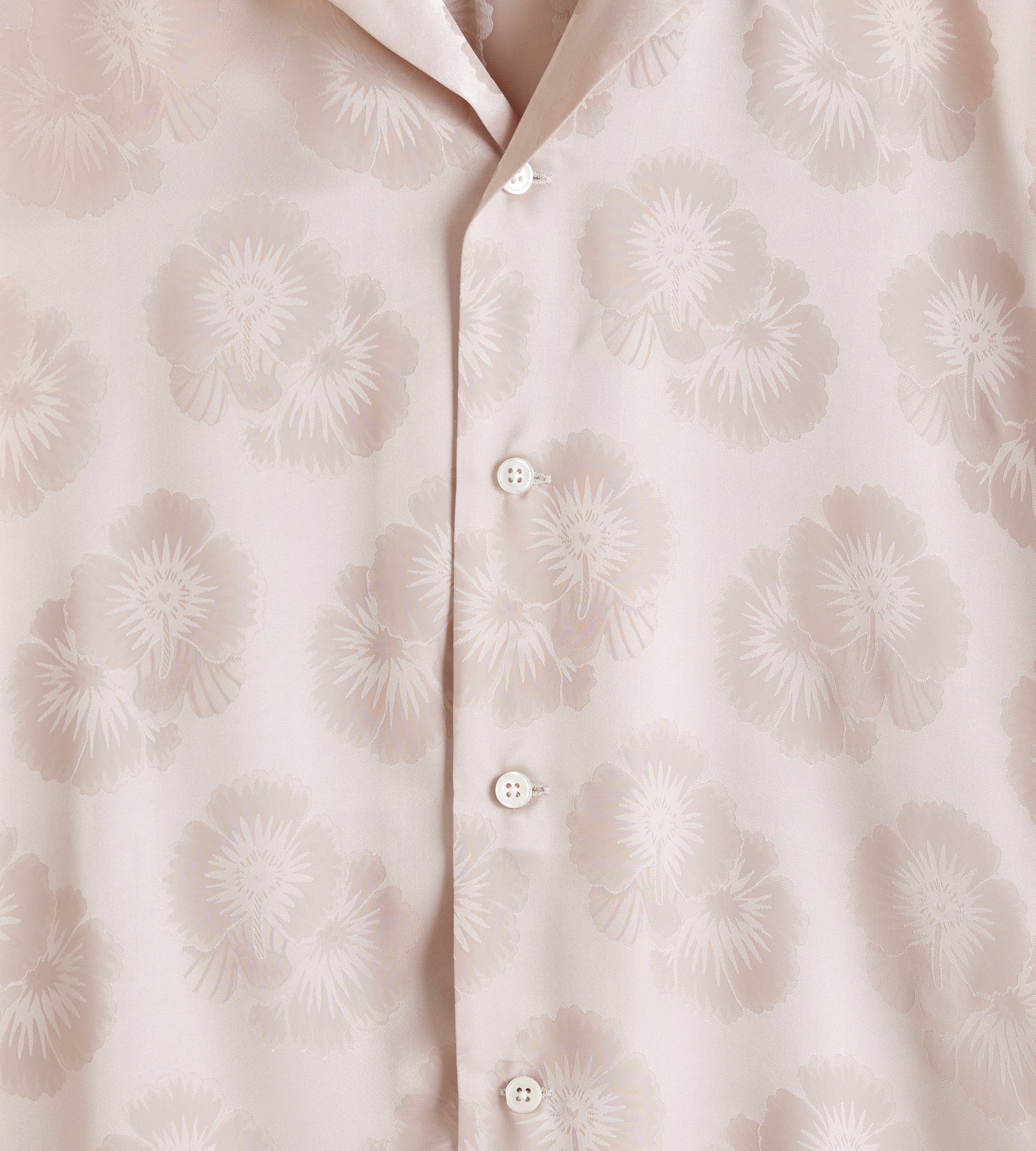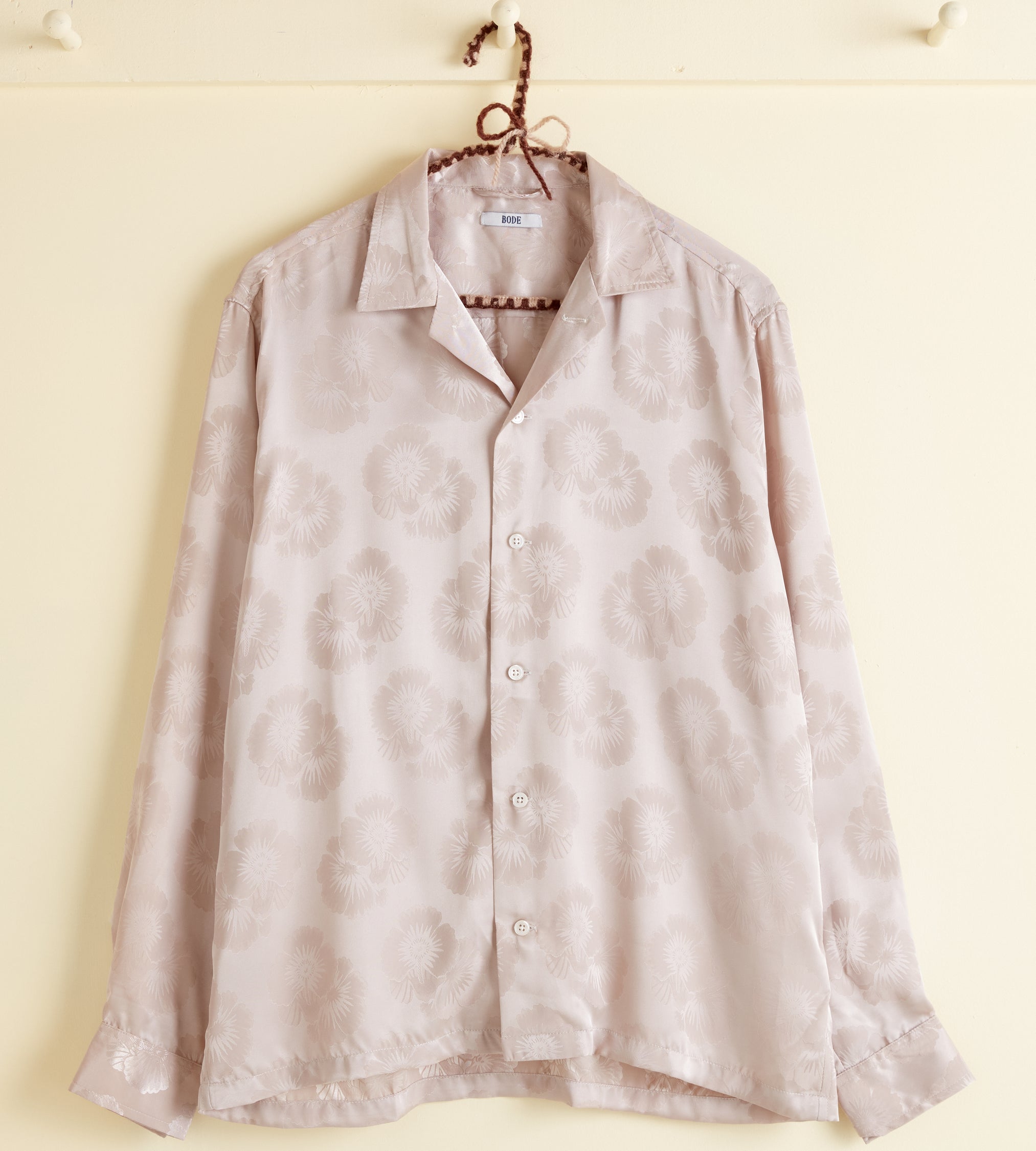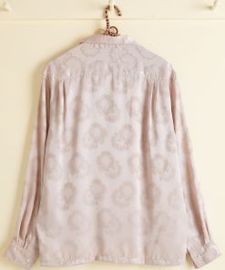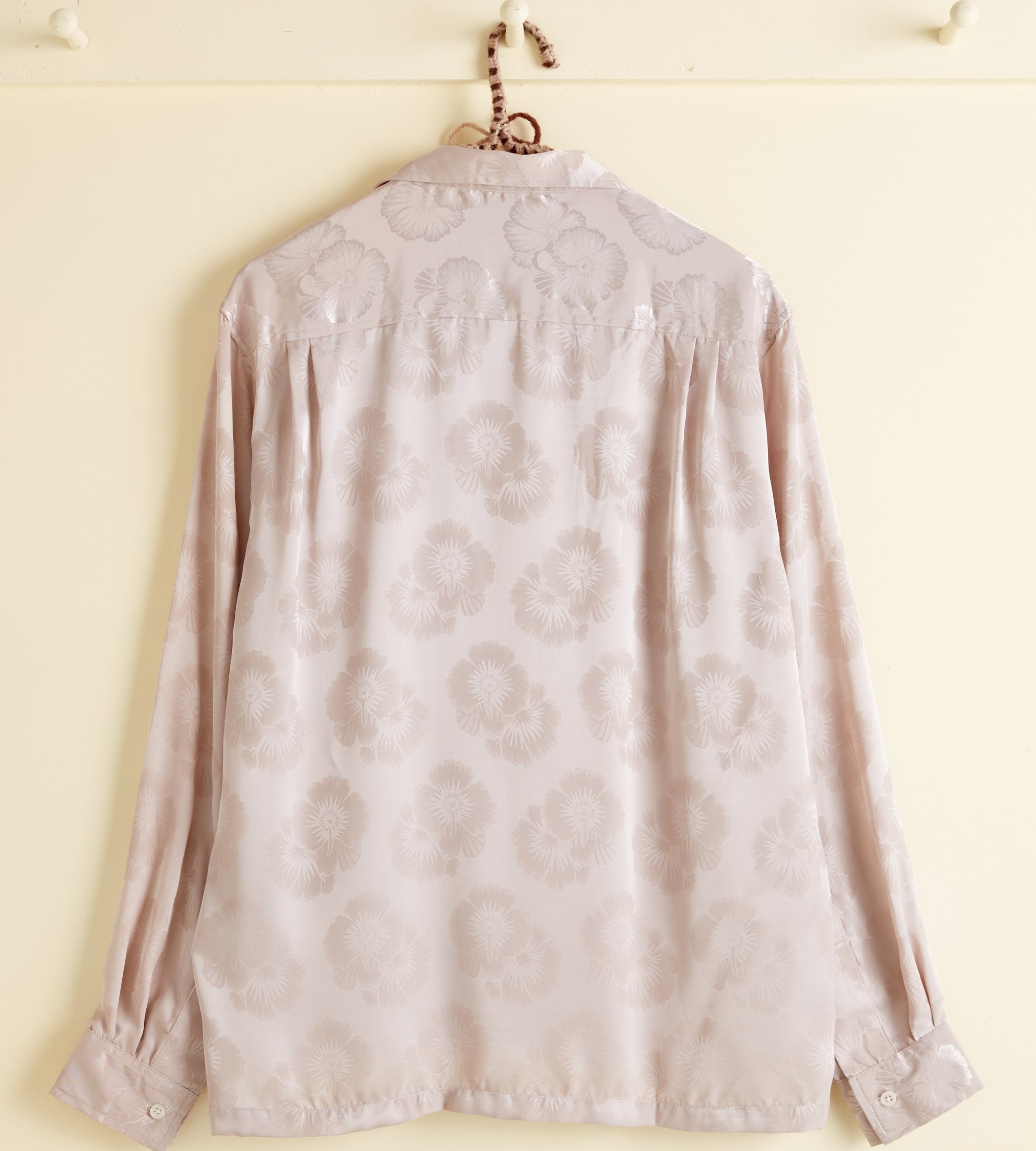 This shirt is made of deadstock yardage from the late 20th century. The silky fabric is woven with a two-tone floral pattern. Hand-mending throughout.