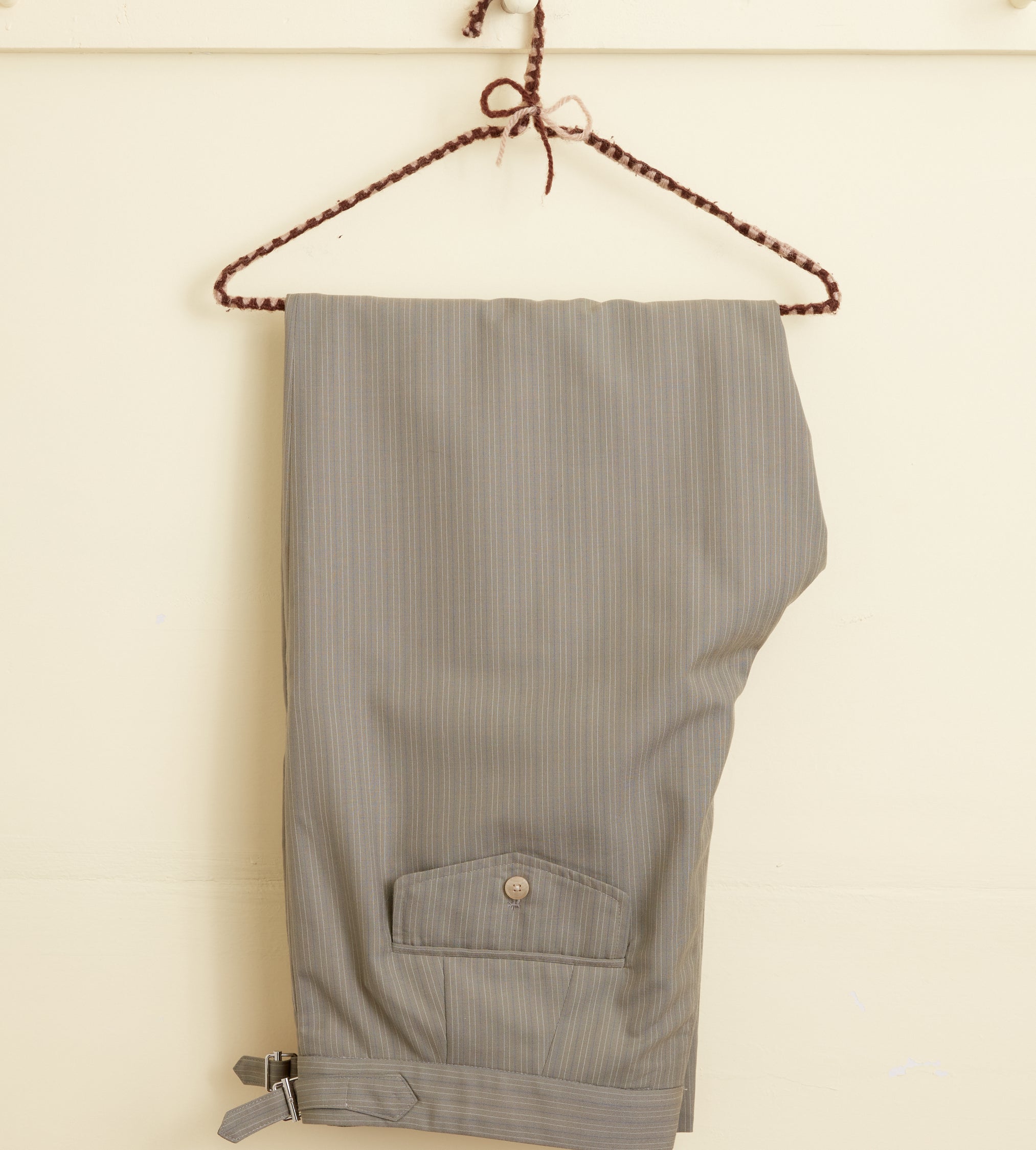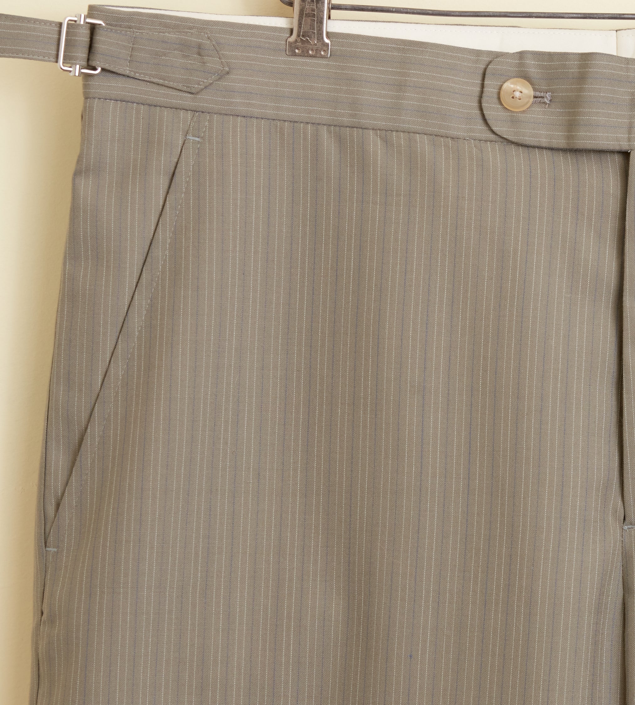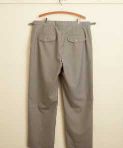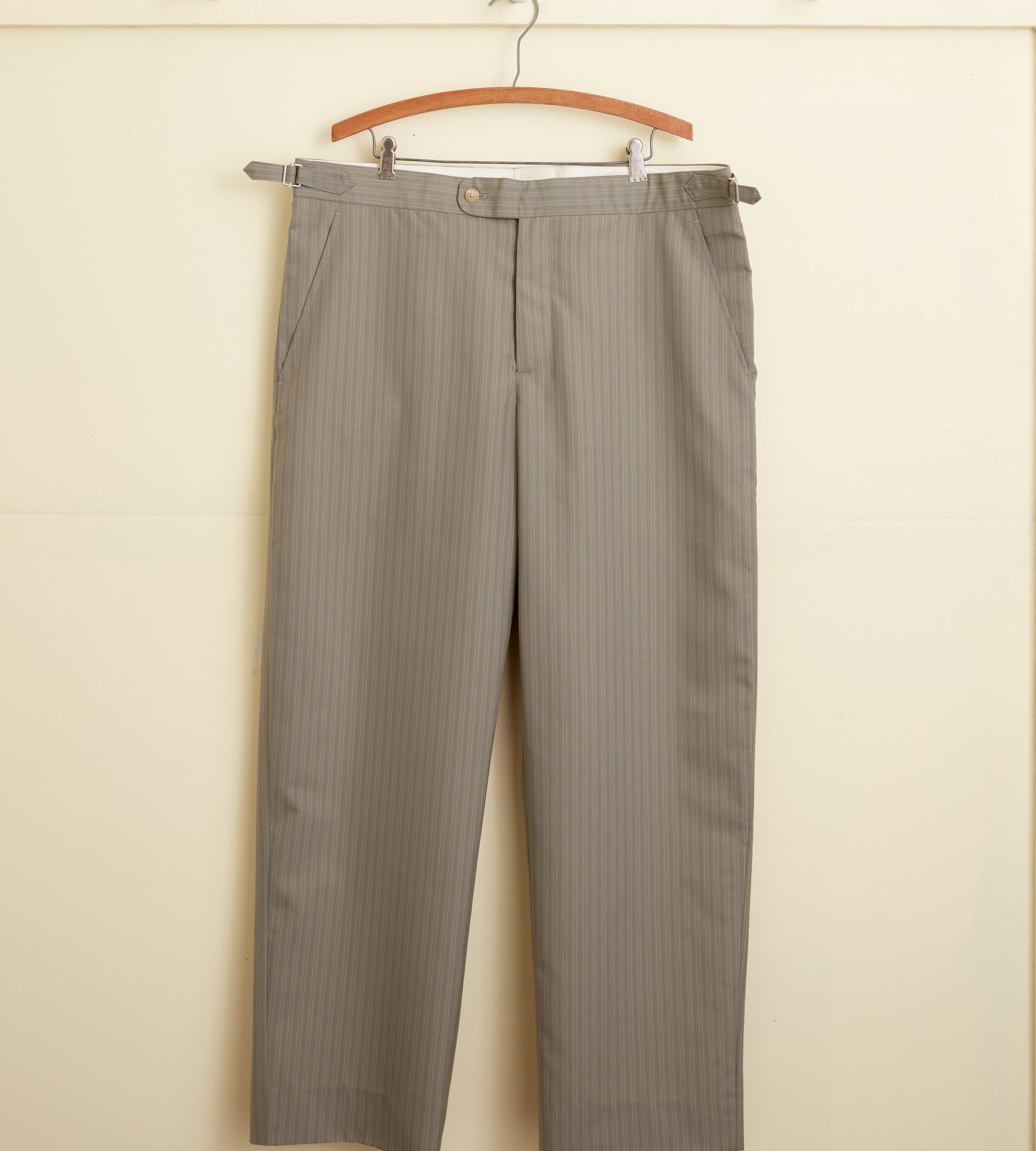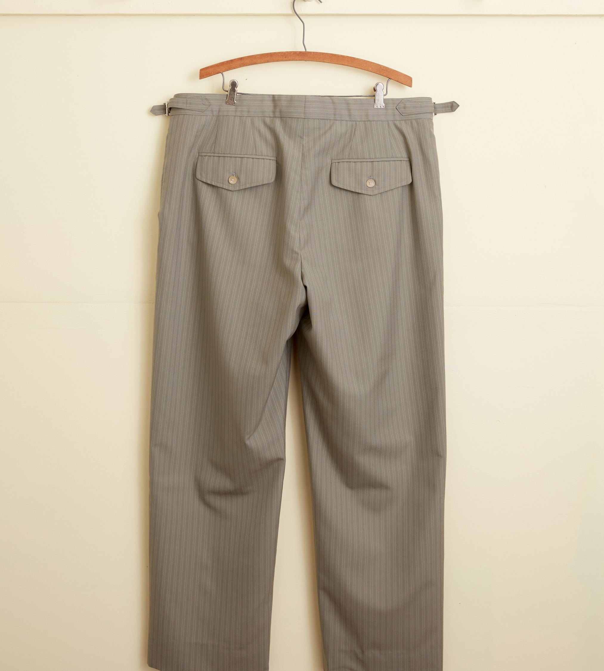 These trousers are made from deadstock wool sourced from a tailor in Buffalo, NY, who closed his doors in the 1970s. He imported all of his fabrics from the UK and Italy. They had been sitting in his storage unit until we purchased them sixty years later.