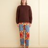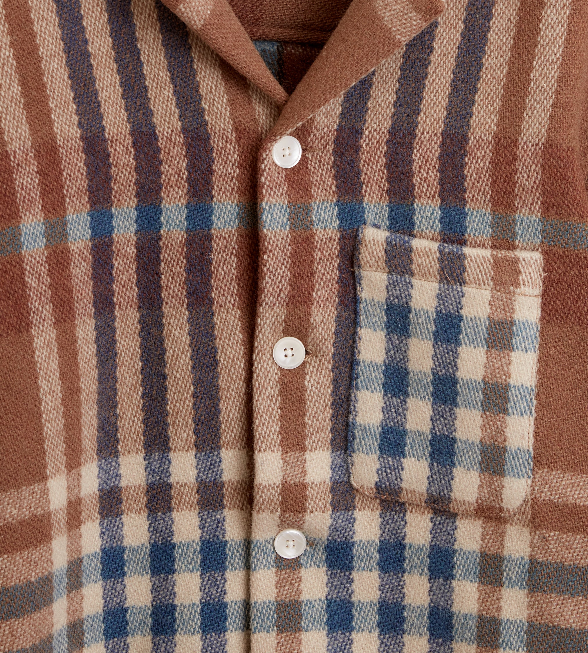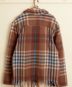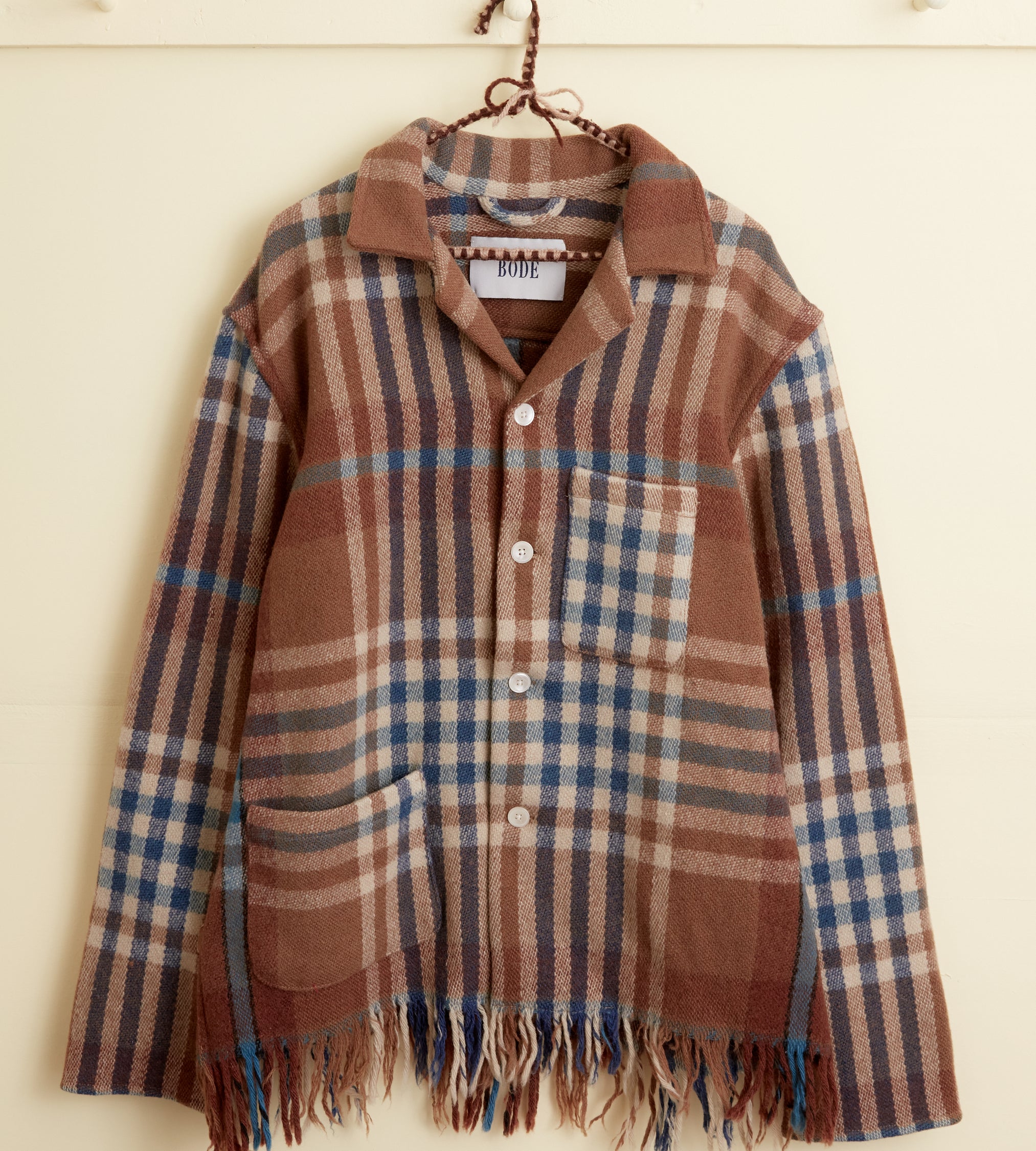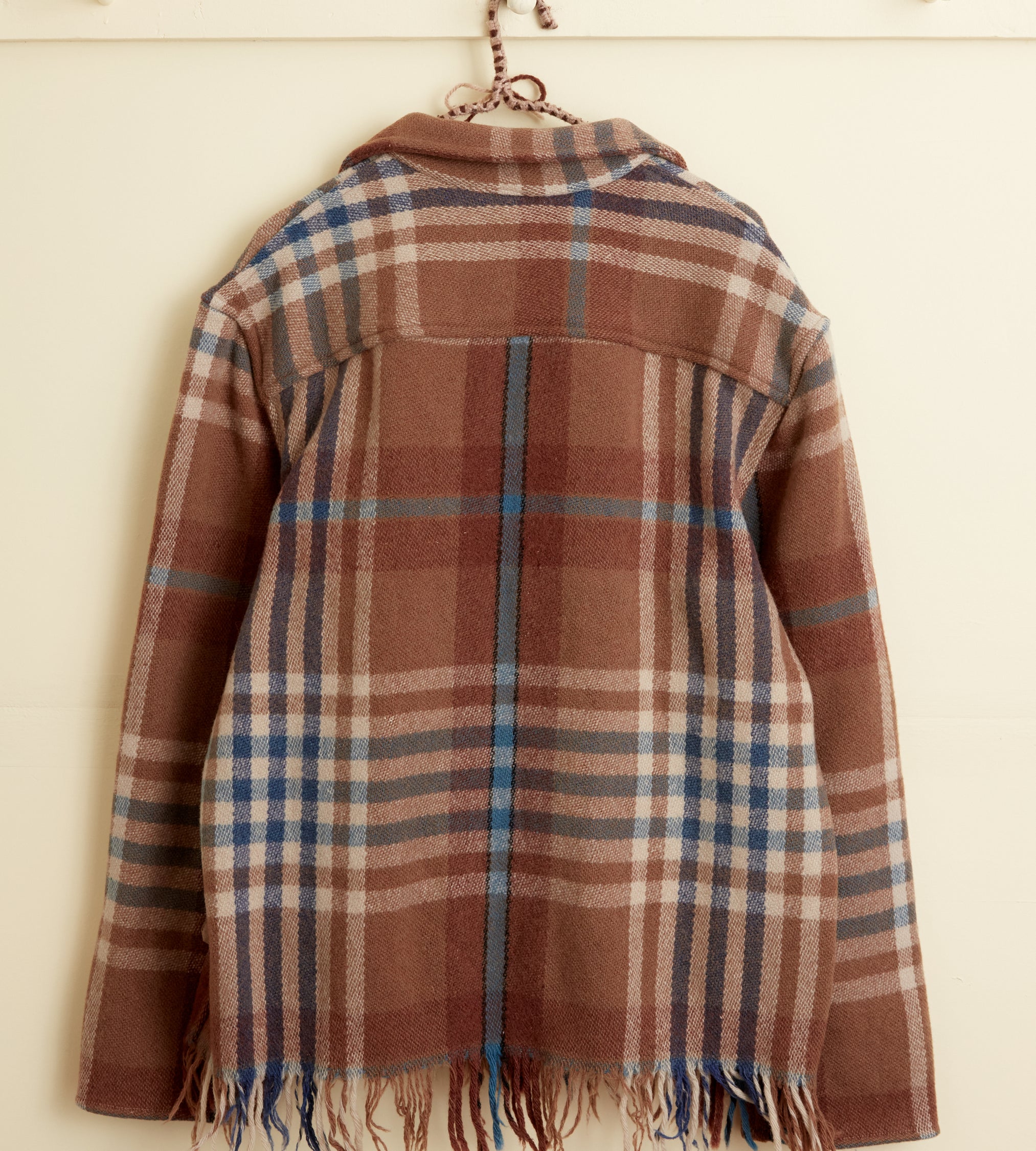 This jacket is made from a wool blanket from the 1950s-1960s, woven in a blue and brown plaid. We preserved the original fringe along the hem. Hand-mending throughout.