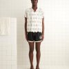 This style is inspired by an antique shirt, c.1920s-1930s. Sailor collars like this one were common throughout early sportswear. We reproduced the original piece, with its sailor collar and front welt pocket, in natural-toned cotton with green accents. The collar is trimmed with woven white trim and embroidered clover.