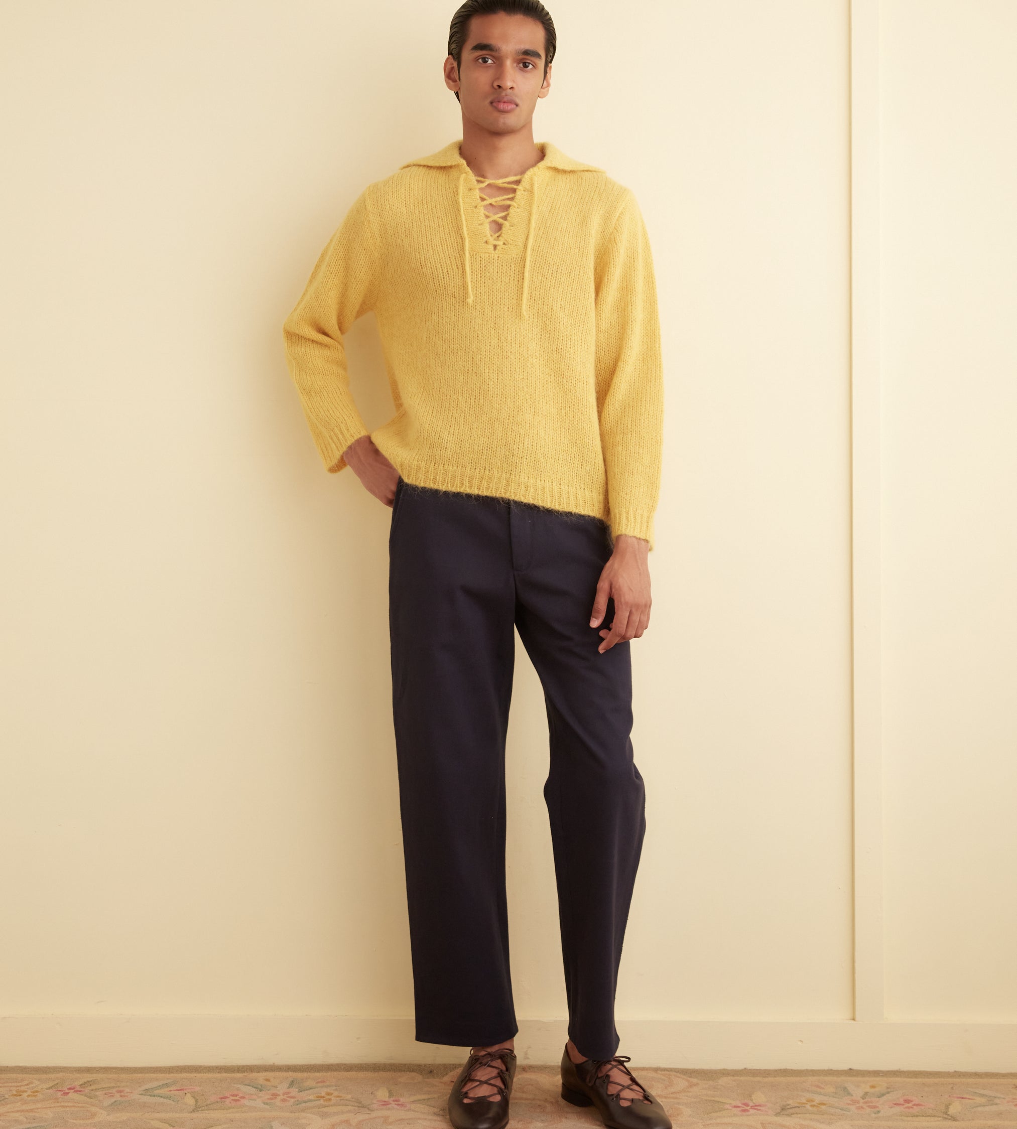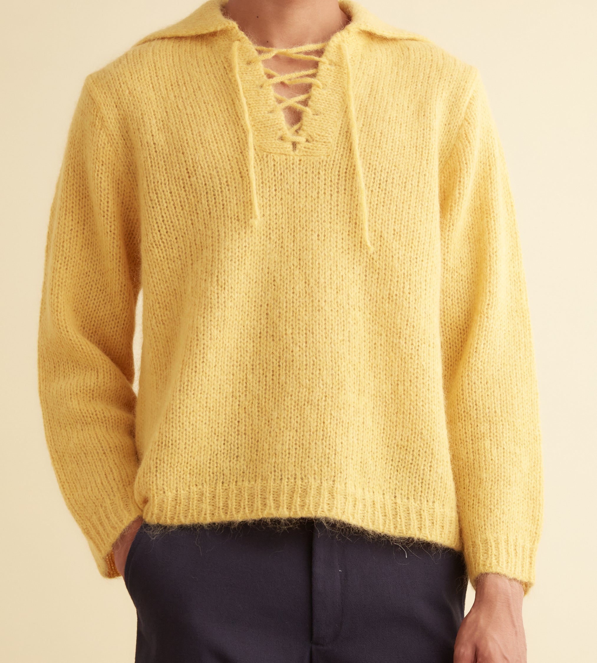 This pullover is inspired by a vintage sweater from the 1970s, which featured this lace-up neckline. We reproduced the original sweater for this style.