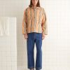 This shirt is inspired by a men’s shirt from the 1960s-1980s. We reproduced the fabric, a blue, black, and yellow stripe, for this style.