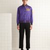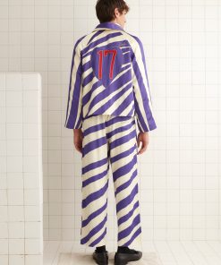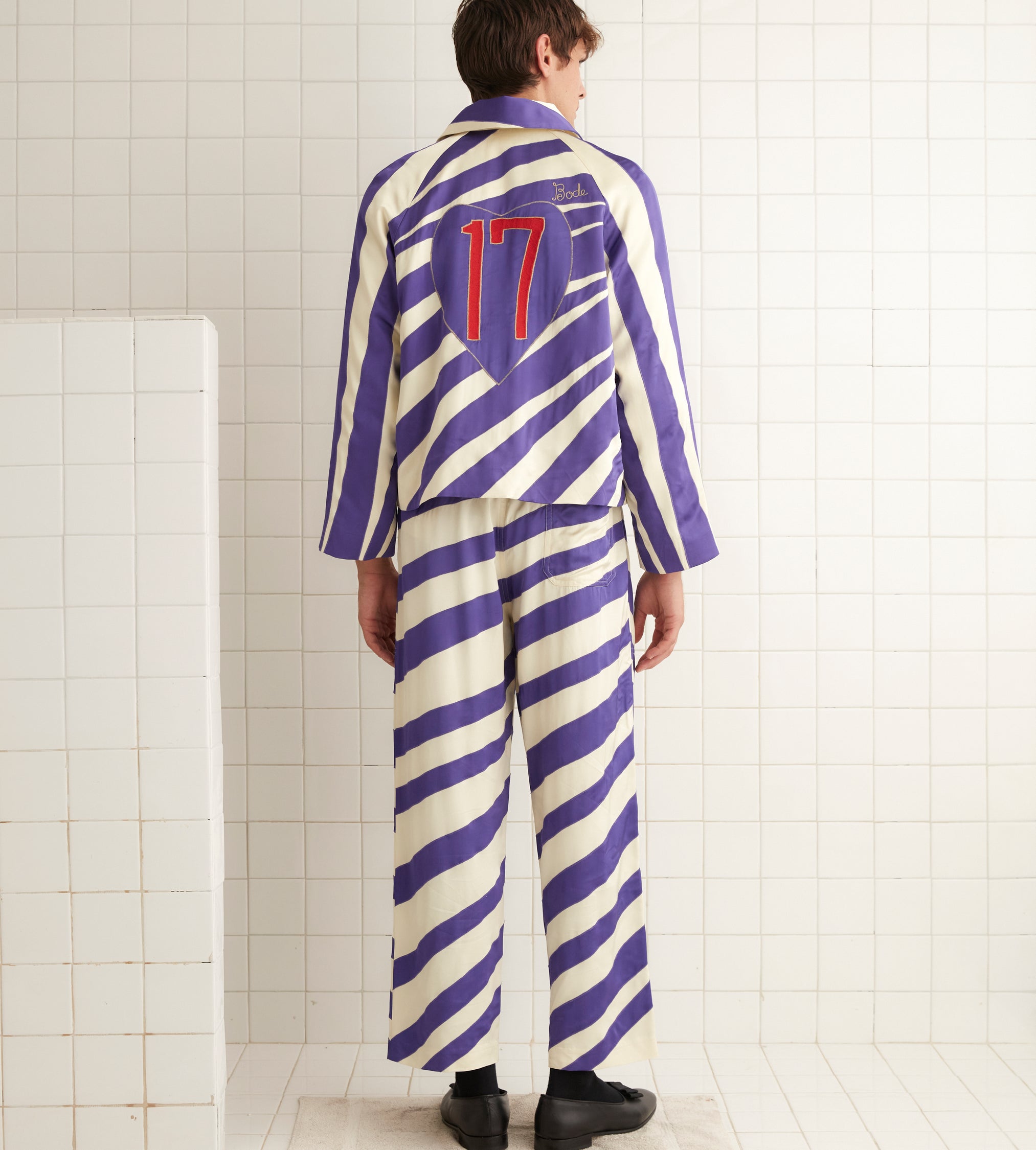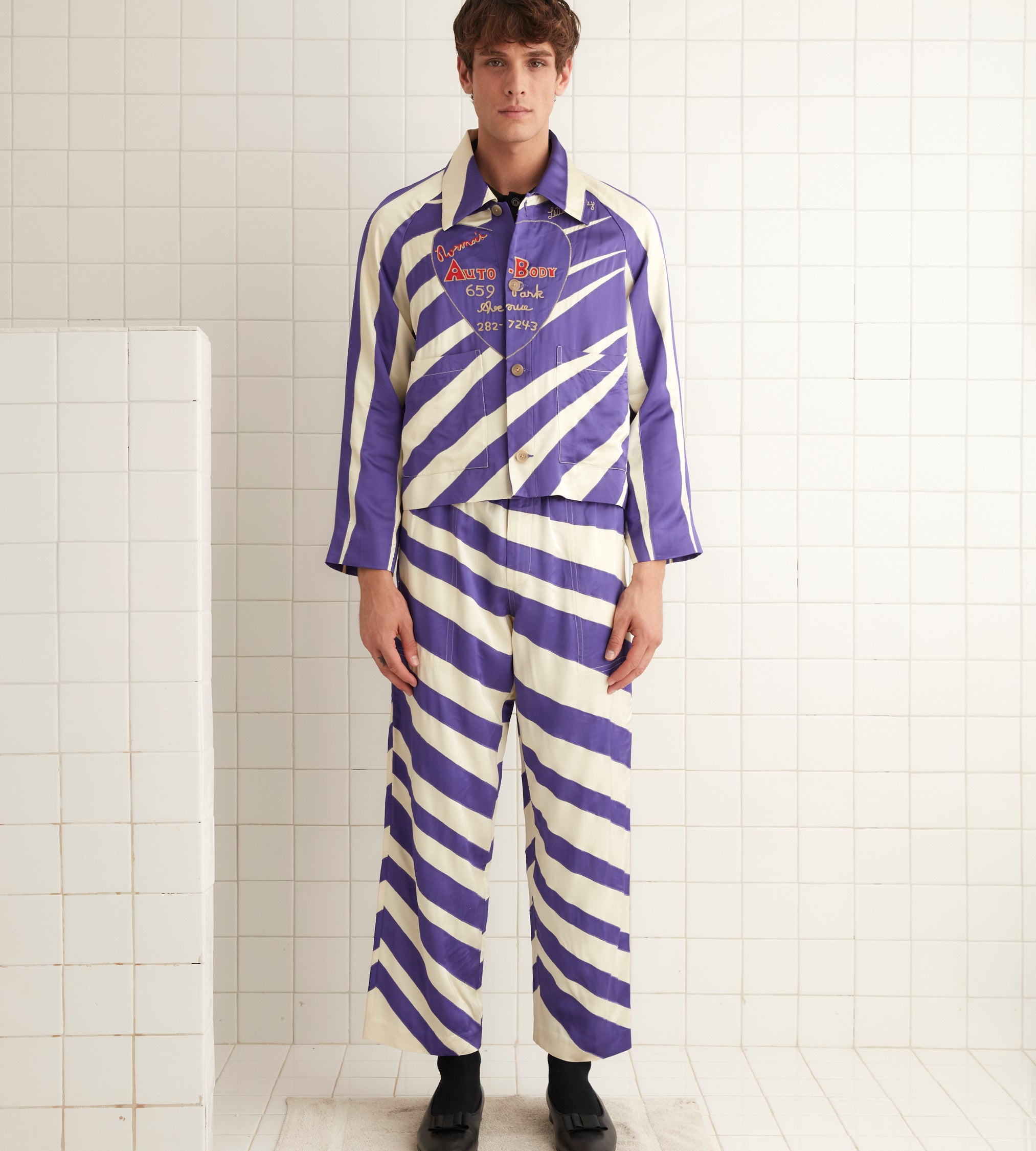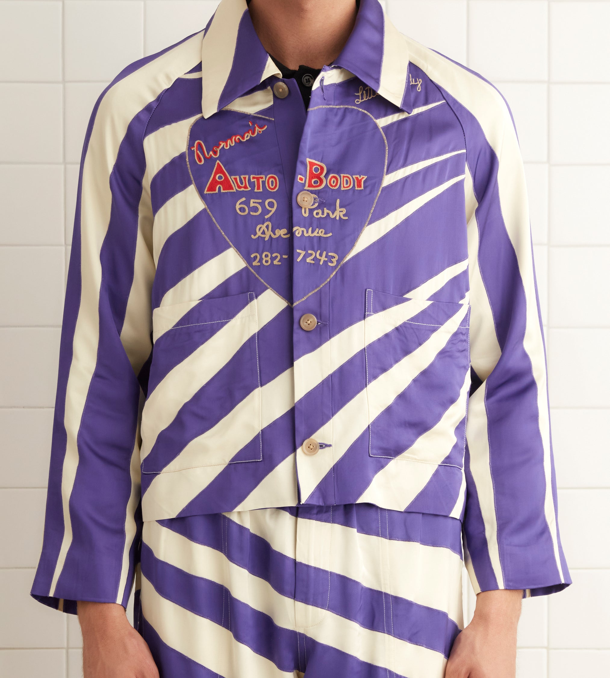 This jacket is a historical reproduction of an auto shop jacket from the 1940s-1950s. It has irregular purple and ivory stripes and features chain-stitch embroidery reading “Norma’s Auto Body” on the front heart appliqué, with a “Little Buddy” nickname embroidered on the chest. The back has a number 17 and a small Bode logo.