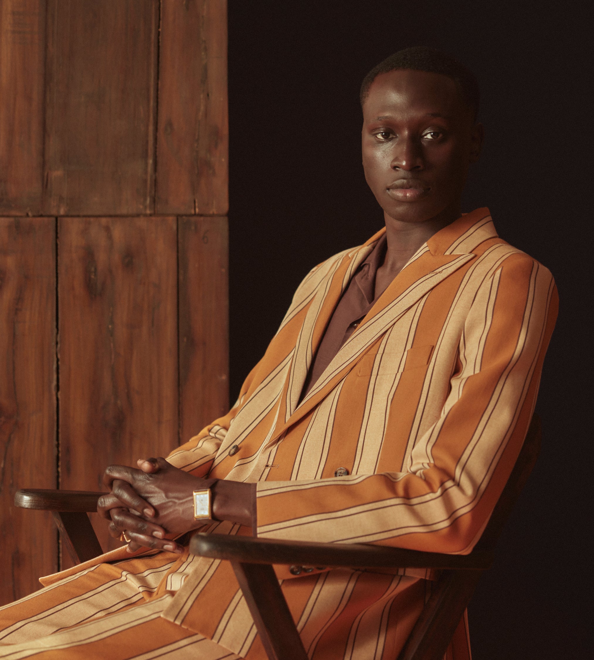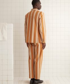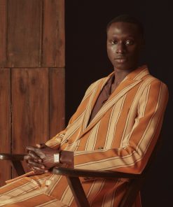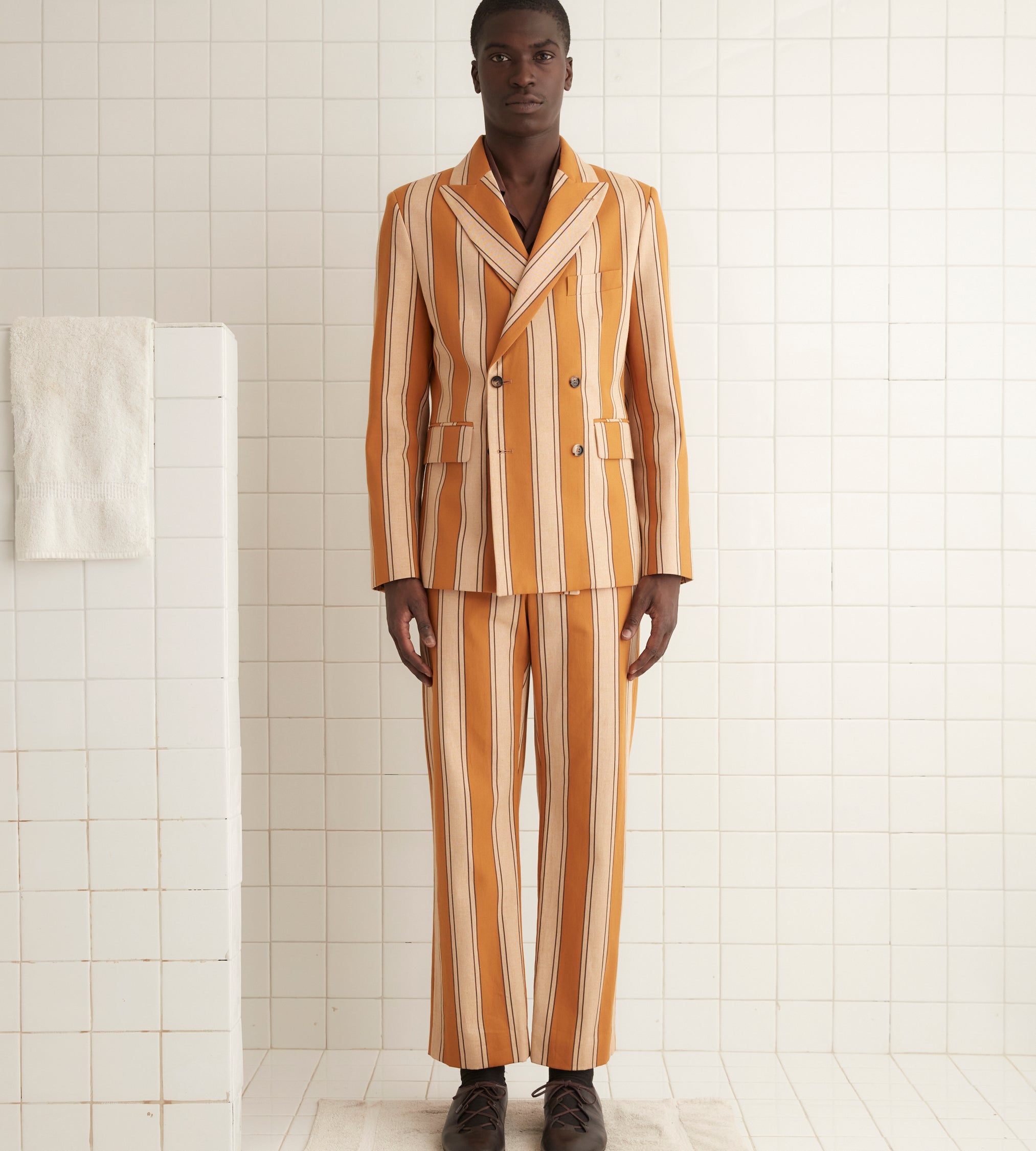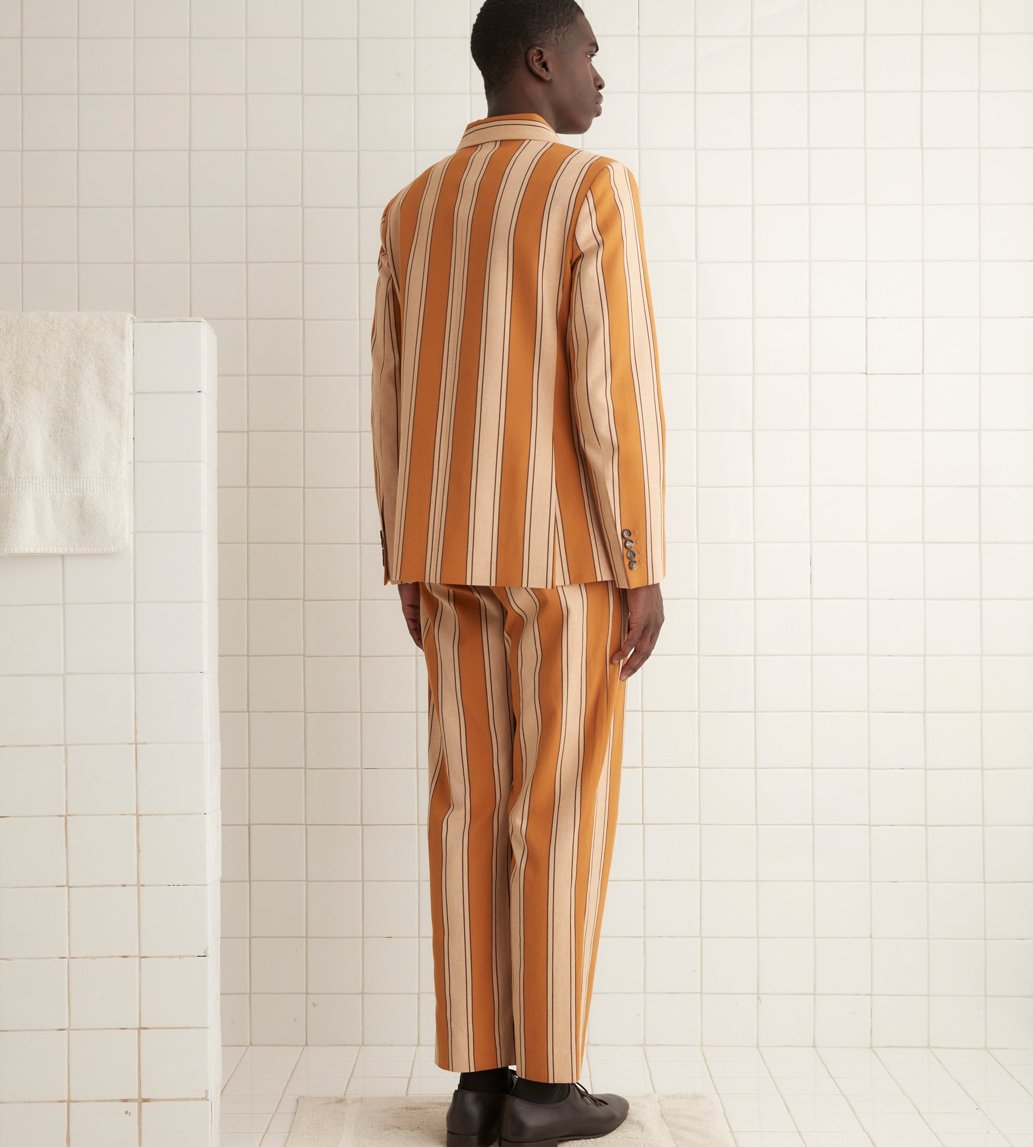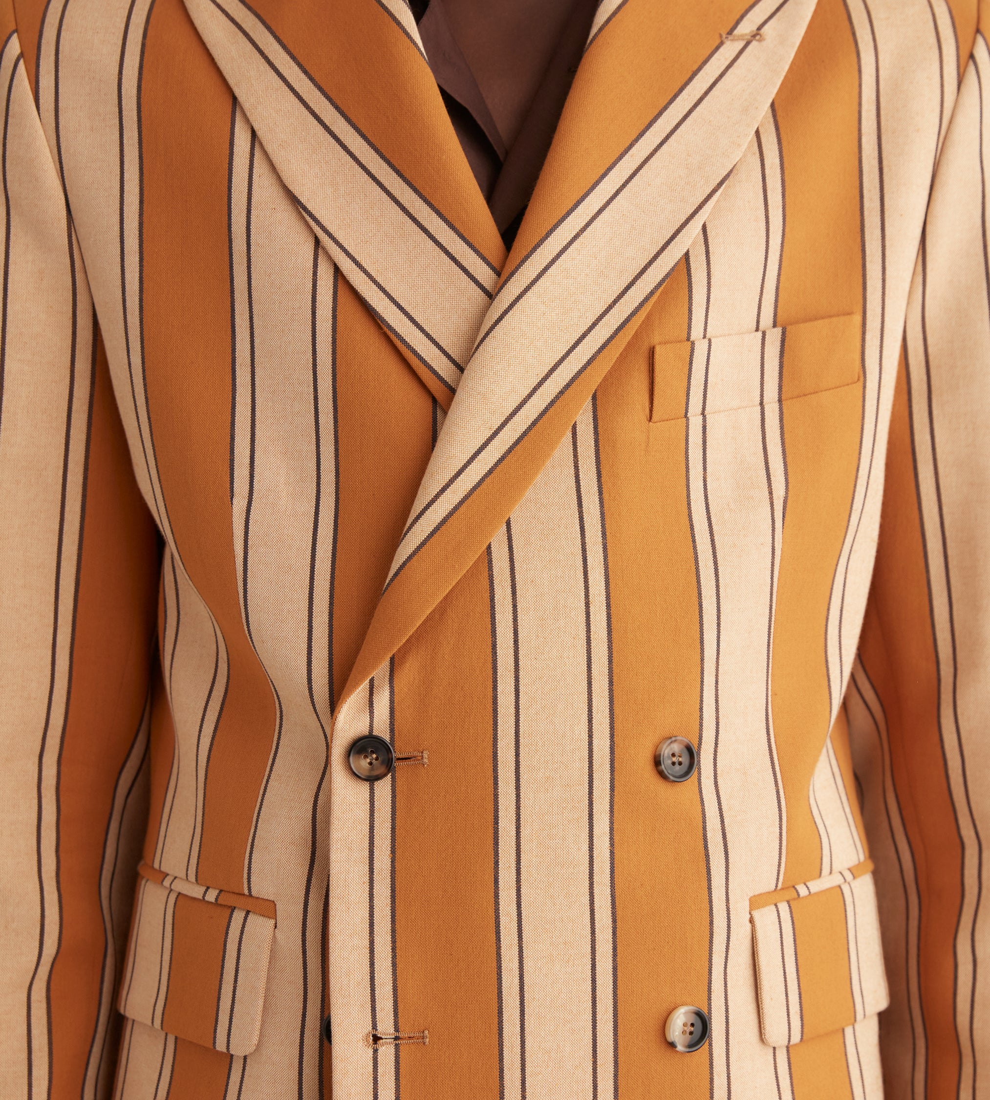 This jacket is inspired by men’s suiting from the 1950s-1960s. It is made with bronze and black striped fabric recreated from midcentury yardage.