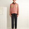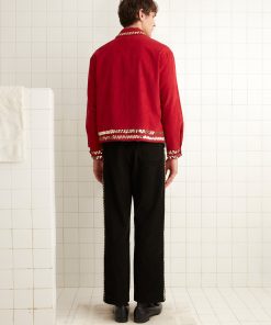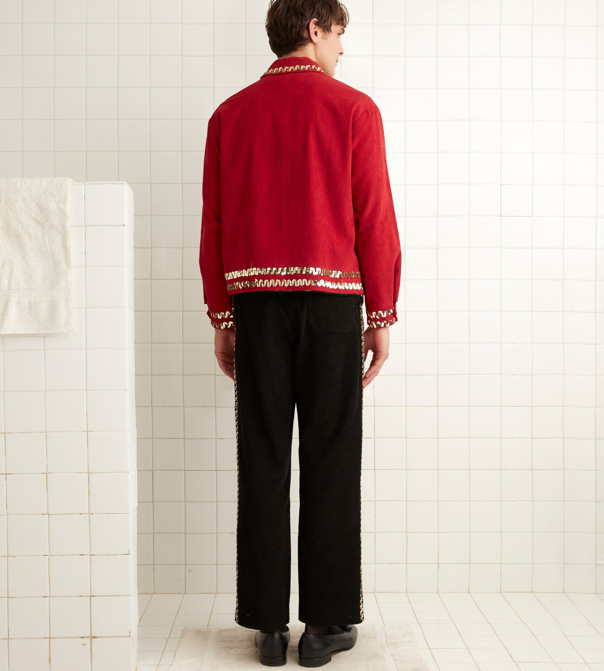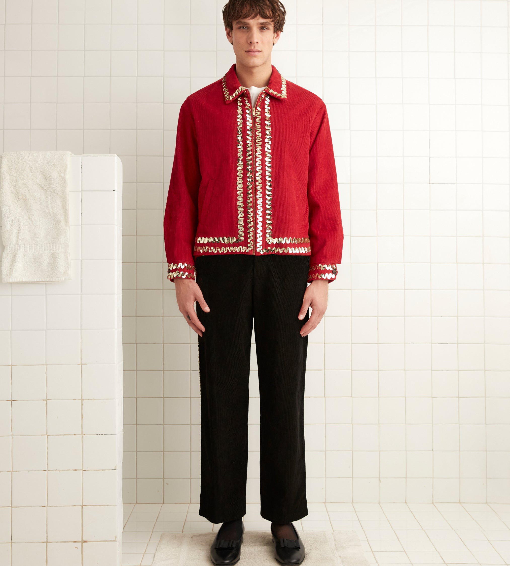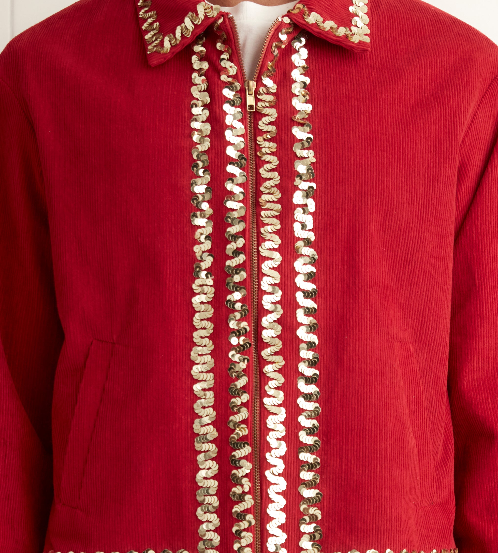 This jacket is inspired by a twirler’s uniform from a marching band, circa 1960s. We reproduced the rippling gold sequin trim along the collar, hem, and placket. The jacket is made of corduroy and cut in a classic workwear silhouette.