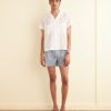 This jacket is inspired by a twirler’s uniform from a marching band, circa 1960s. We reproduced the rippling gold sequin trim along the collar, hem, and placket. The jacket is made of corduroy and cut in a classic workwear silhouette.