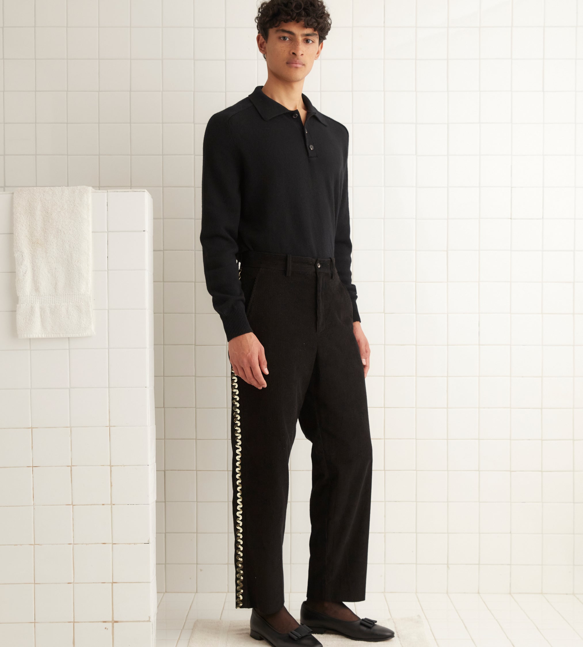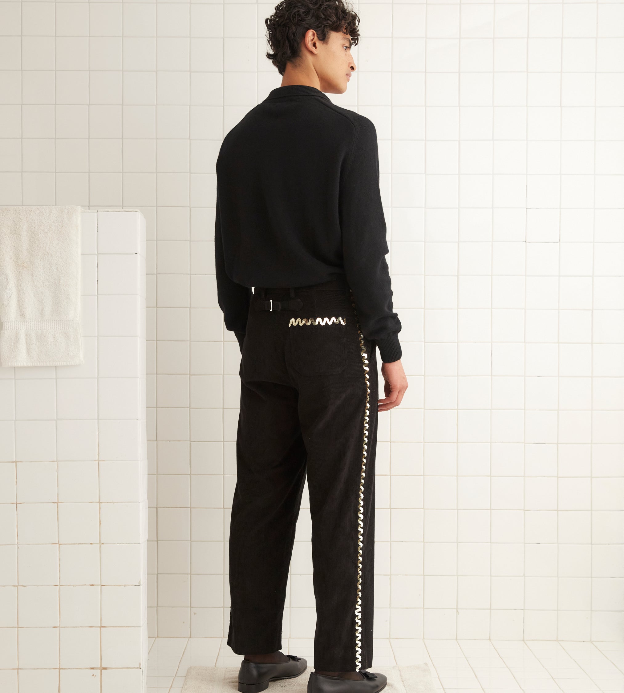 These trousers are inspired by a twirler’s uniform from a marching band, circa 1960s. We reproduced the rippling gold sequin trim along the side seam and back pocket. The trousers are made of black corduroy and have a high rise and a straight leg.