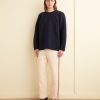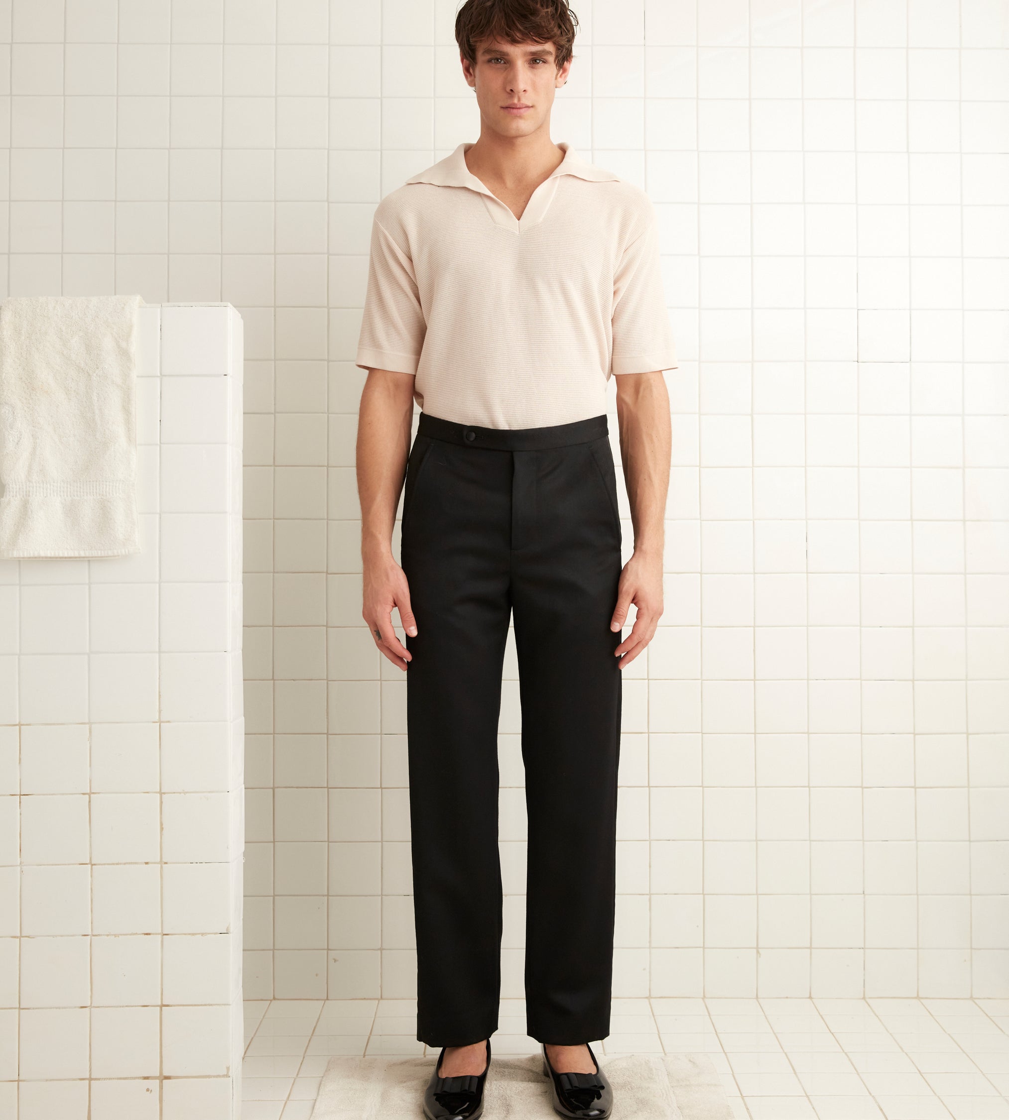 These trousers are inspired by men’s suit pants from the 1950s-1960s. We reproduced the silhouette for this style. The trousers have a satin tuxedo stripe and satin-covered buttons.