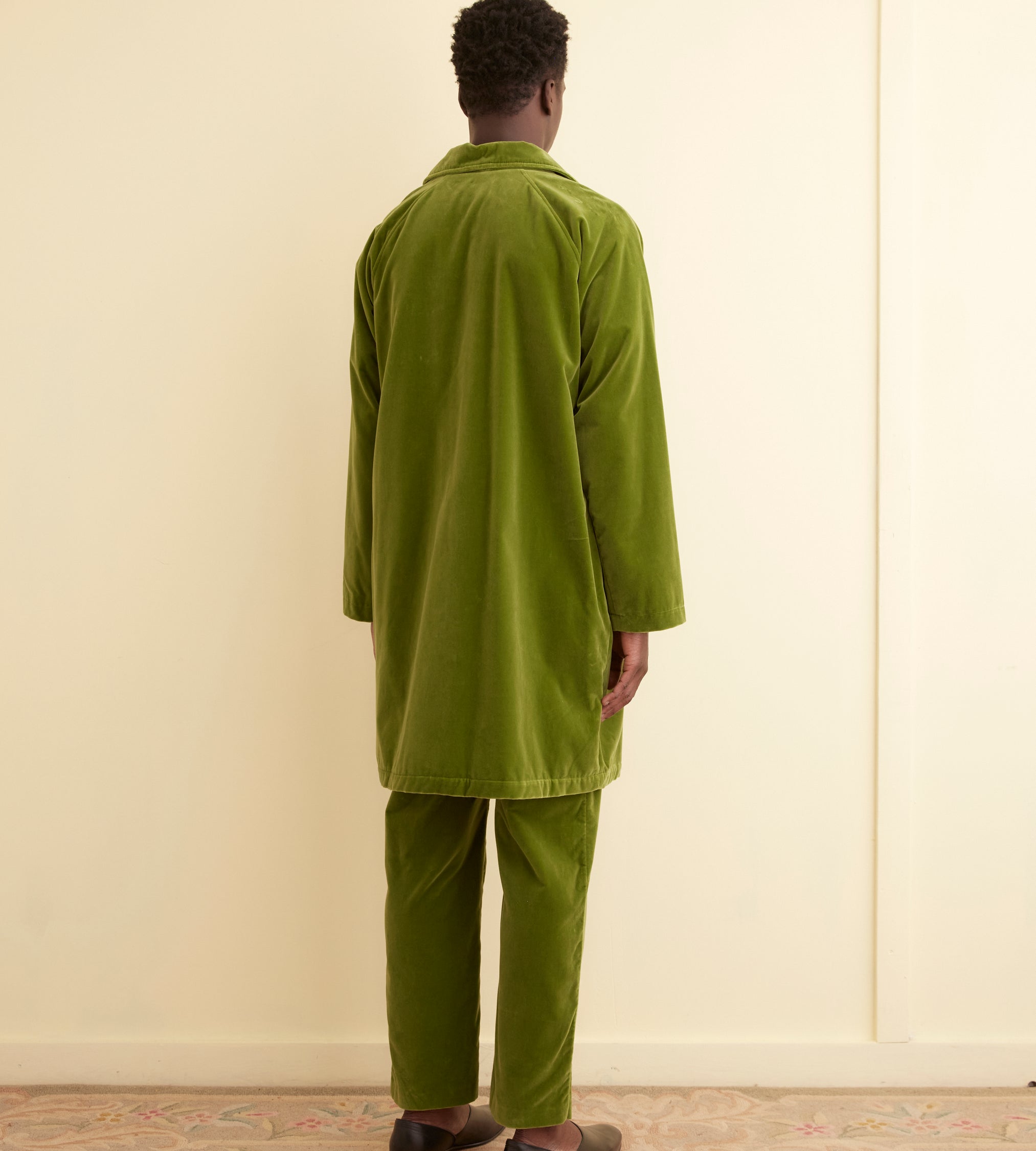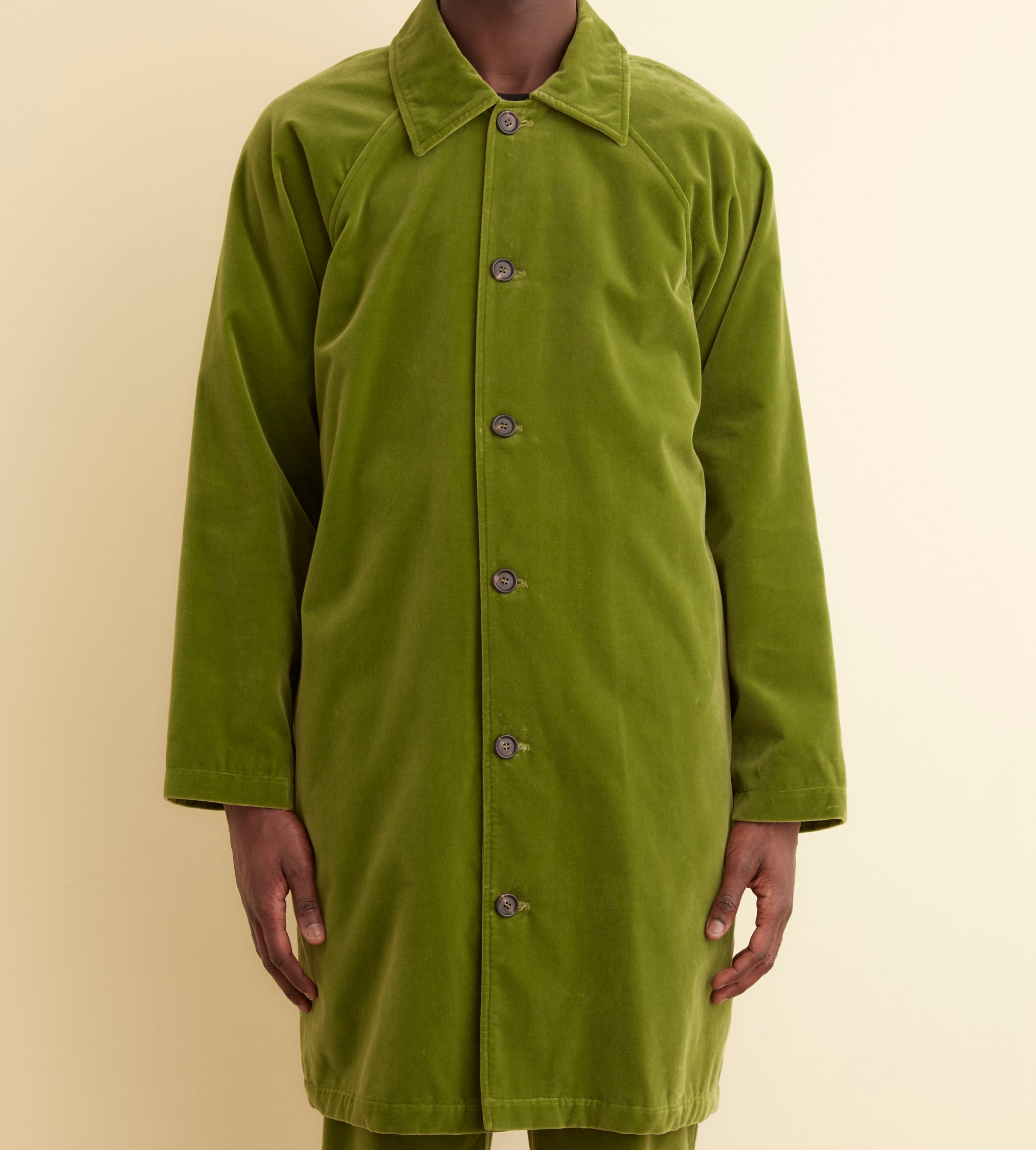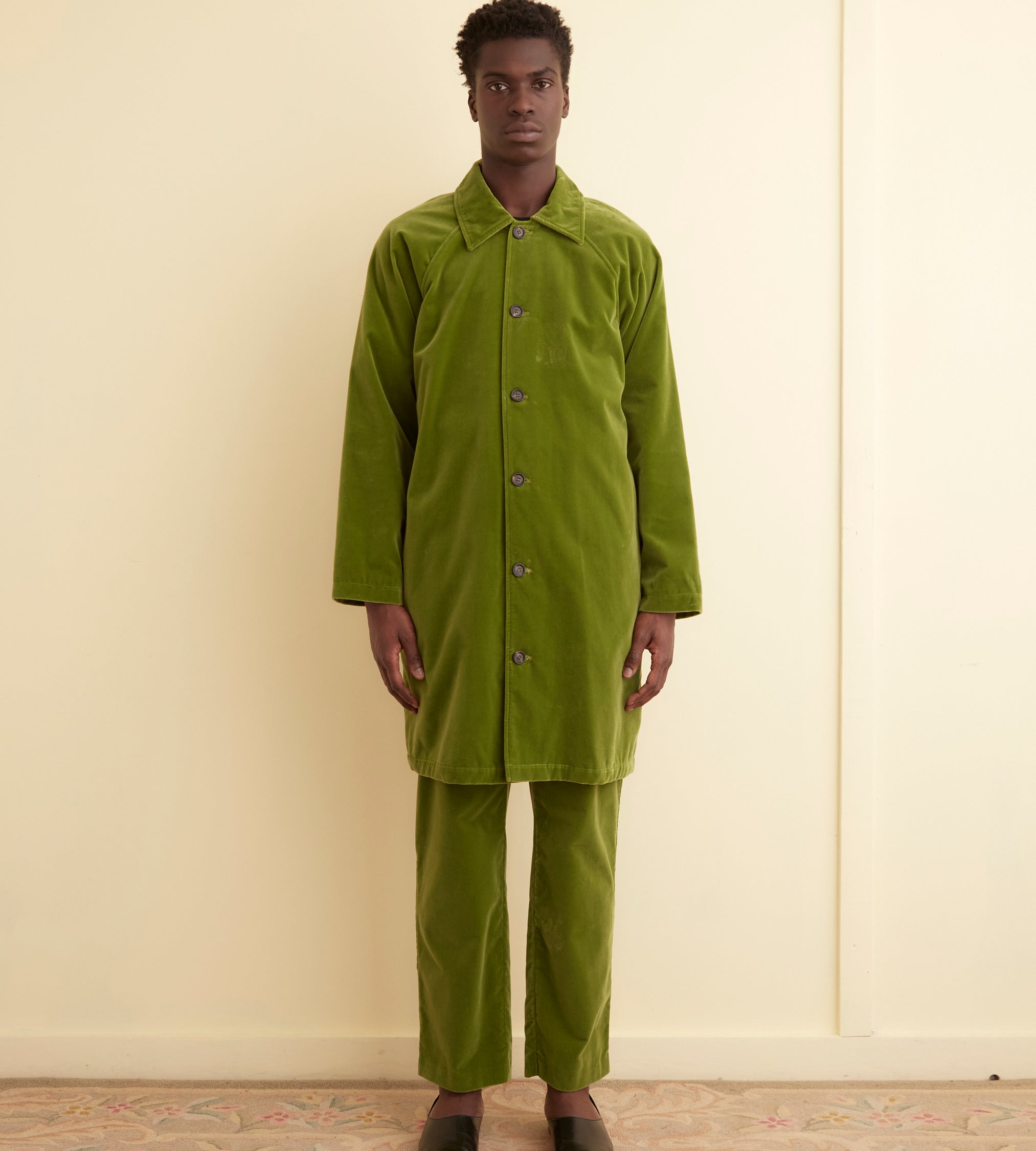 This coat is inspired by a midcentury French workwear jacket. We reproduced the silhouette in apple-green velvet.