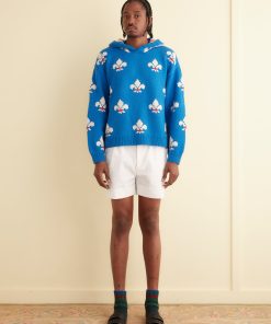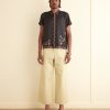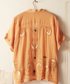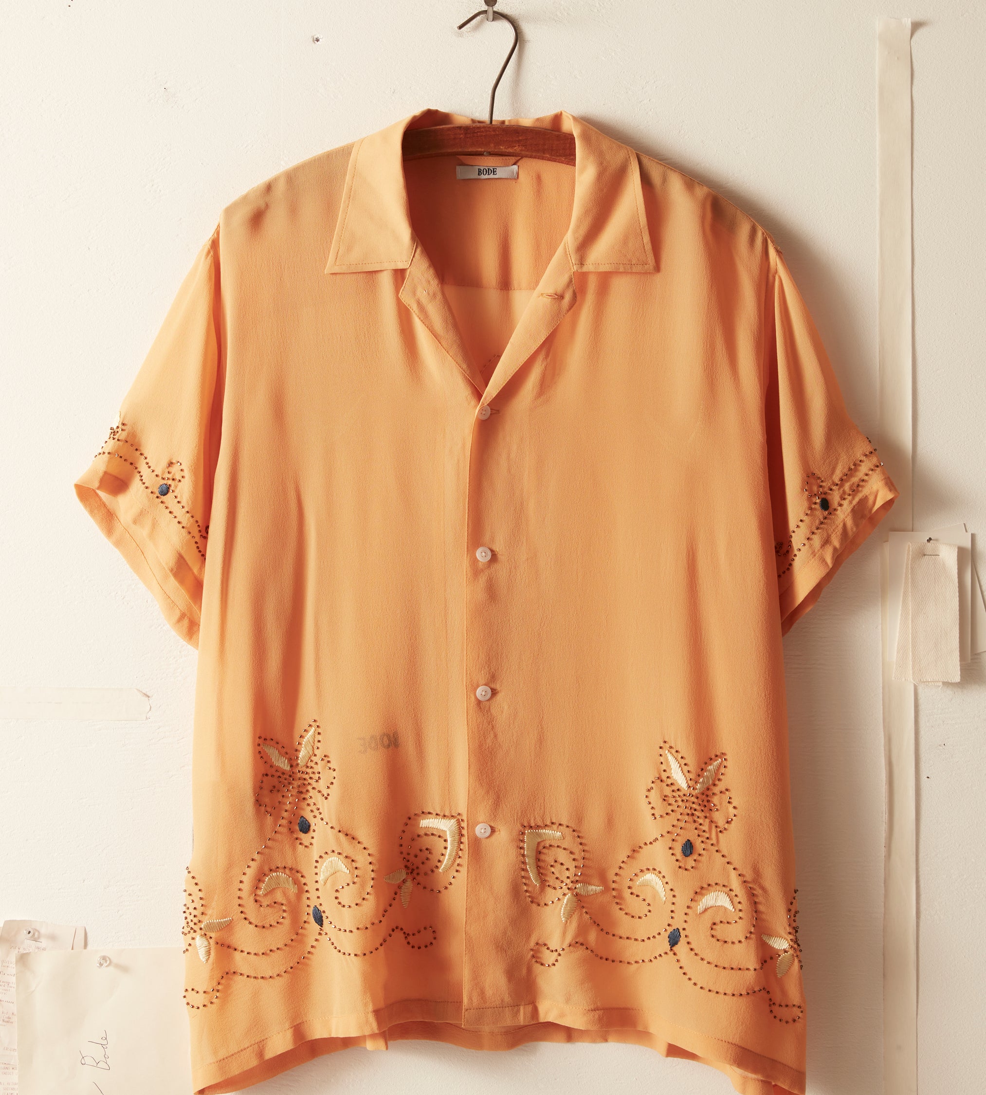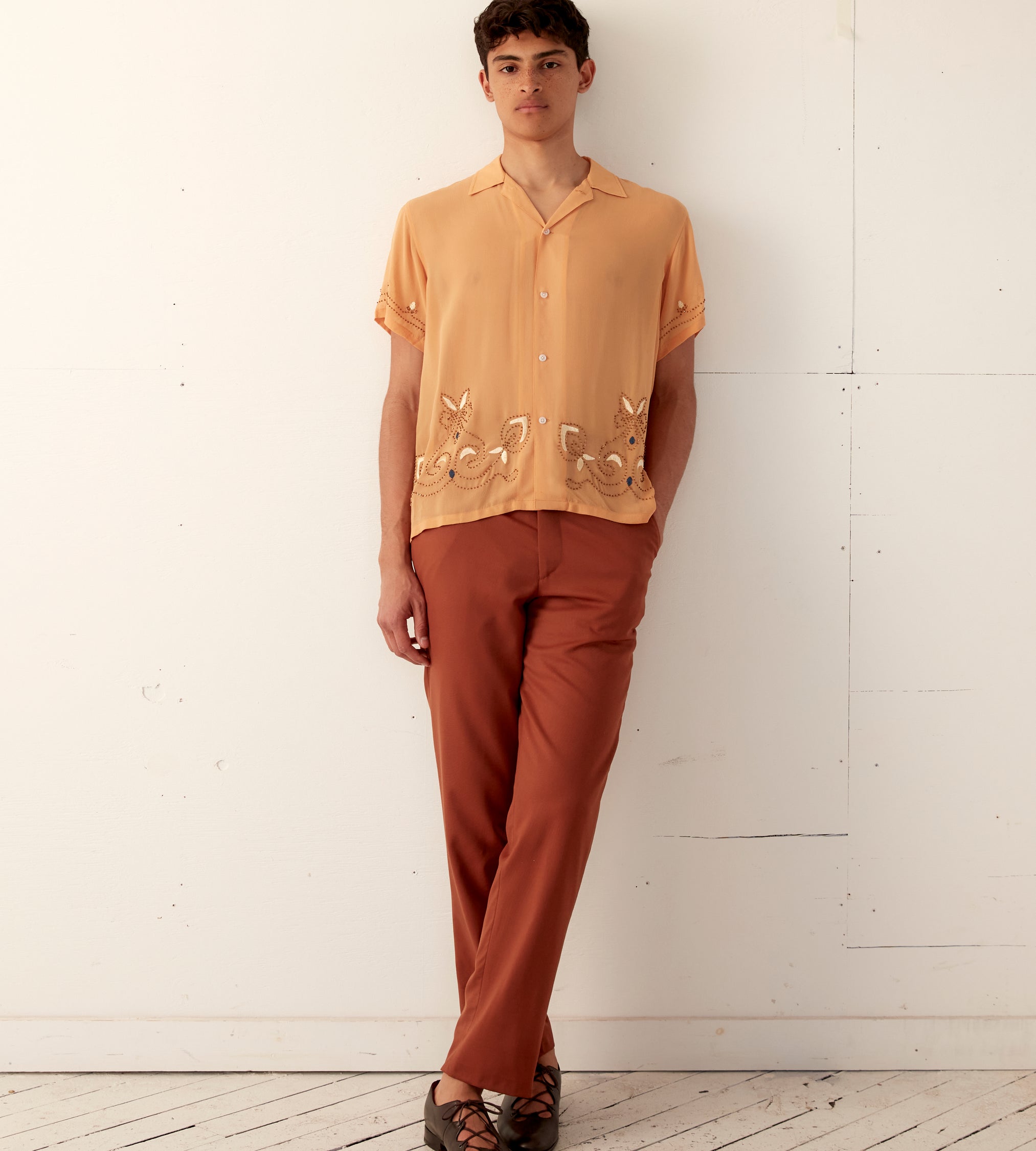 This short-sleeved shirt is inspired by a 1920s-1930s women’s blouse. Made of silk georgette, a fabric engineered in the early twentieth century by French dressmaker Georgette de la Plante, the shirt features both hand-beading and hand-embroidery.