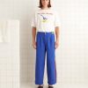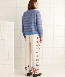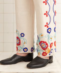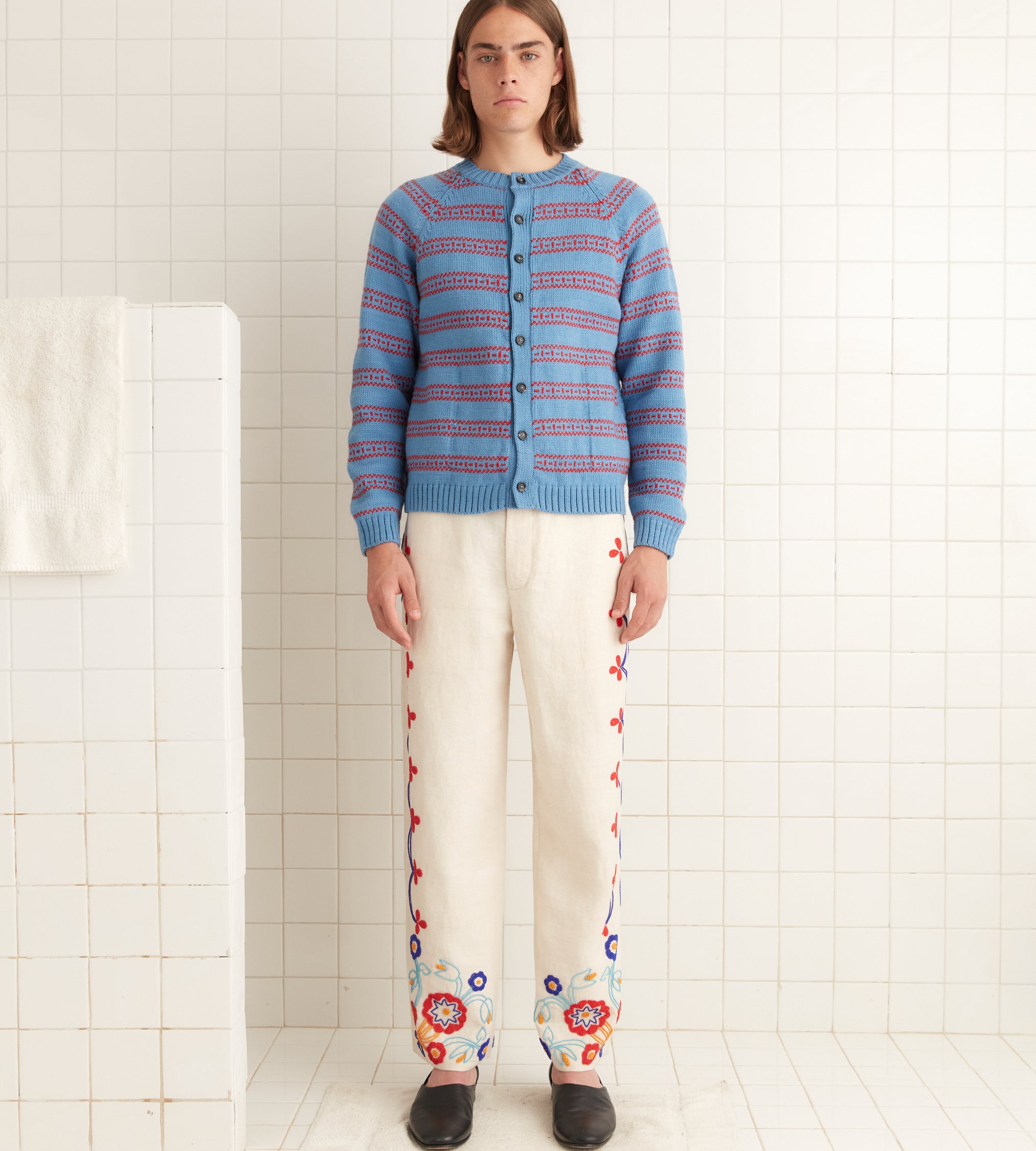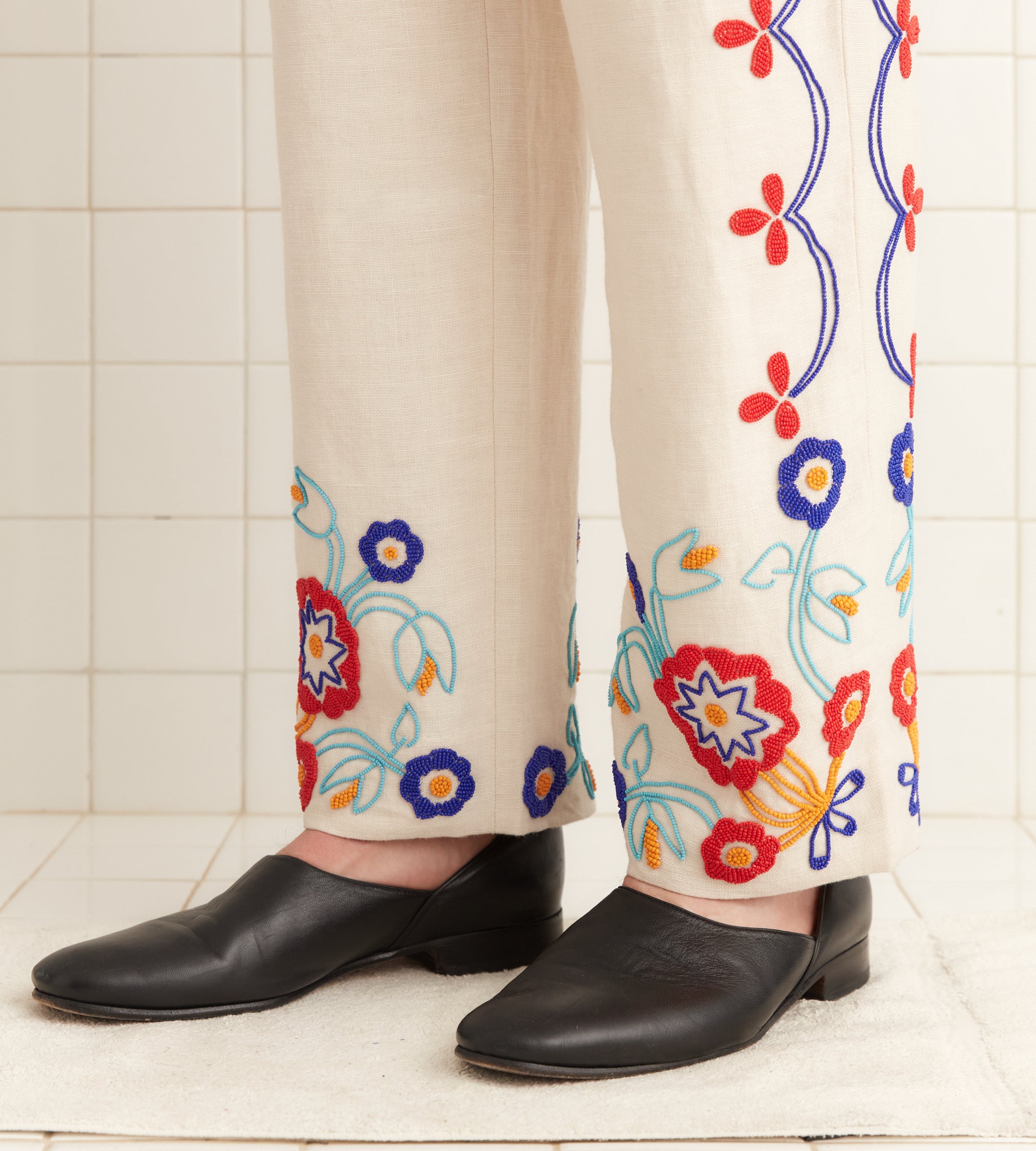 These trousers are inspired by an embroidered tablecloth from the 1950s. We reproduced the floral patterns in colorful beadwork down the side seam and around the hem. The trousers have a mid-rise and a straight leg.