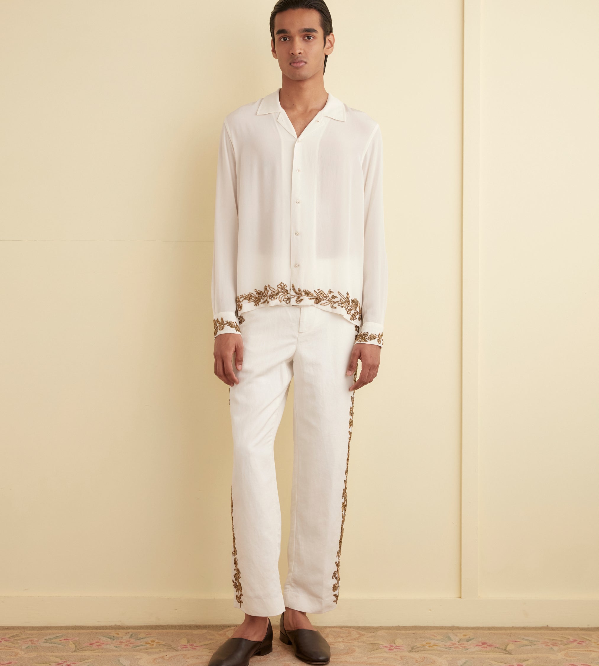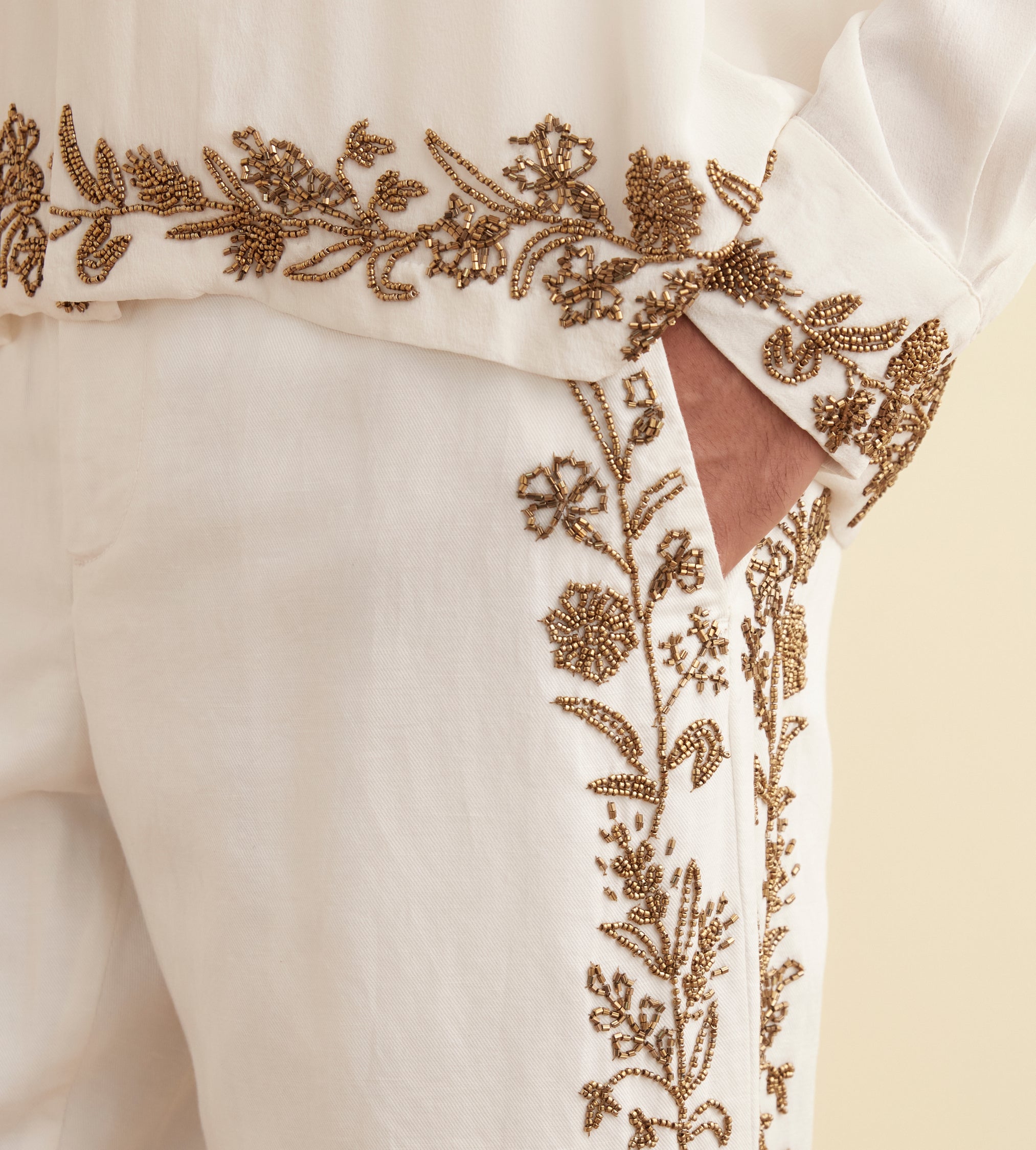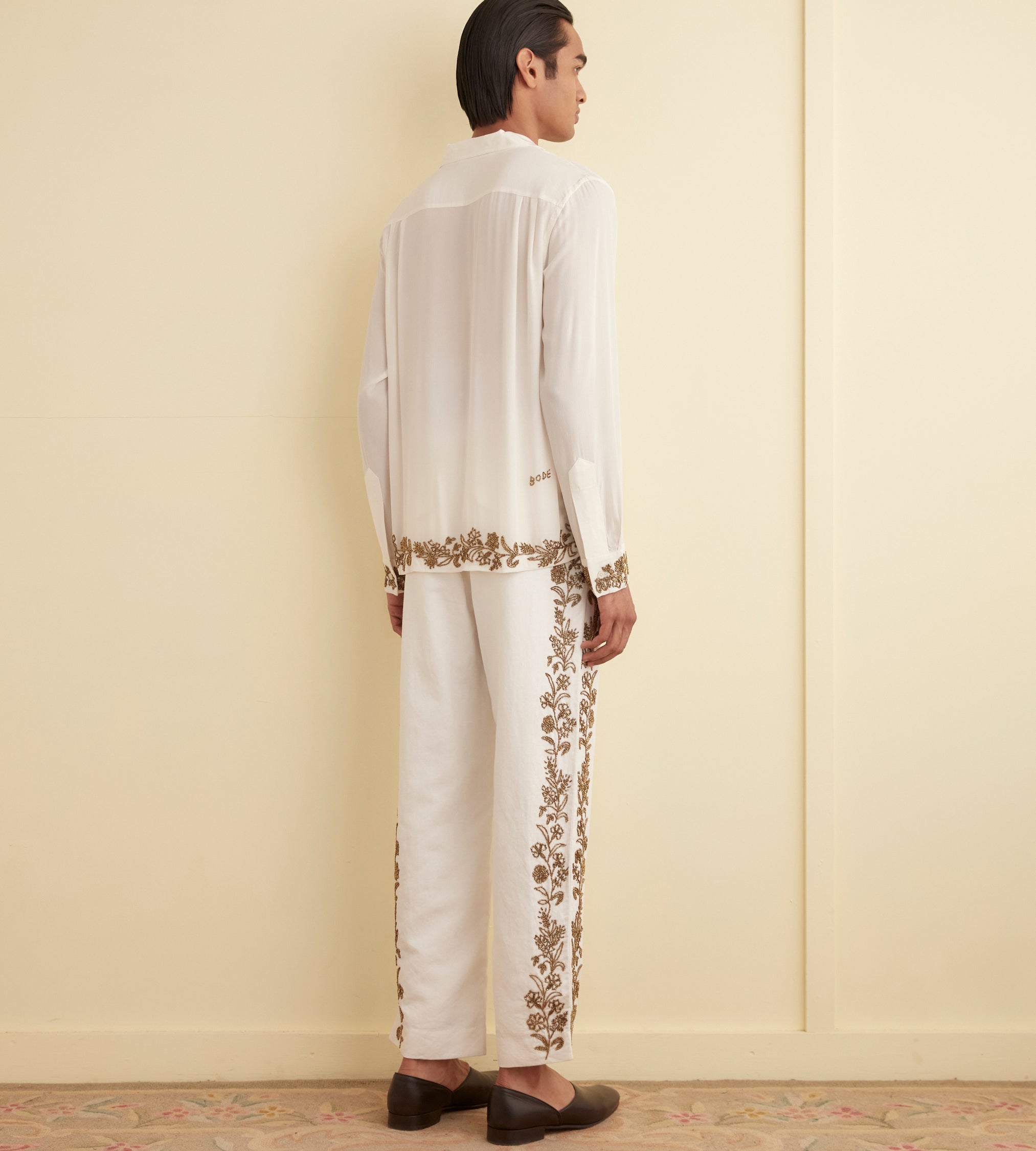 These trousers are inspired by an embroidered table runner from the 1930s-1950s. We reproduced the embroidery in bronze beadwork along the side seam. The trousers have a classic fit, with a mid rise and a straight leg.