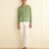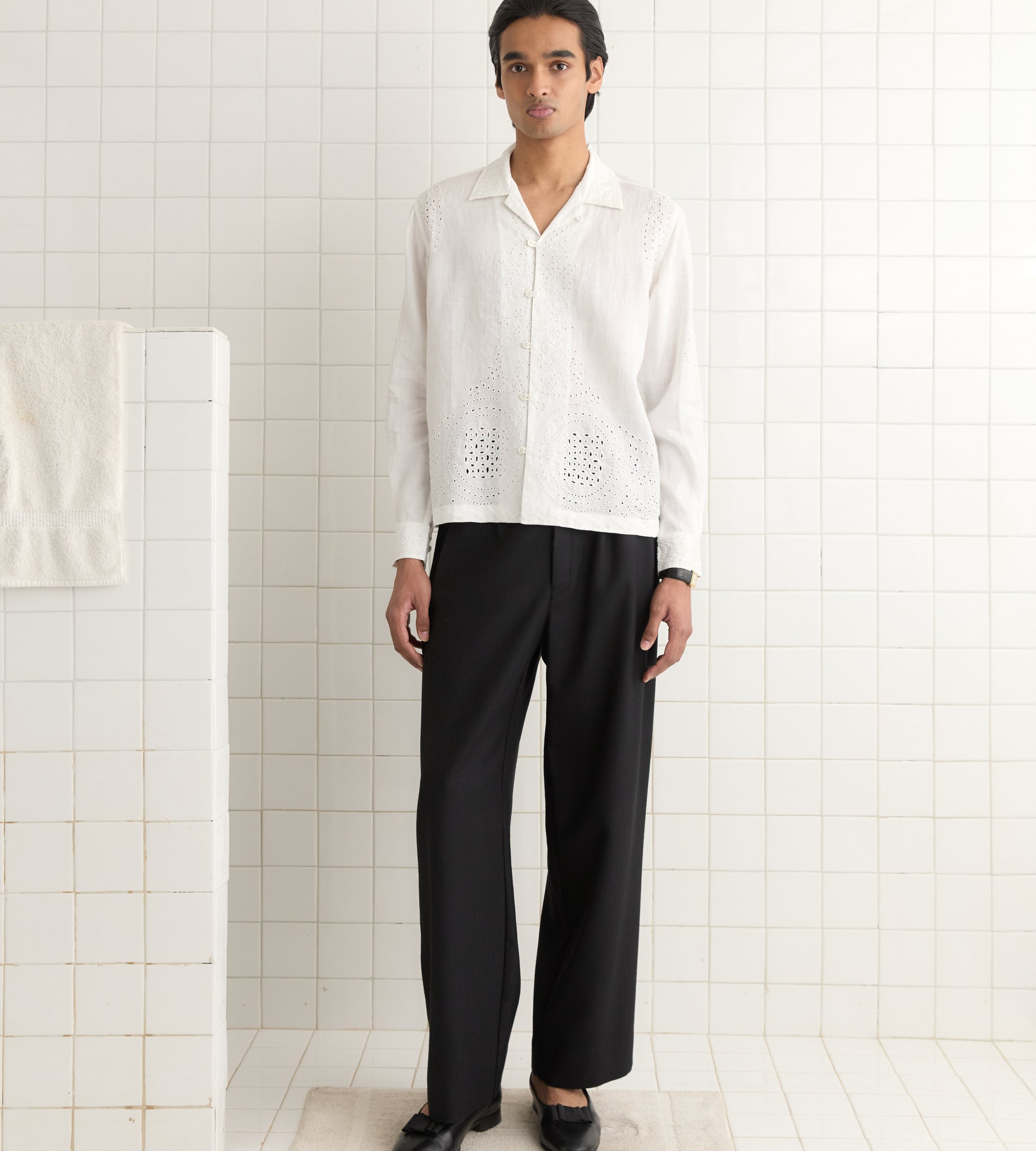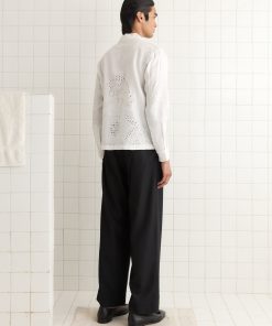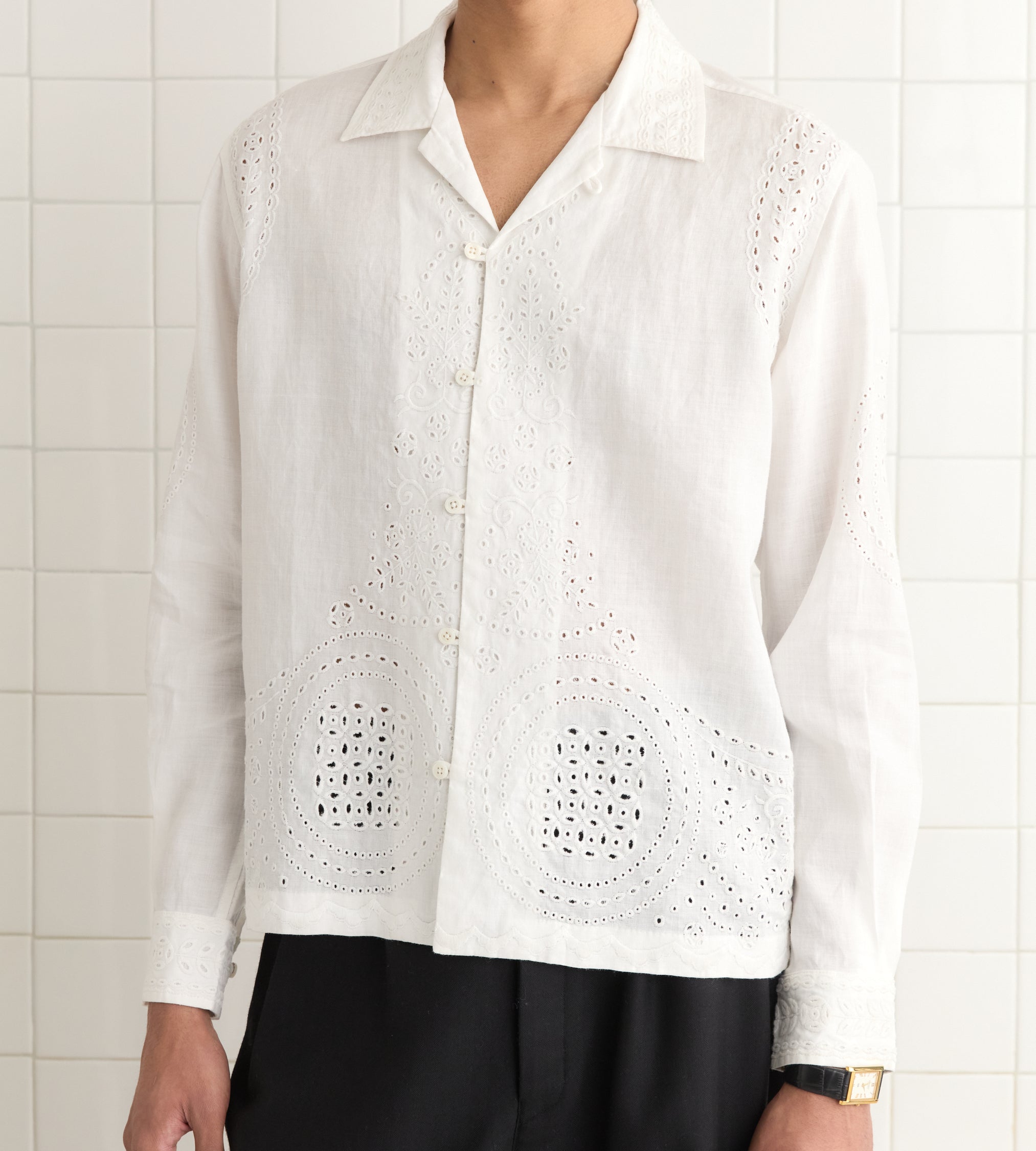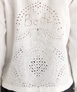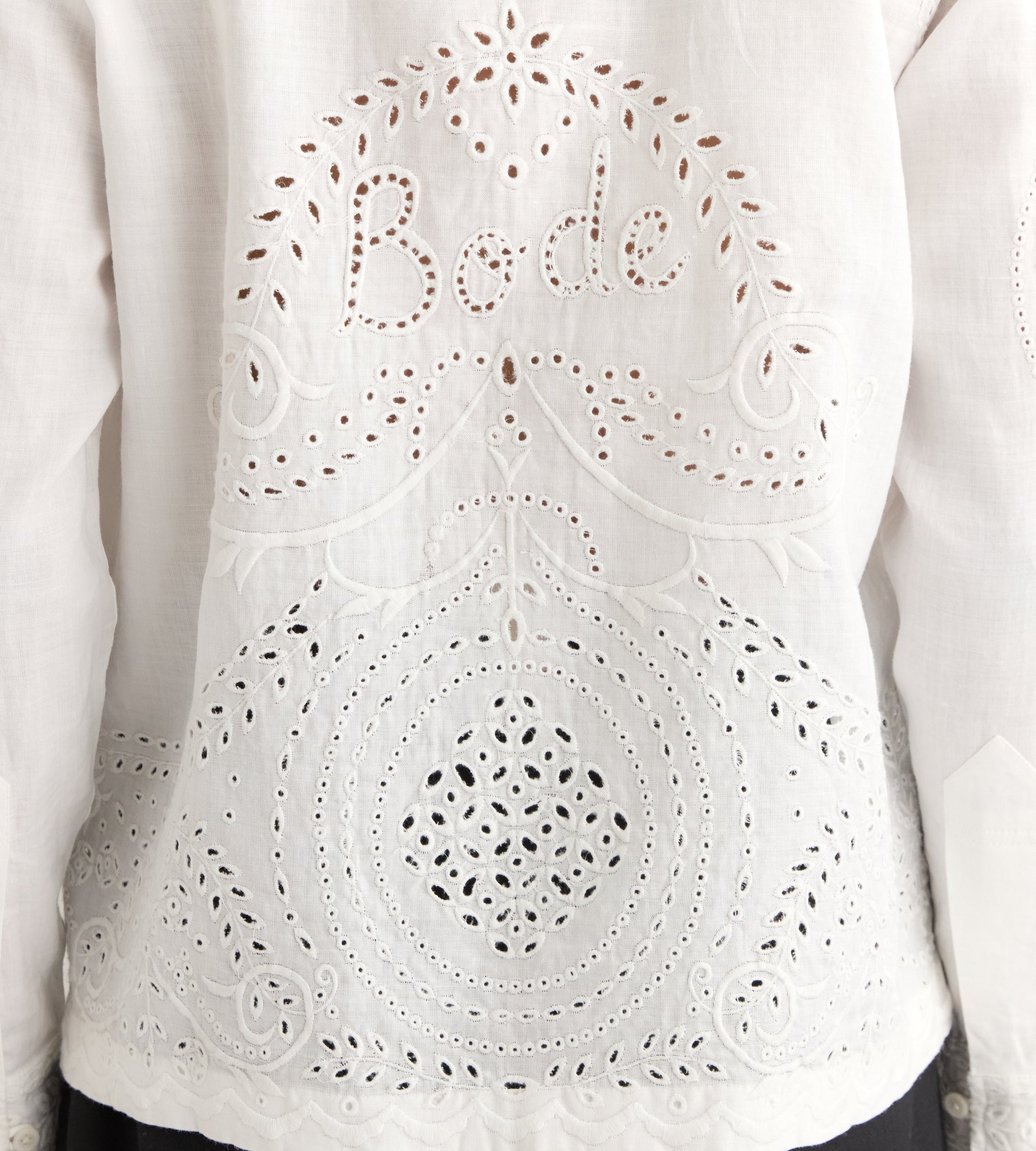 This shirt is inspired by a bed jacket from the 1890s. We reproduced the broderie anglaise lacework for this style, incorporating “Bode” into the pattern across the back.