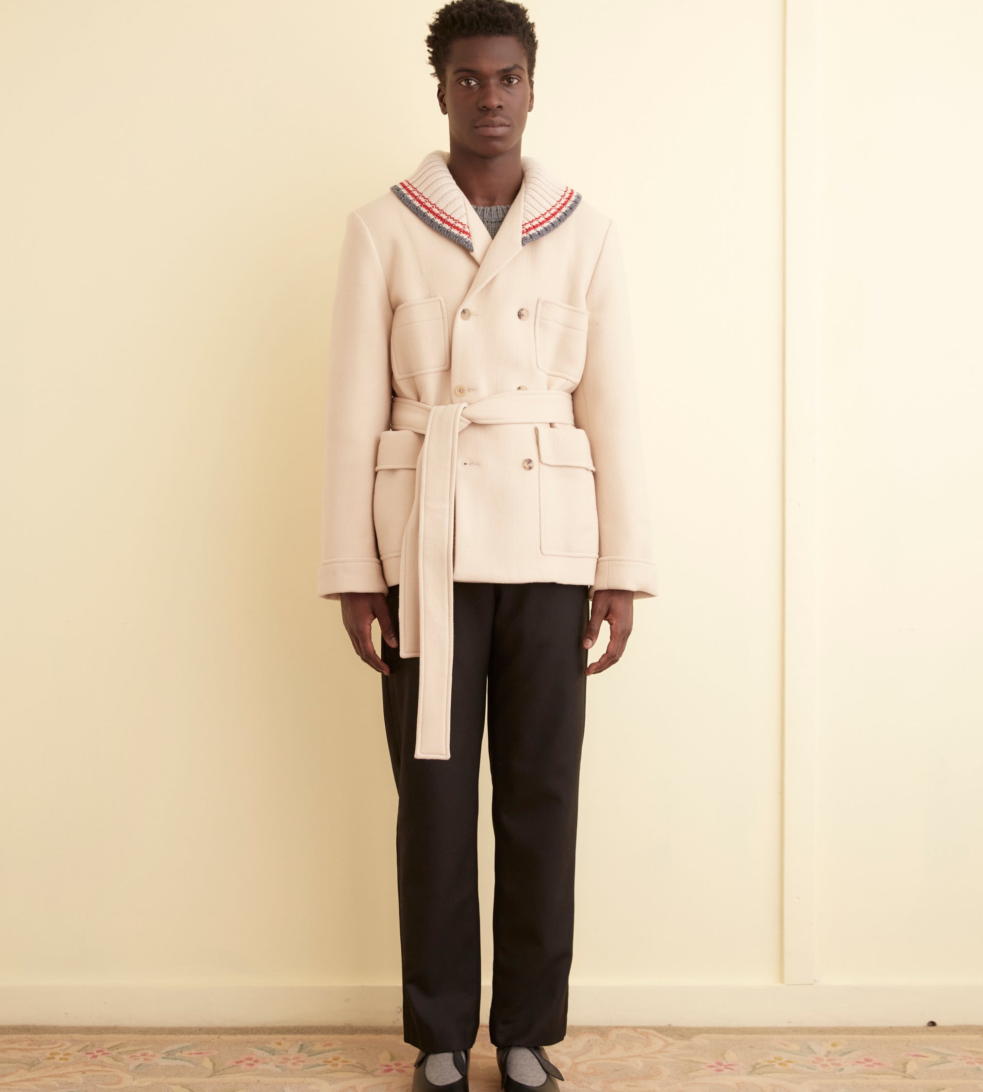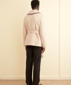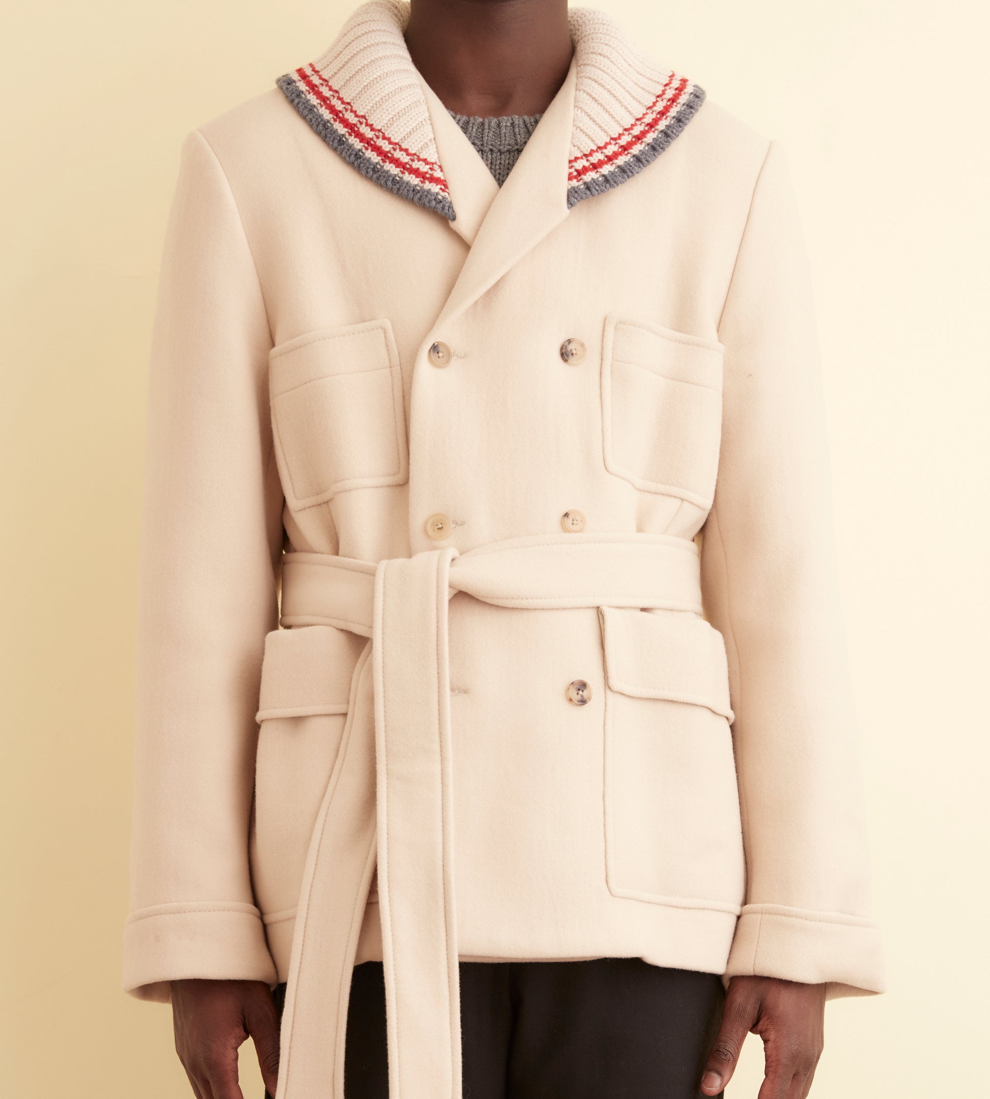 This coat is a reproduction of a knit coat from the 1940s-1950s. It has a ribbed shawl collar with red and blue stripes and a belted, double-breasted silhouette.