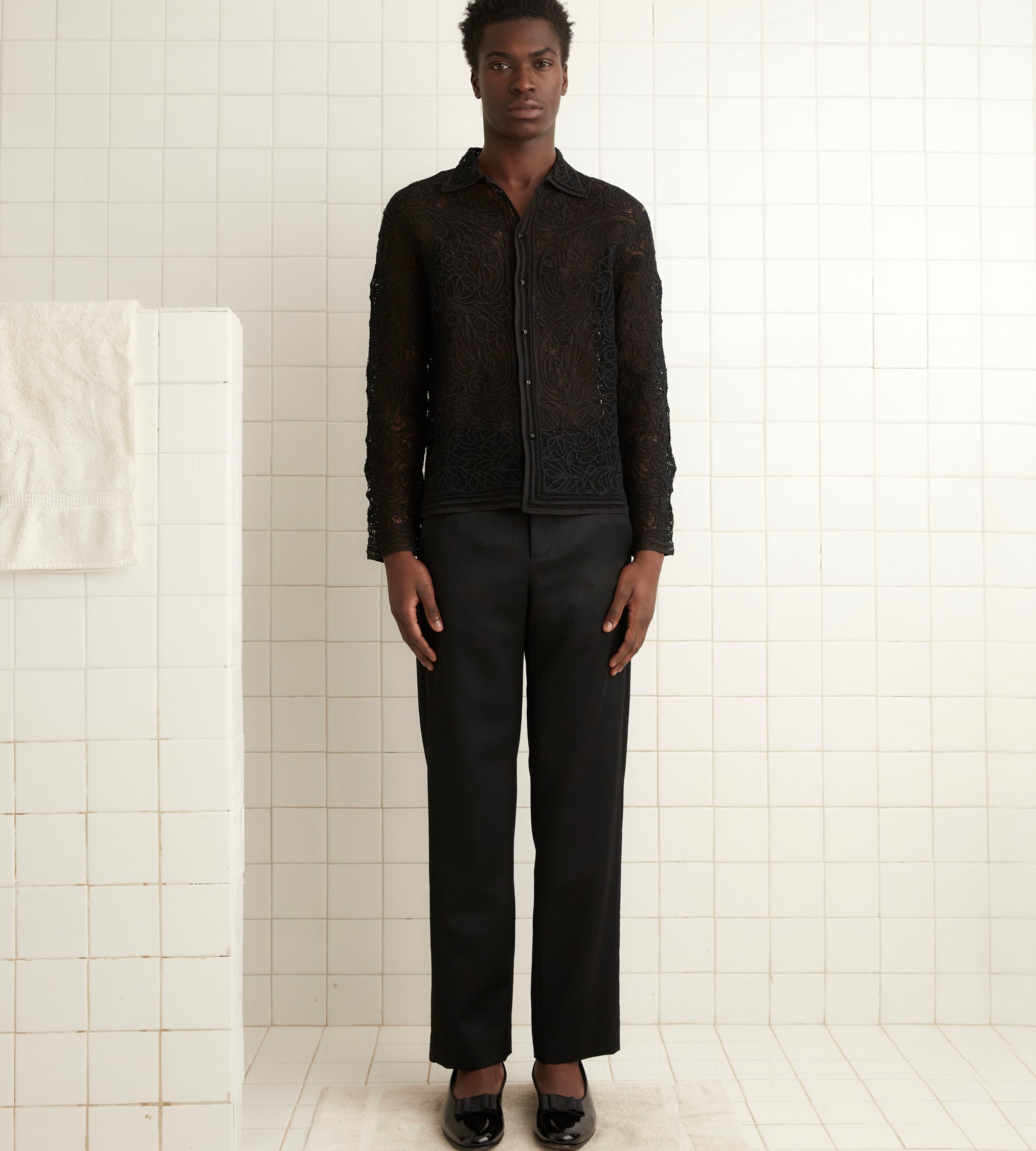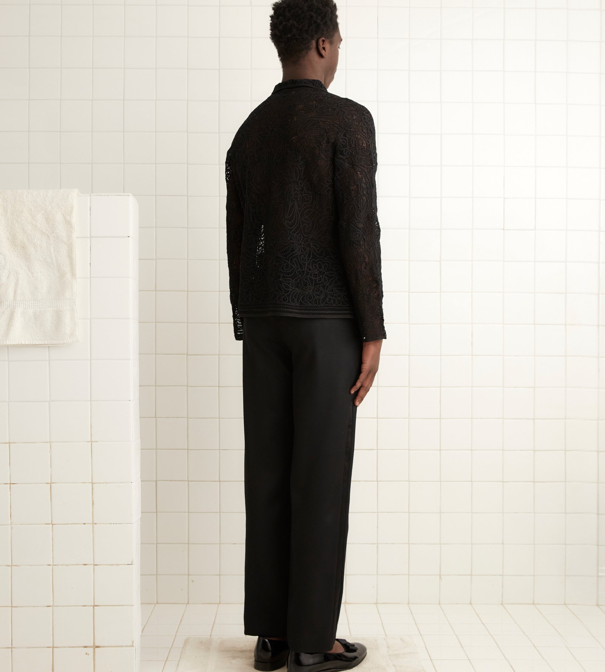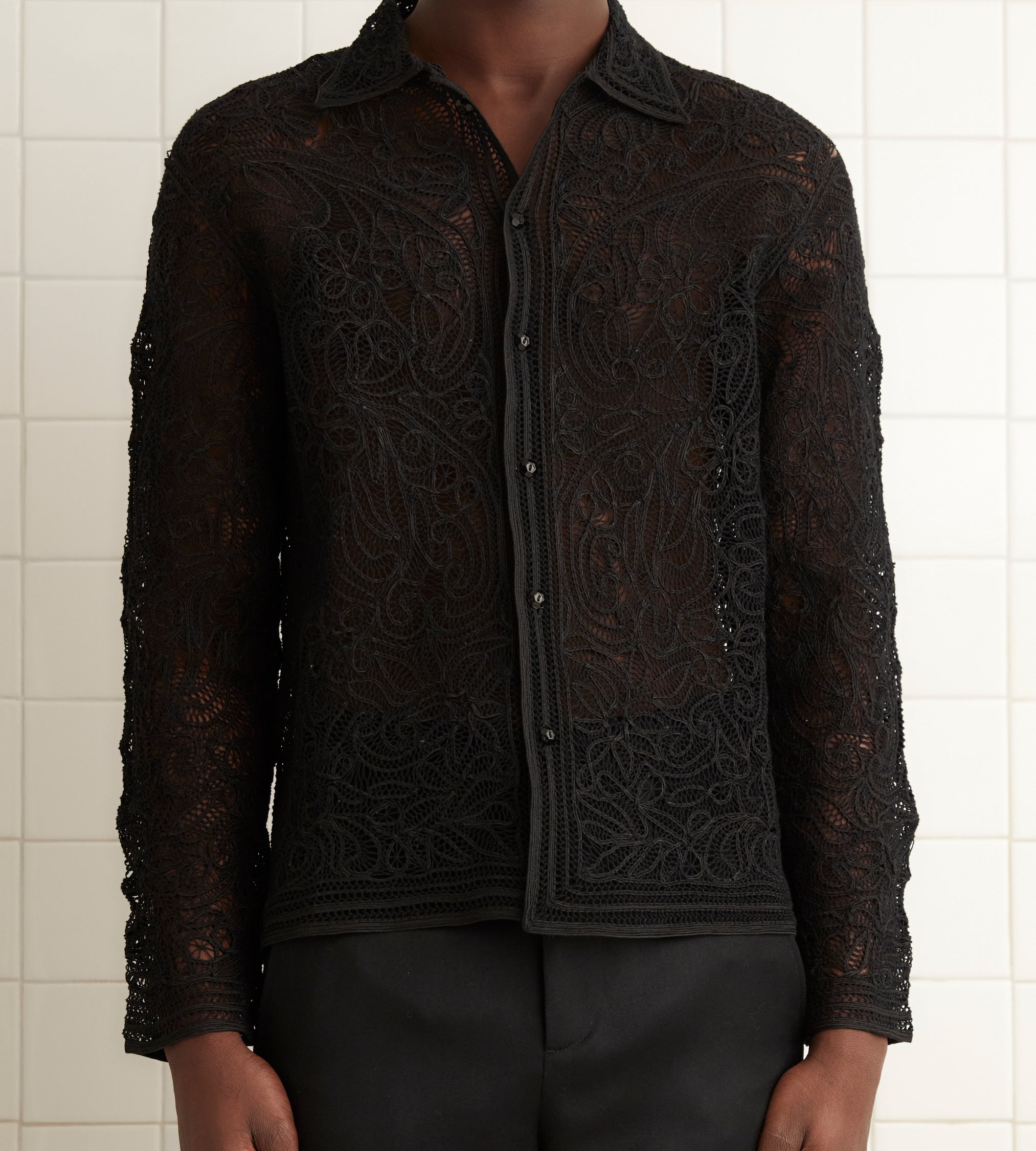 This shirt is inspired by a 1920s overblouse. It is entirely made of hand-tatted tape lace and took over 100 hours of artisan handwork to complete.