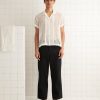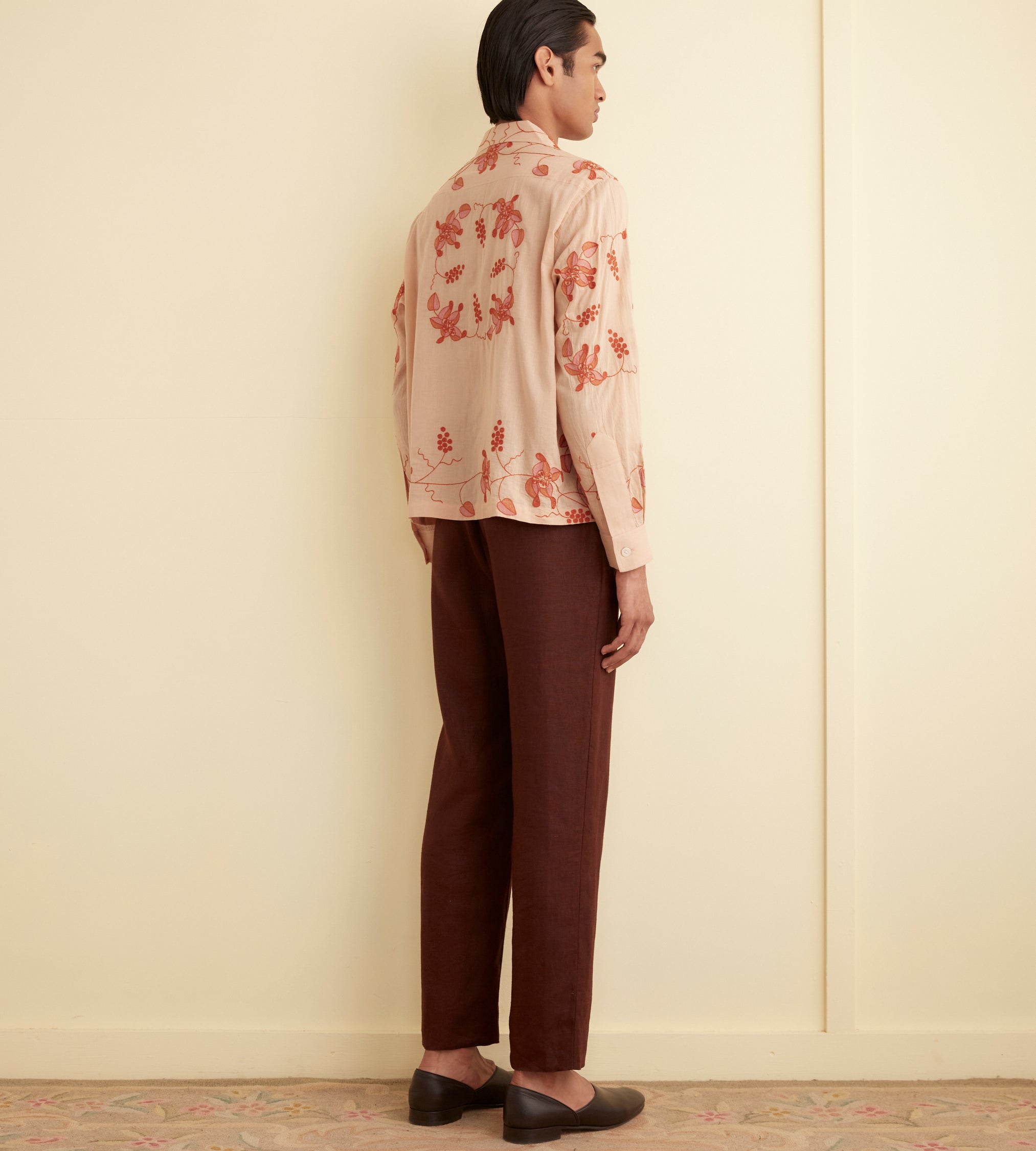This shirt is inspired by an embroidered tablecloth from the midcentury. We reproduced the embroidery—a tonal pink and orange pattern of flowers and berries—on a slightly sheer cotton voile.