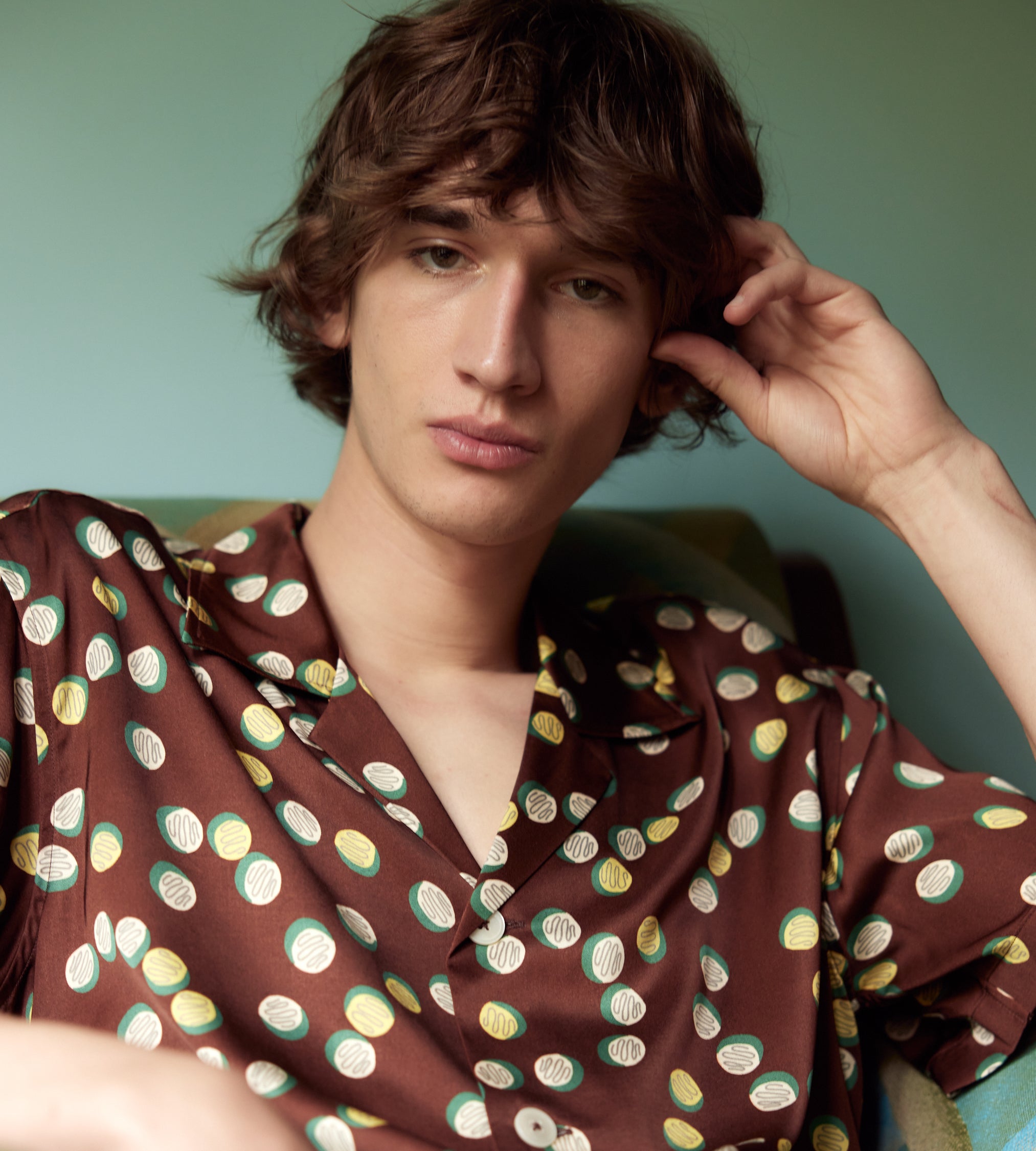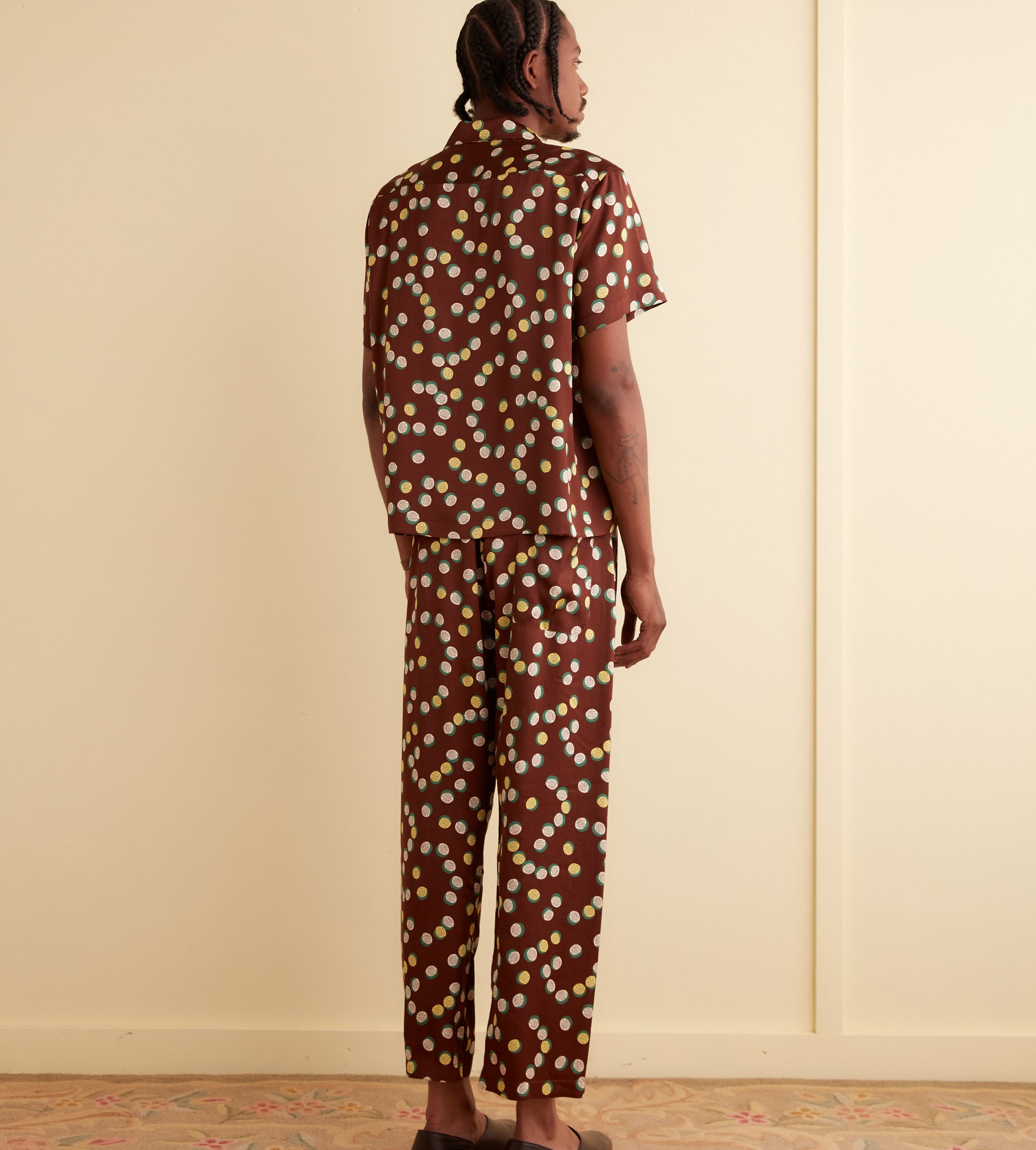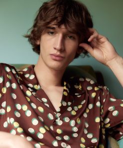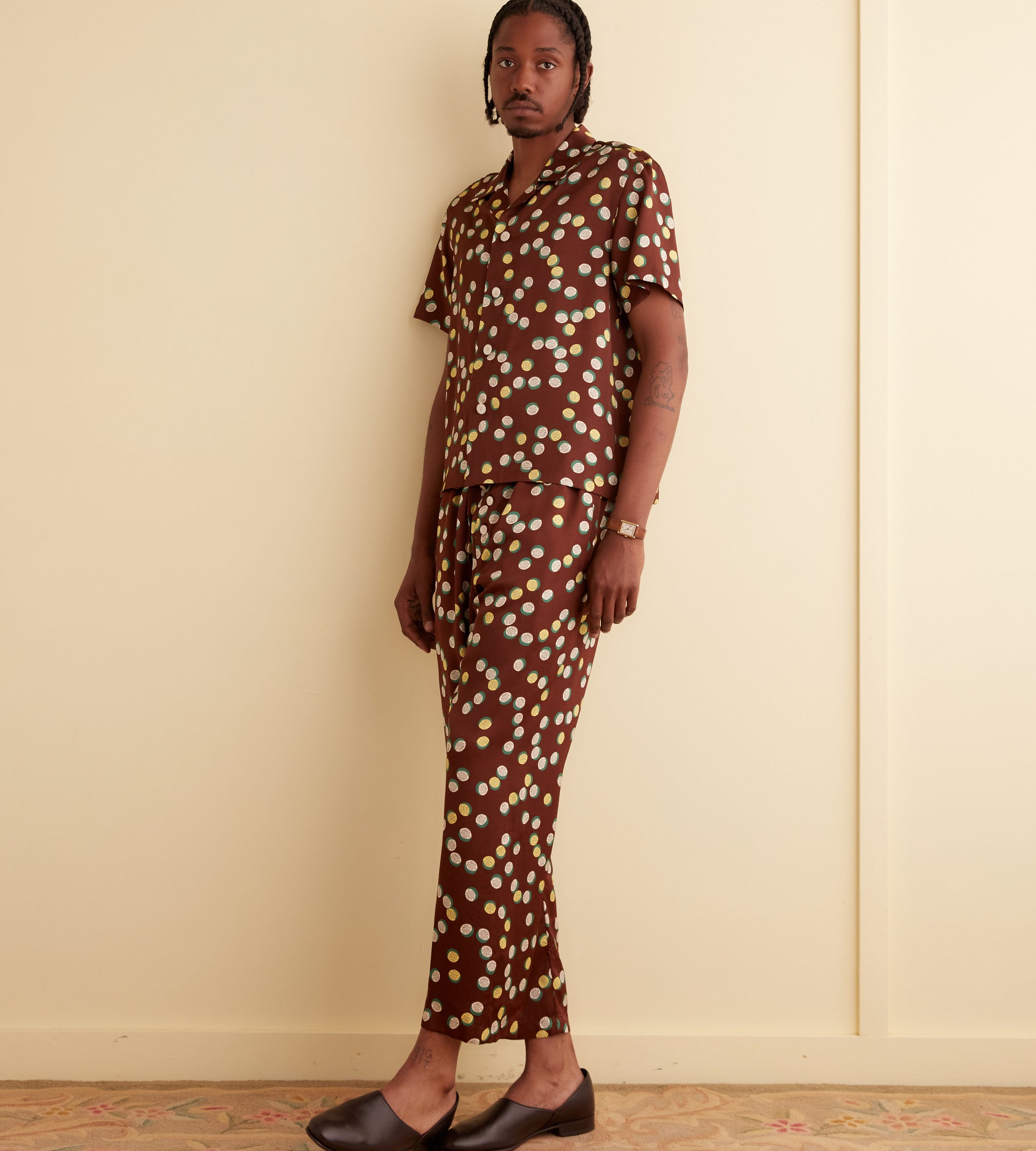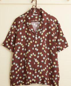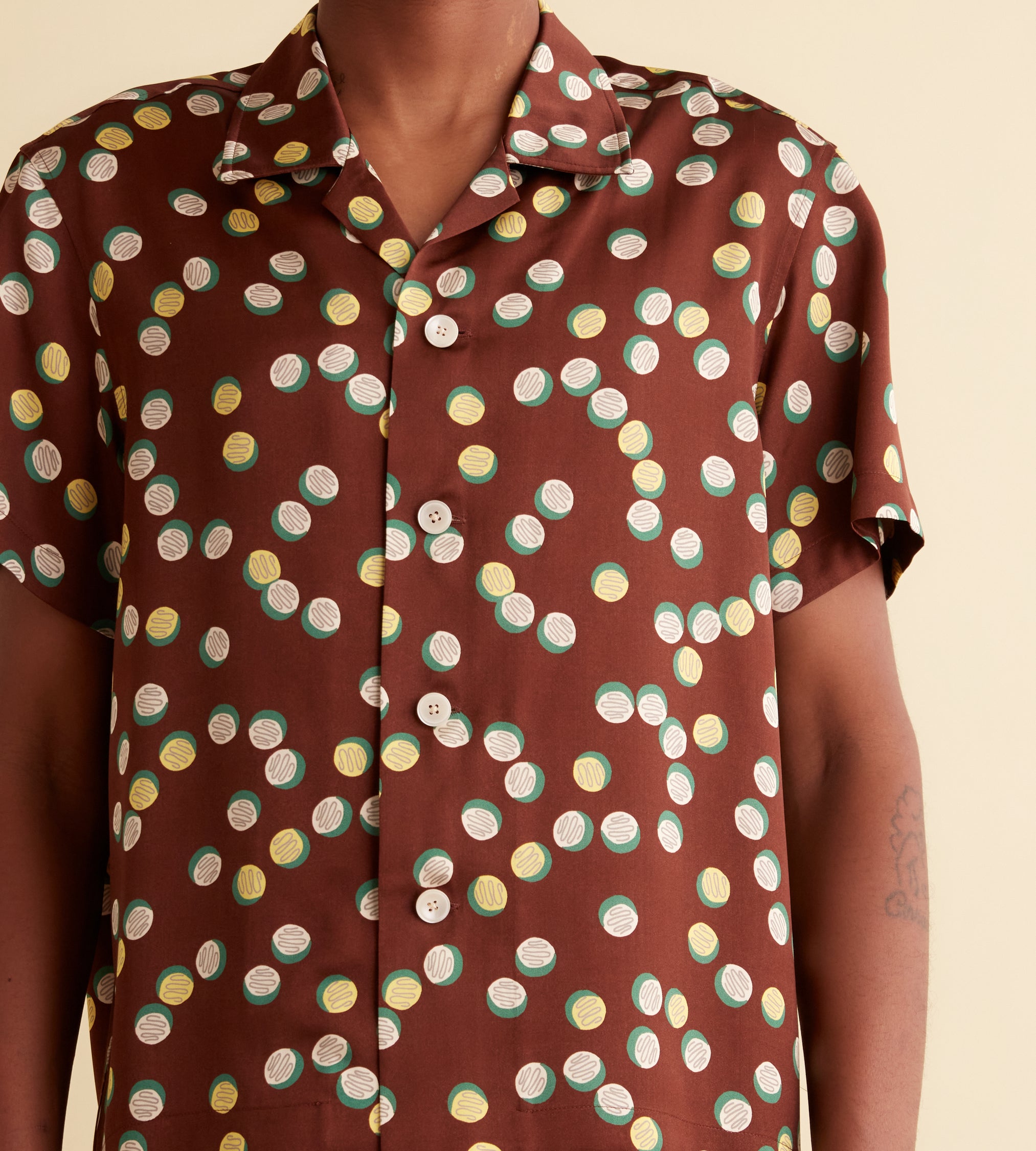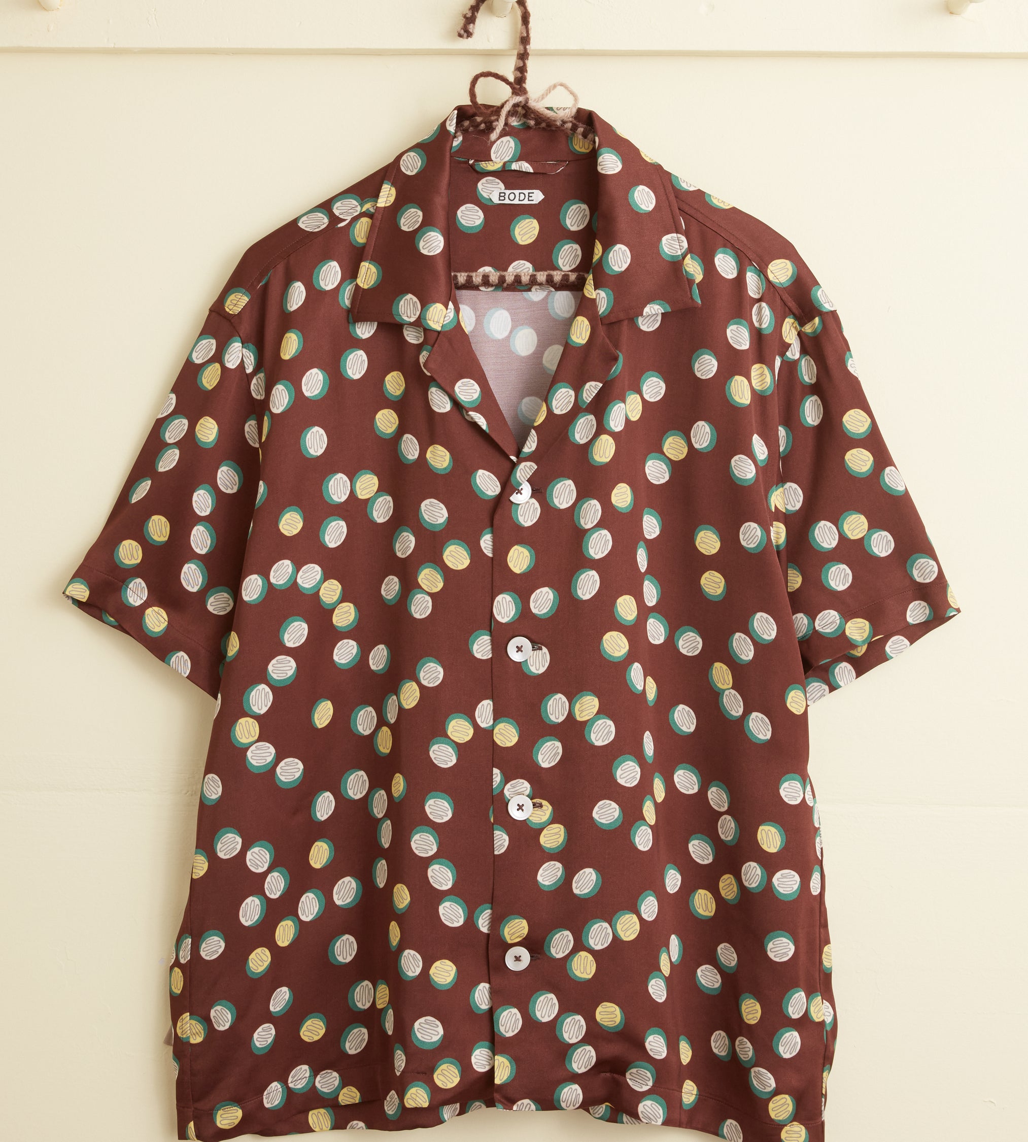 This shirt is inspired by deadstock yardage from the 1930s-1940s, which was printed with this yellow, white, and green pattern of overlapping dots. We reproduced the fabric for this style.
