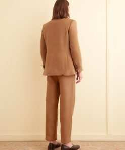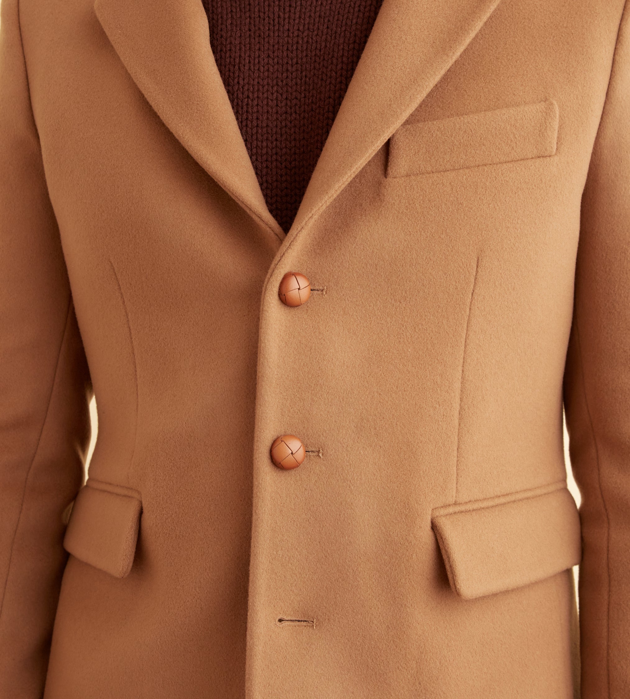 This jacket is inspired by men’s suiting from the midcentury. We reproduced the silhouette in camel-colored wool with woven leather buttons.