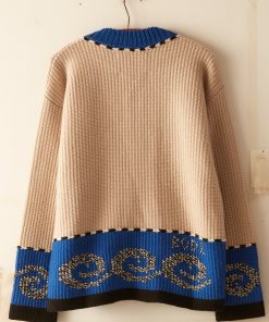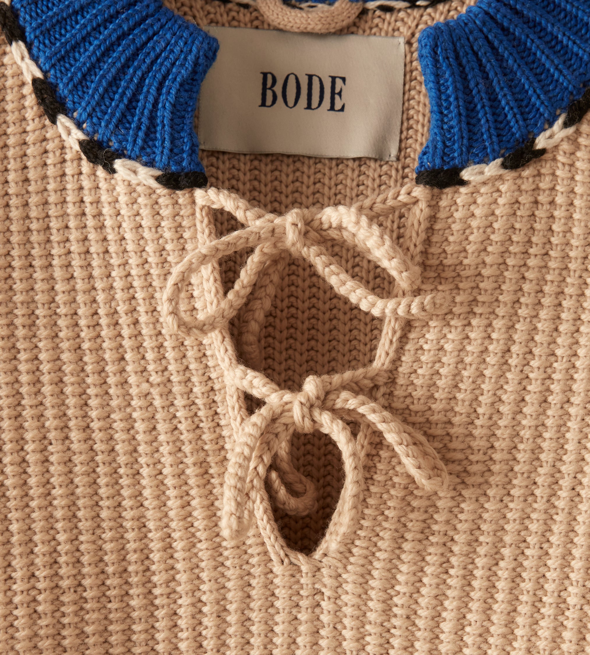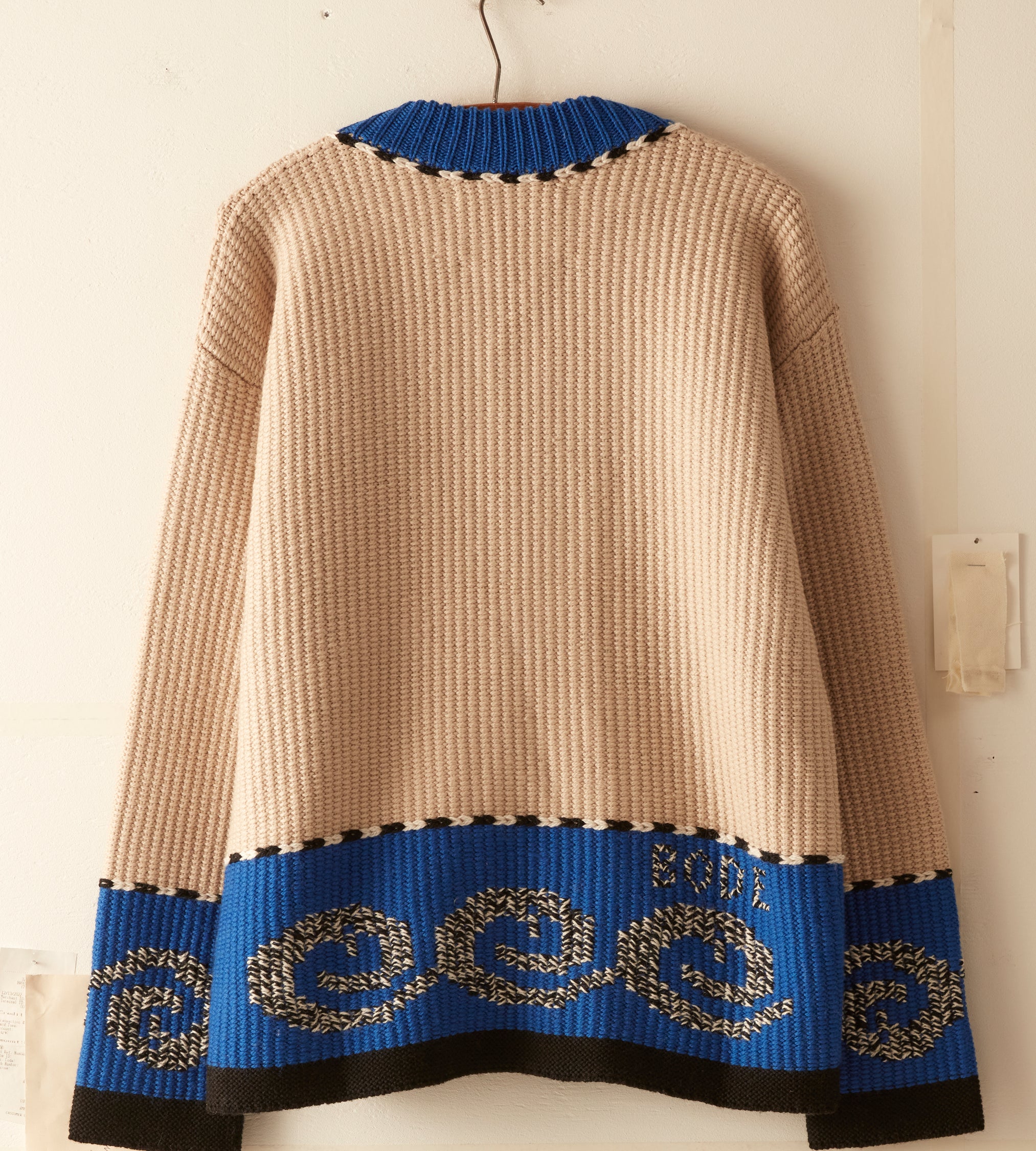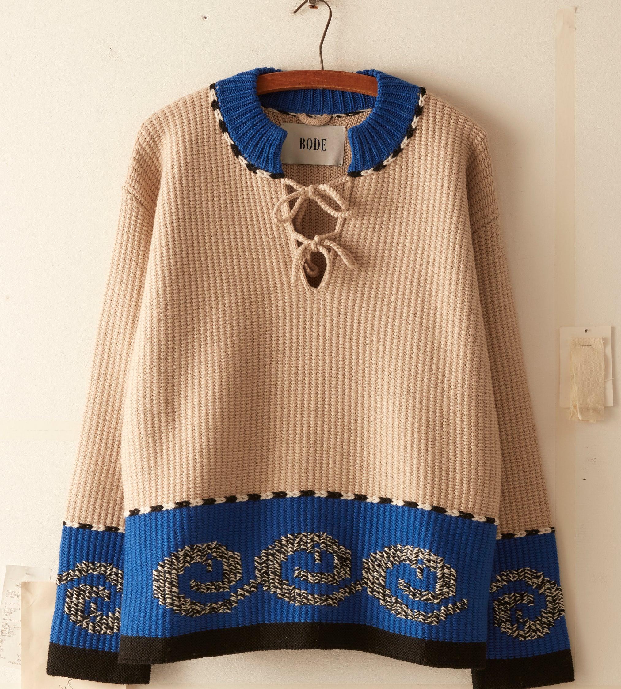 This sweater is inspired by a crochet blanket, circa 1850s-1870s. It features a faithful reproduction of the original motif reinterpreted as a knit with hand-embroidered details.