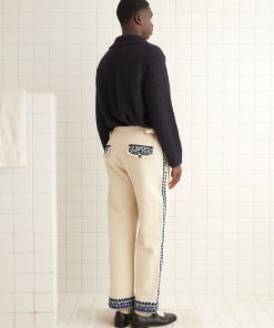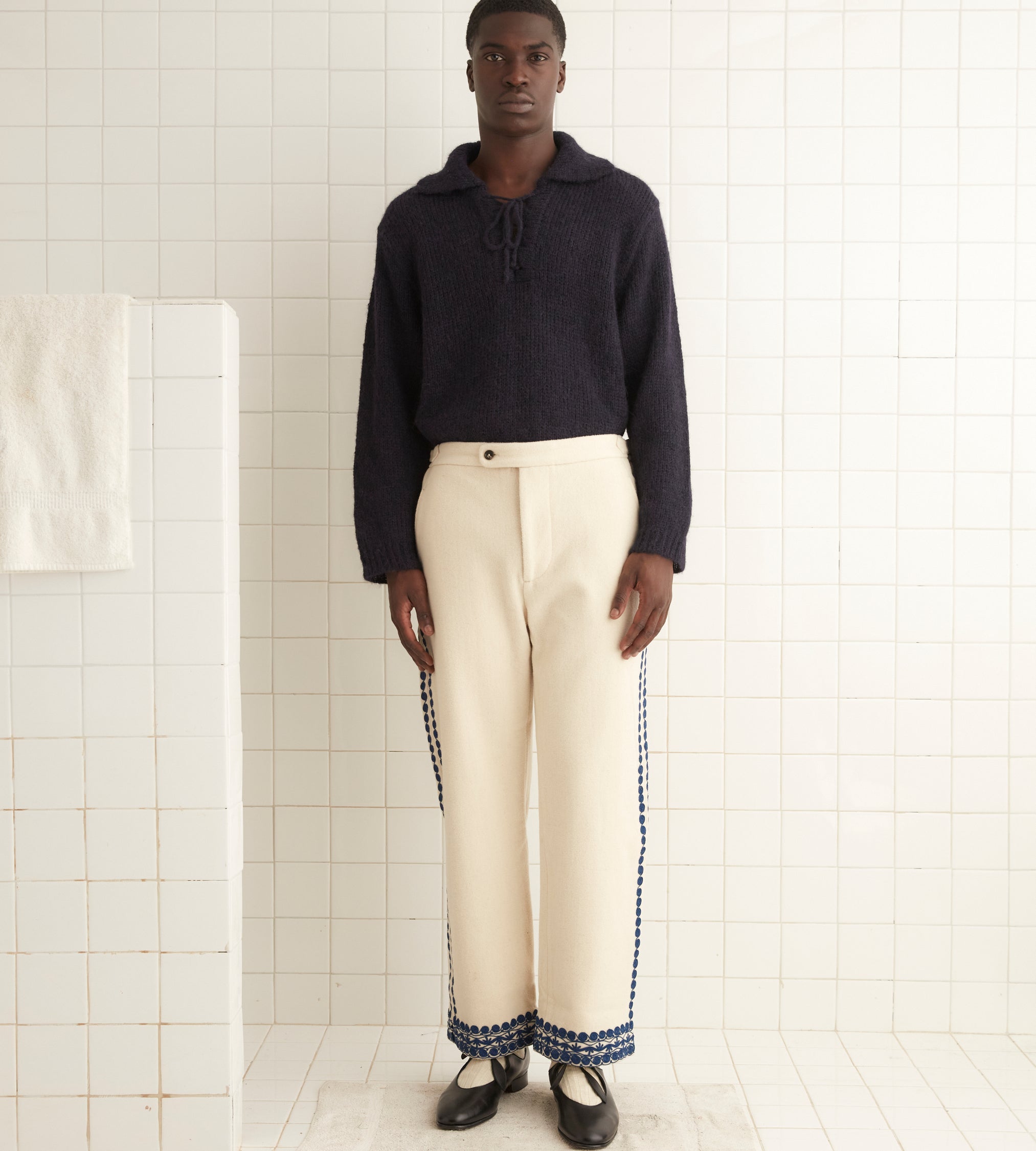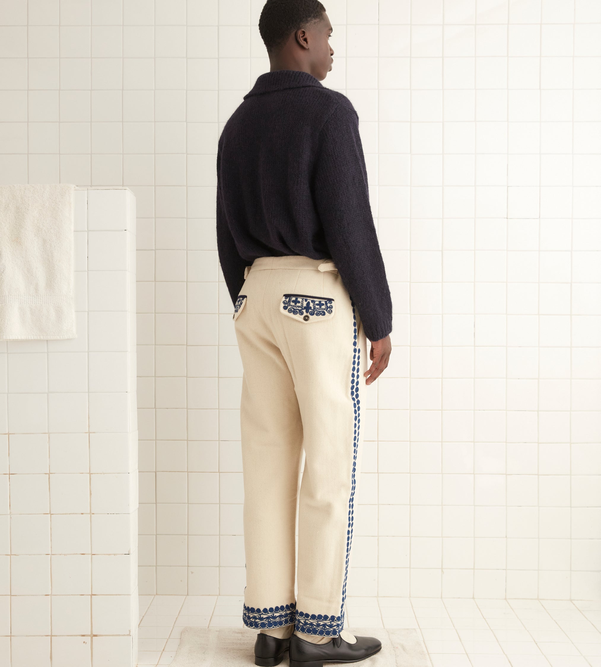 These trousers are inspired by an early-20th century waistcoat from Morocco. We reproduced the blue swirl embroidery along the hem and side seam of these trousers, which have a high rise and a straight leg. The trousers are made of undyed cream wool, which has some flecks of color variation due to the nature of the fibers.