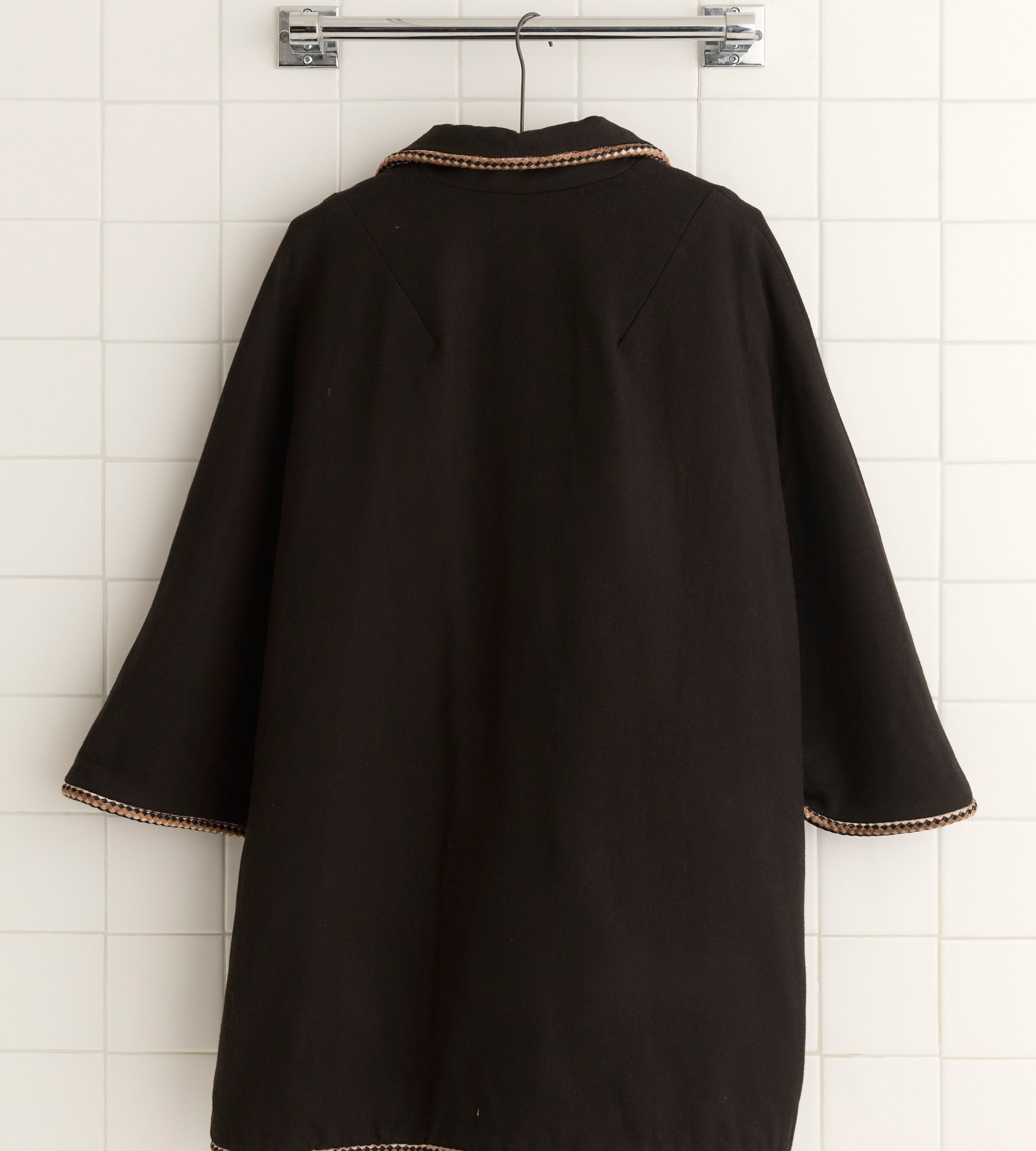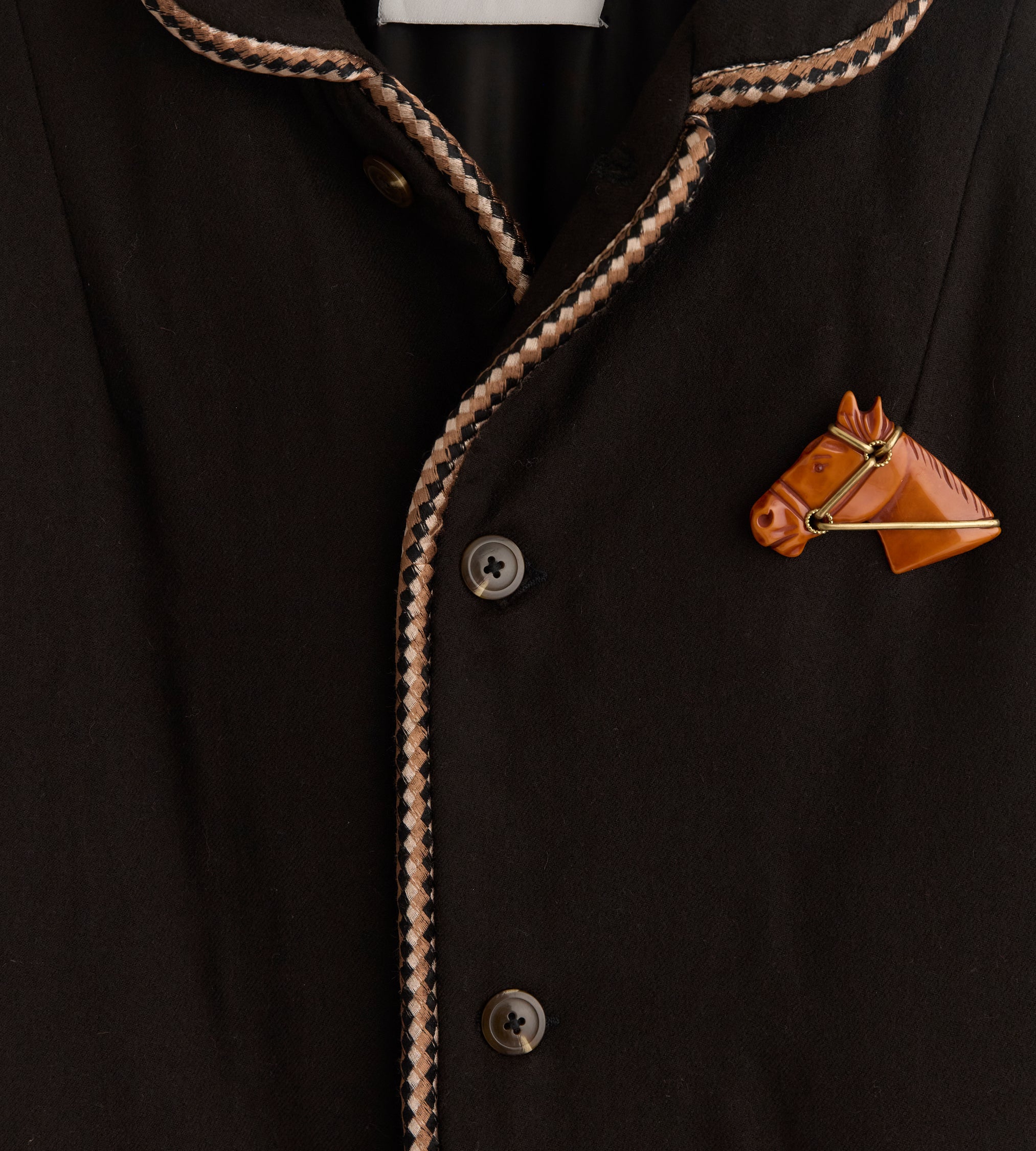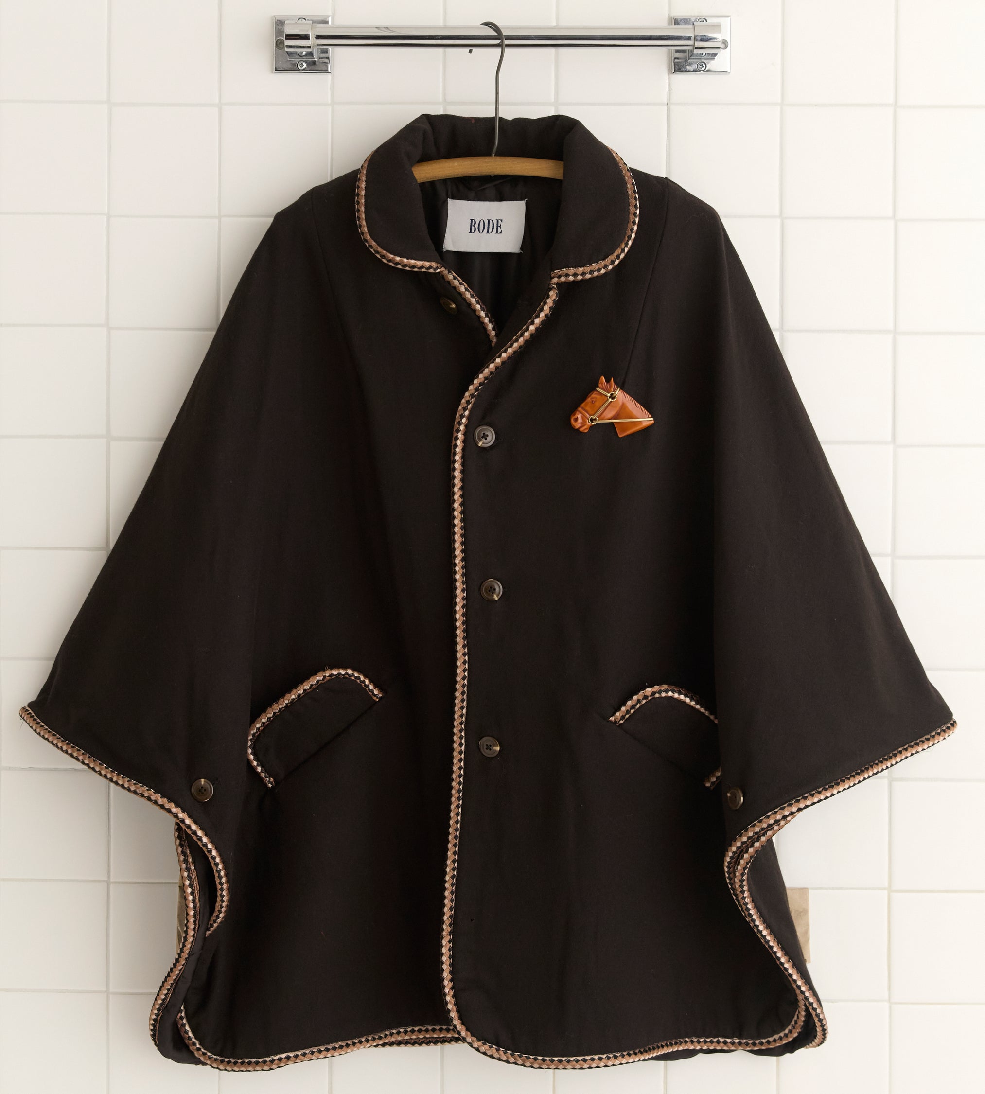This cape is inspired by an Edwardian Revival jacket, circa 1960s. It features crochet trim and a removable horse-head brooch.