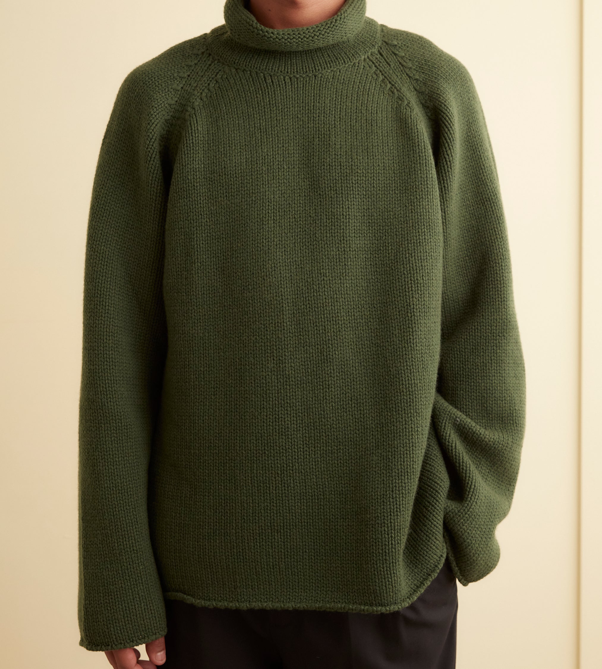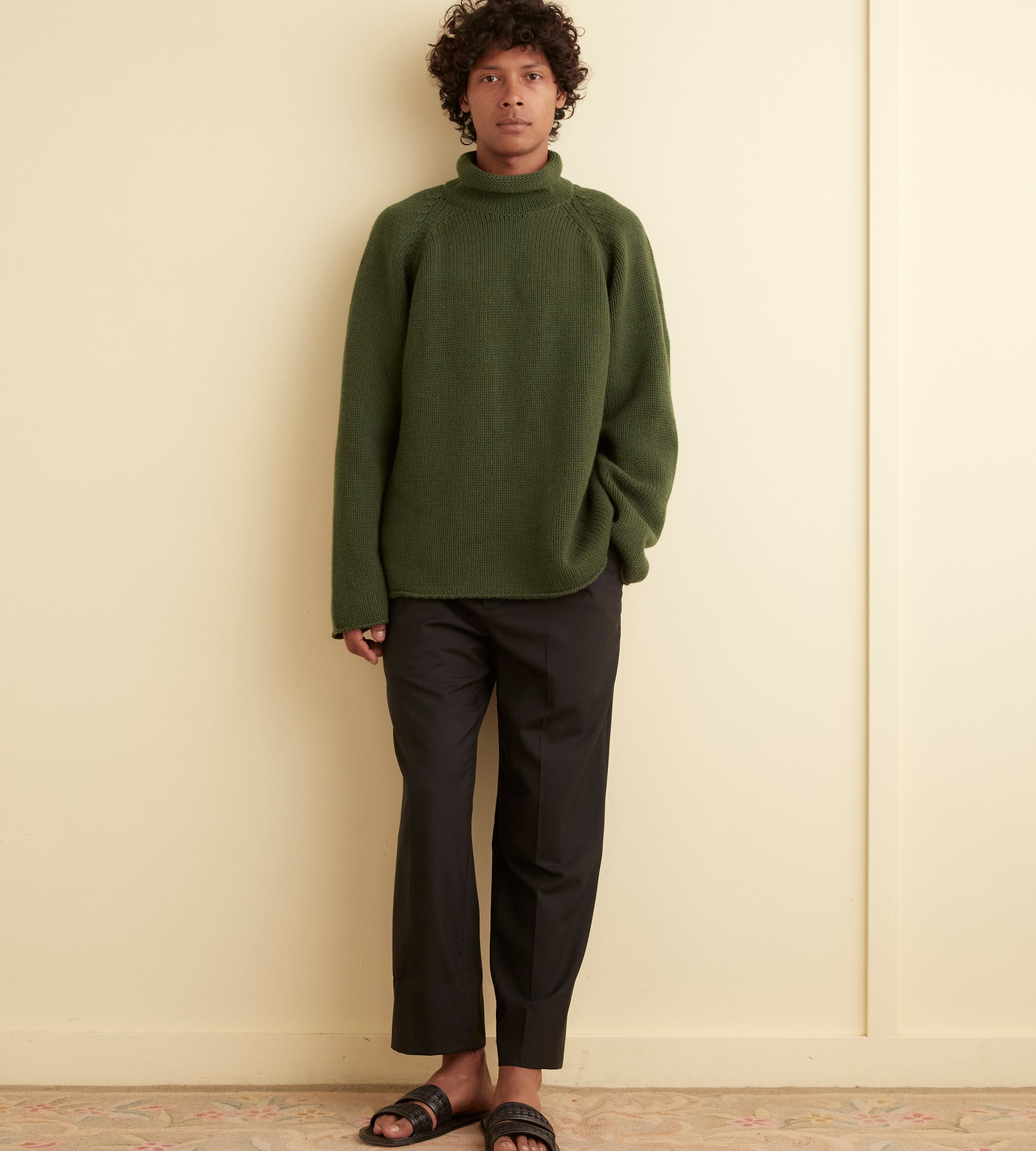 This rollneck sweater is inspired by adolescent knitwear, circa 1960s. The silhouette came from a teen’s sweater, reproduced in 100% cashmere and knit in Italy.