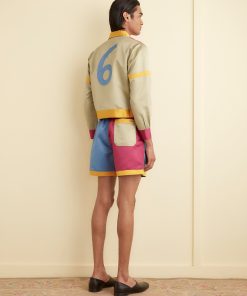 These shorts are inspired by a jockey jacket from the 1950s, which was colorblocked with sections of pink, blue, and gold. We reproduced the colorblocking for this style, which has a short inseam and a wide leg opening.