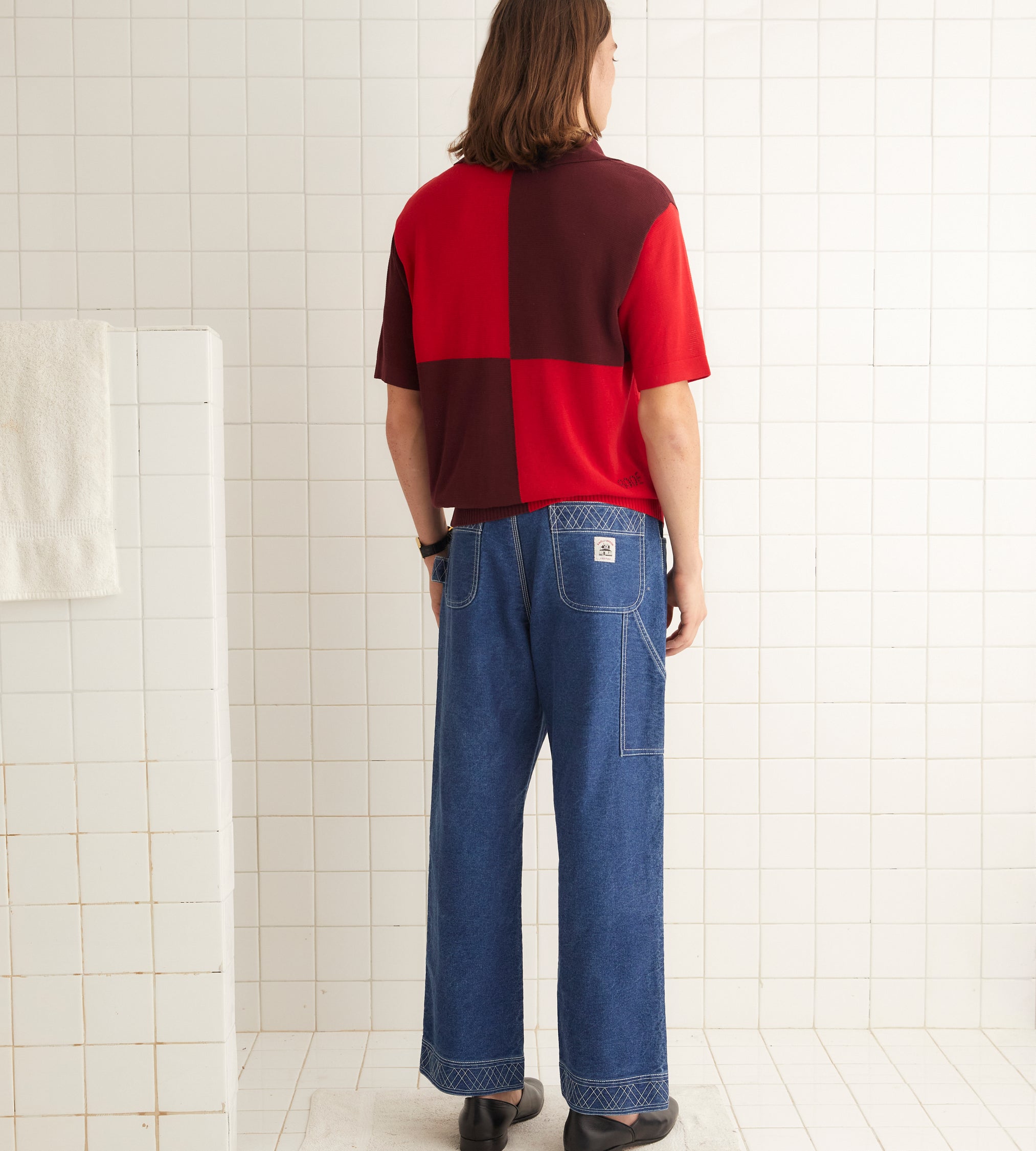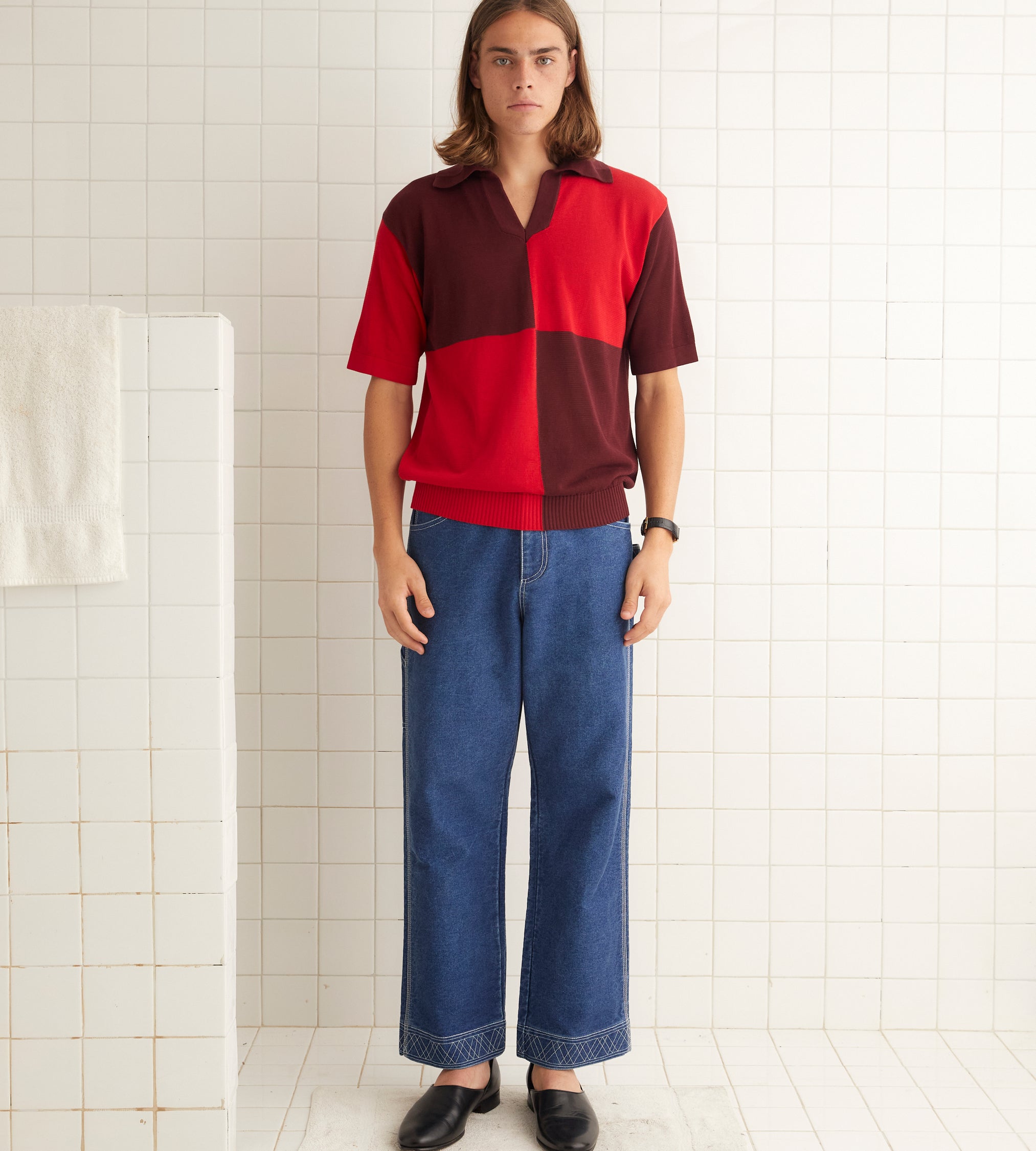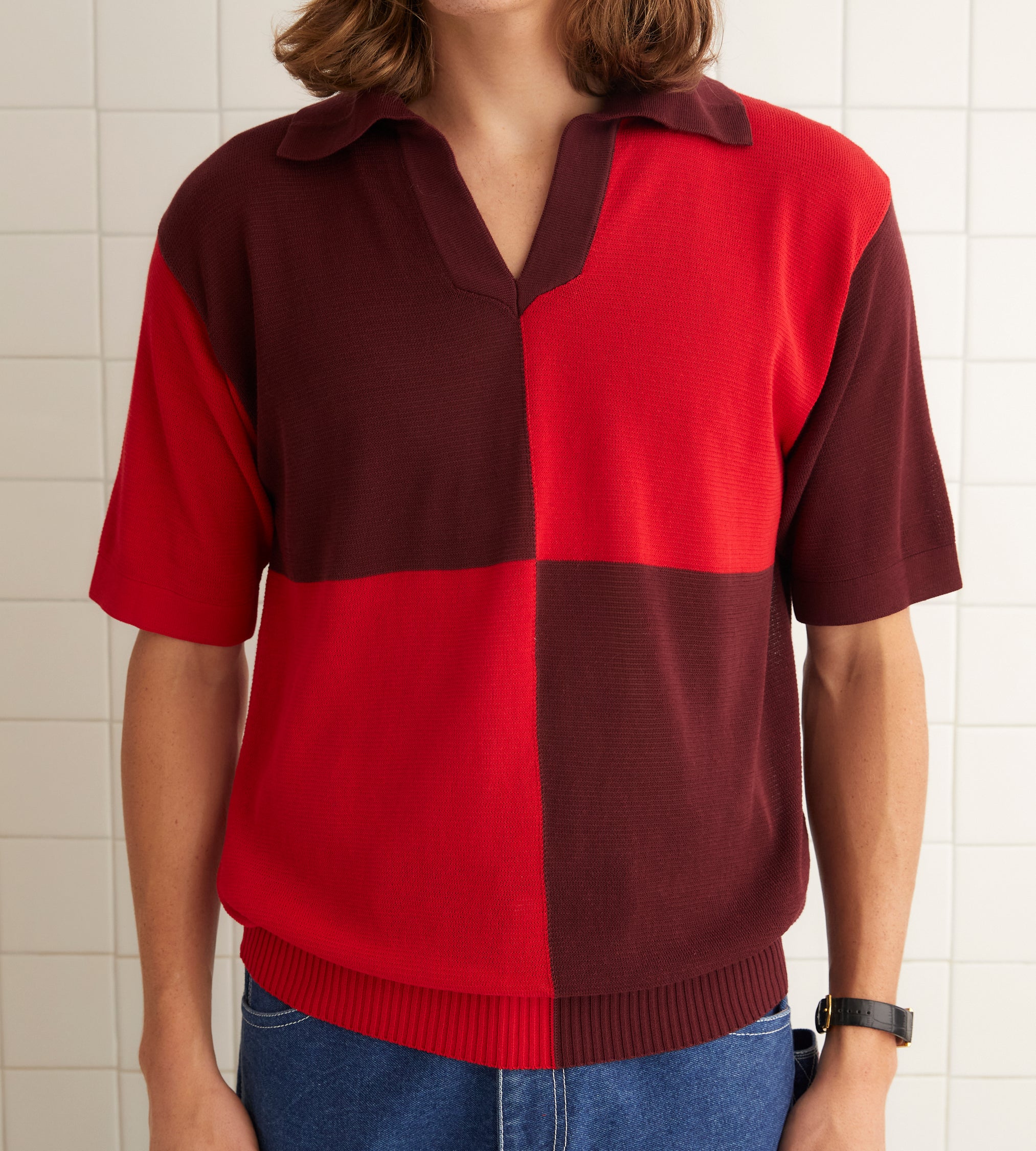 This style is inspired by a polo shirt from the 1970s. We reproduced the boxy silhouette in a thin, dry yarn.