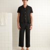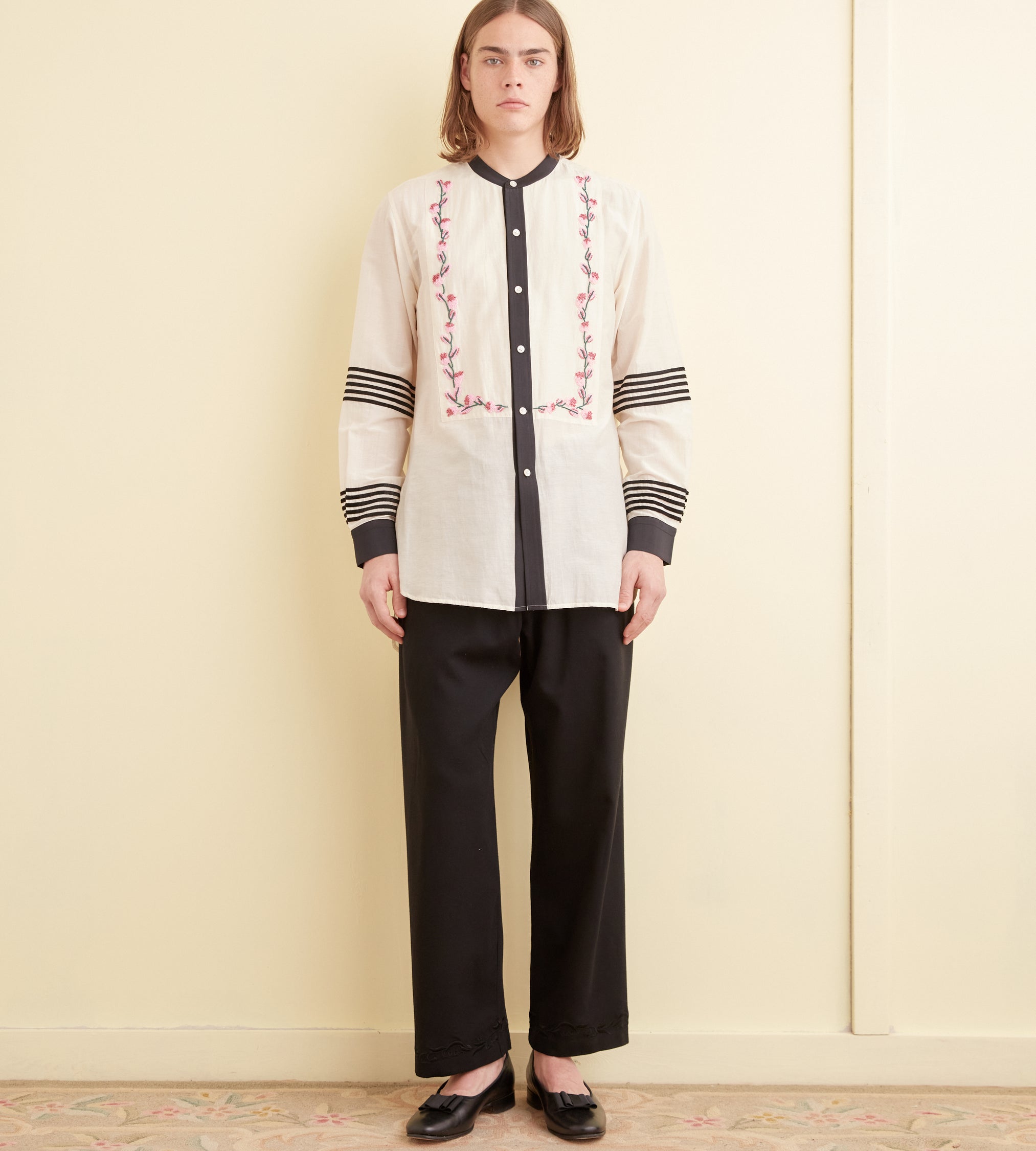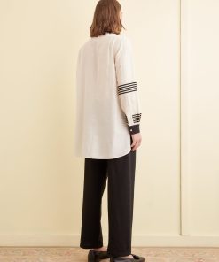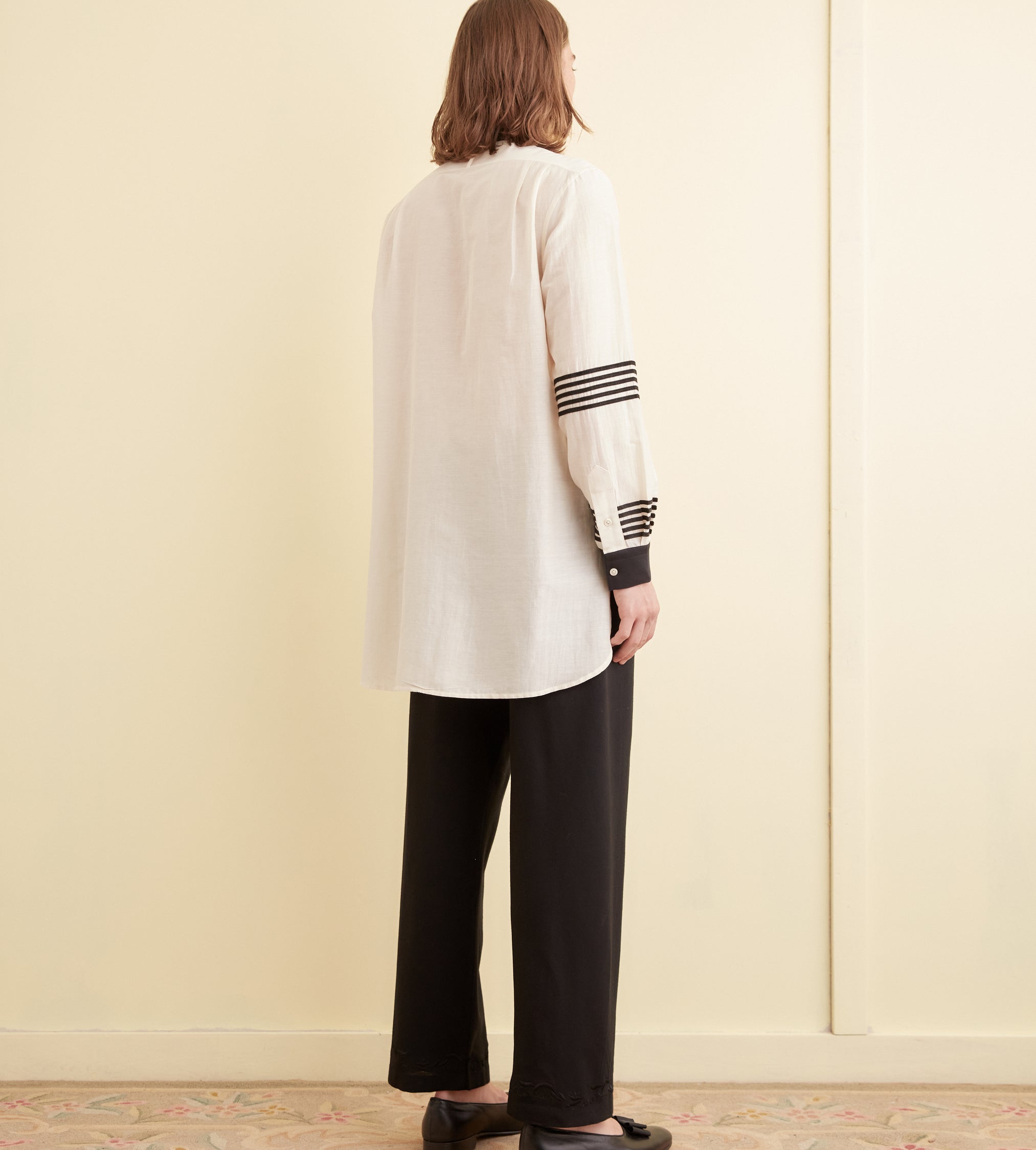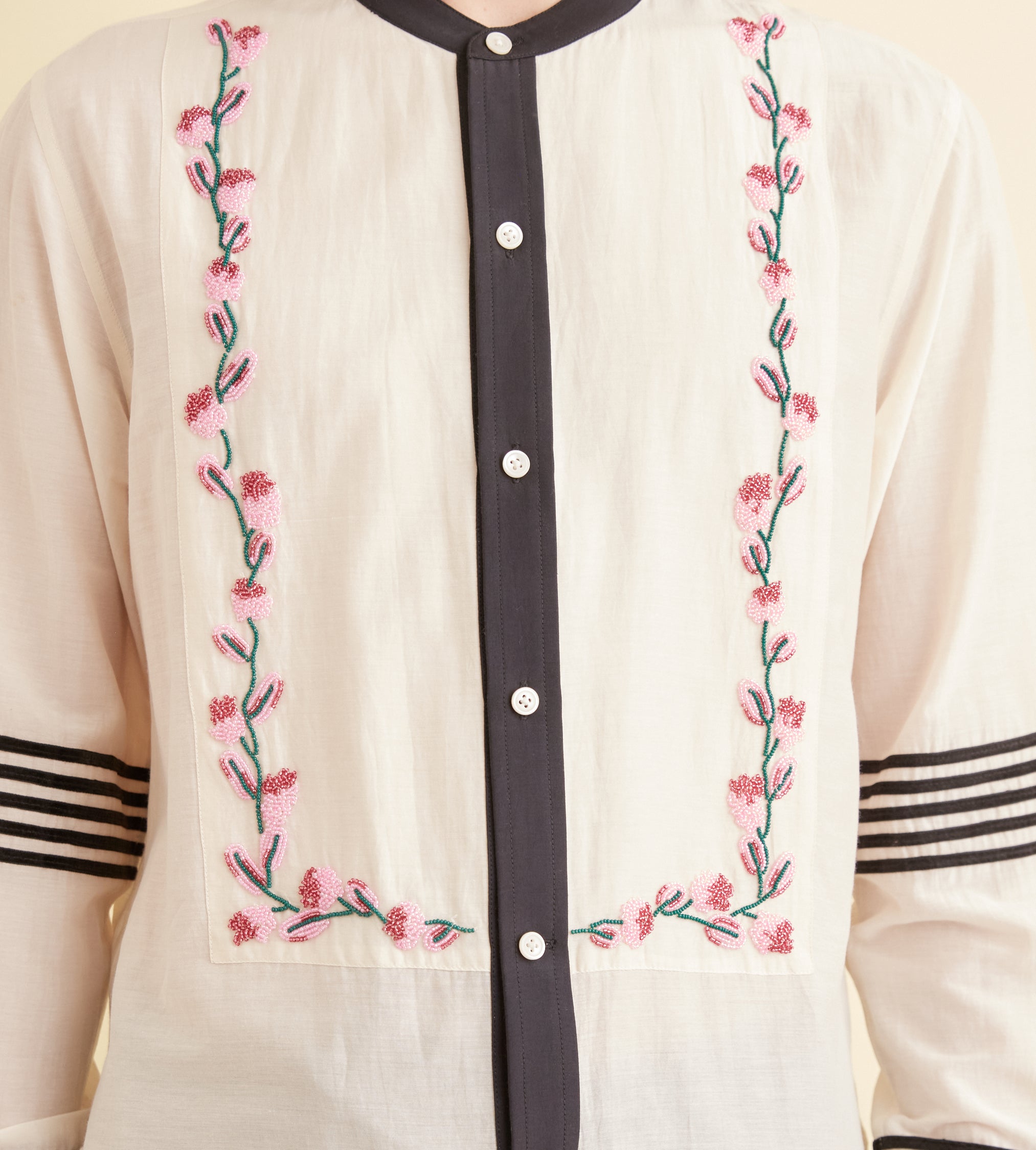 This tunic is inspired by an antique blouse, circa 1910. We reproduced the delicate cherry blossom beading and the appliquéd black stripes for this style. The tunic has a contrast collar and cuffs and a stepped hem.