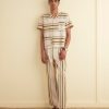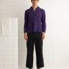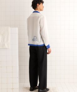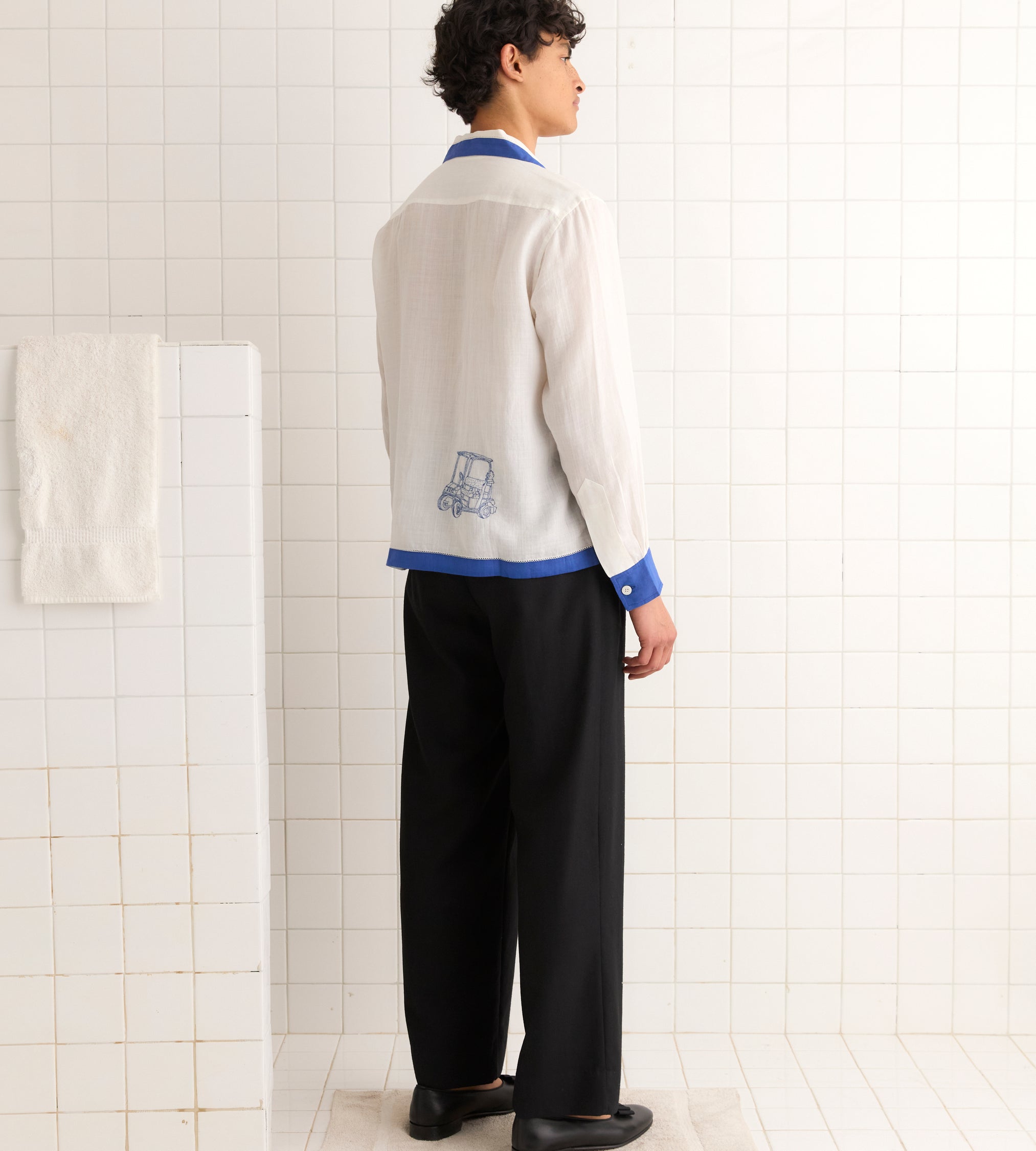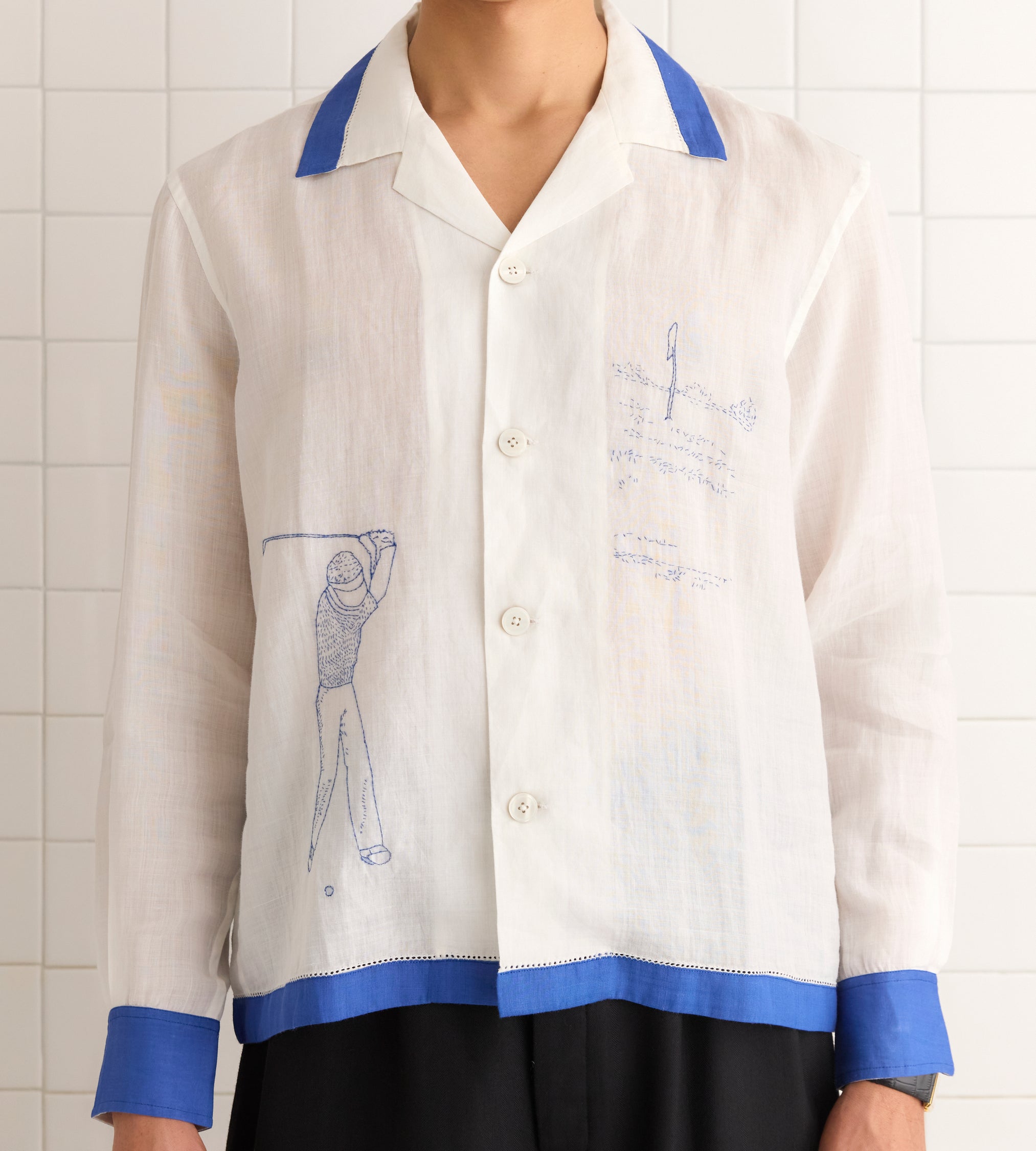 This shirt is inspired by a printed golf tablecloth from the 1980s. We reproduced motifs from the original pattern—a player, a hole, and a golf cart—for this style, embroidered in a delicate single-thread style. The shirt features appliquéd trim around the collar, hem, and cuffs.
