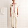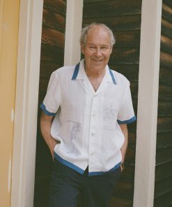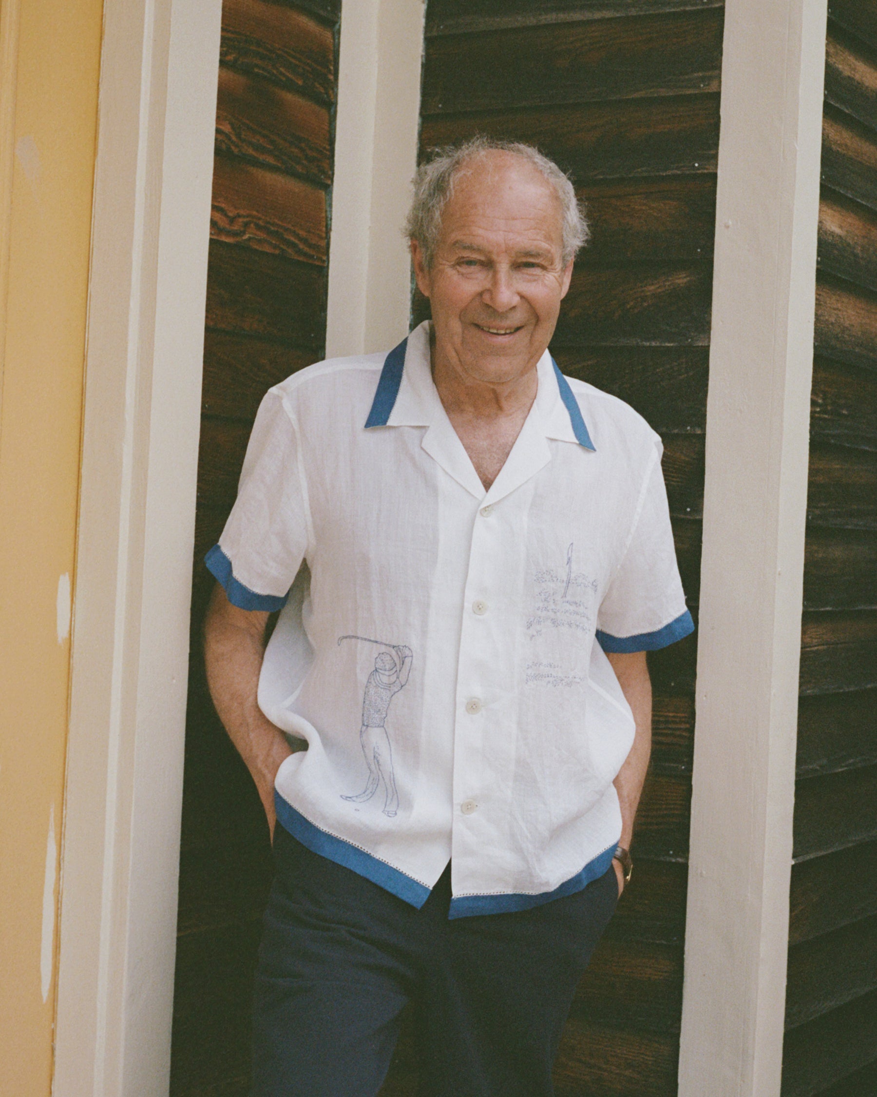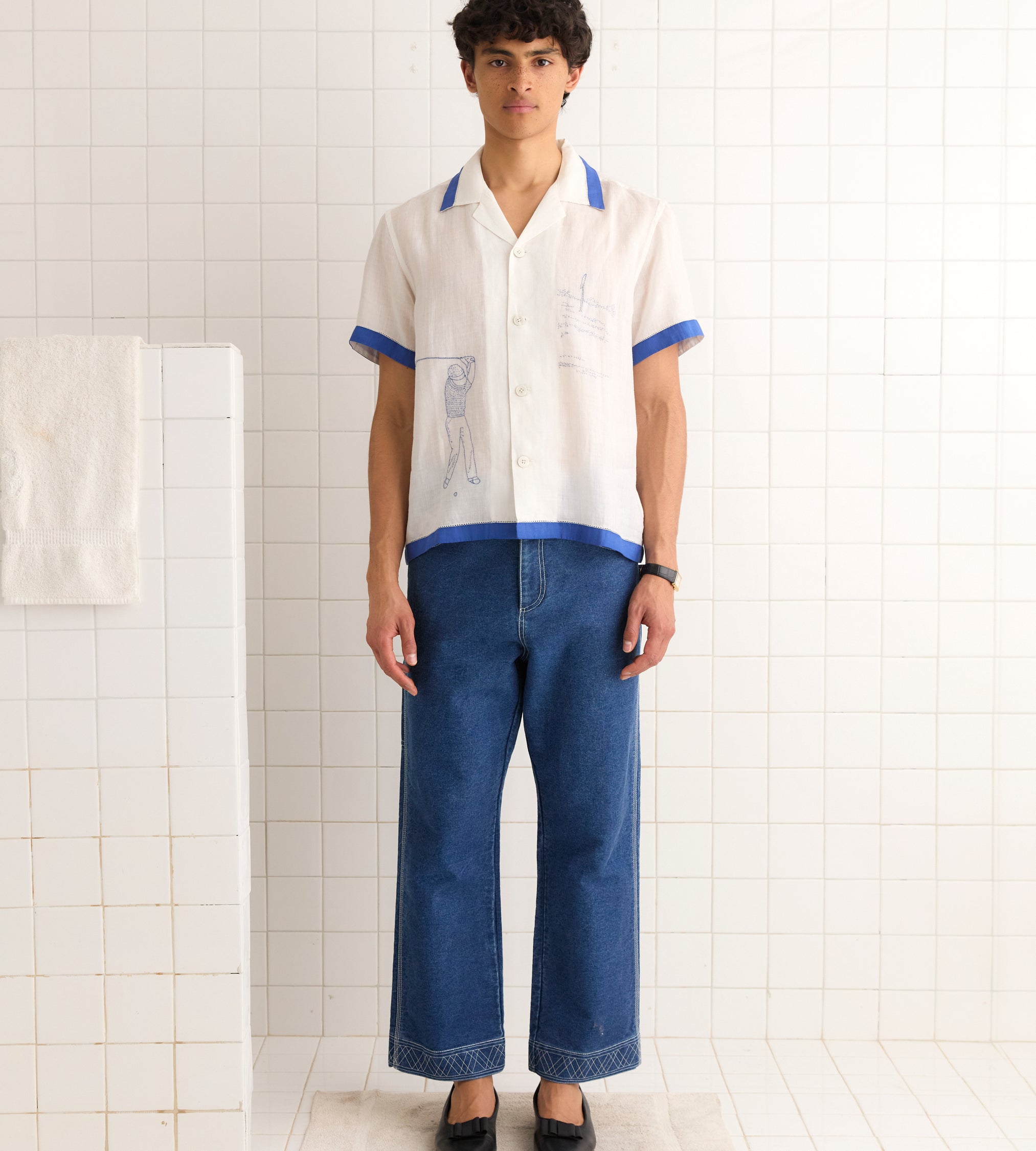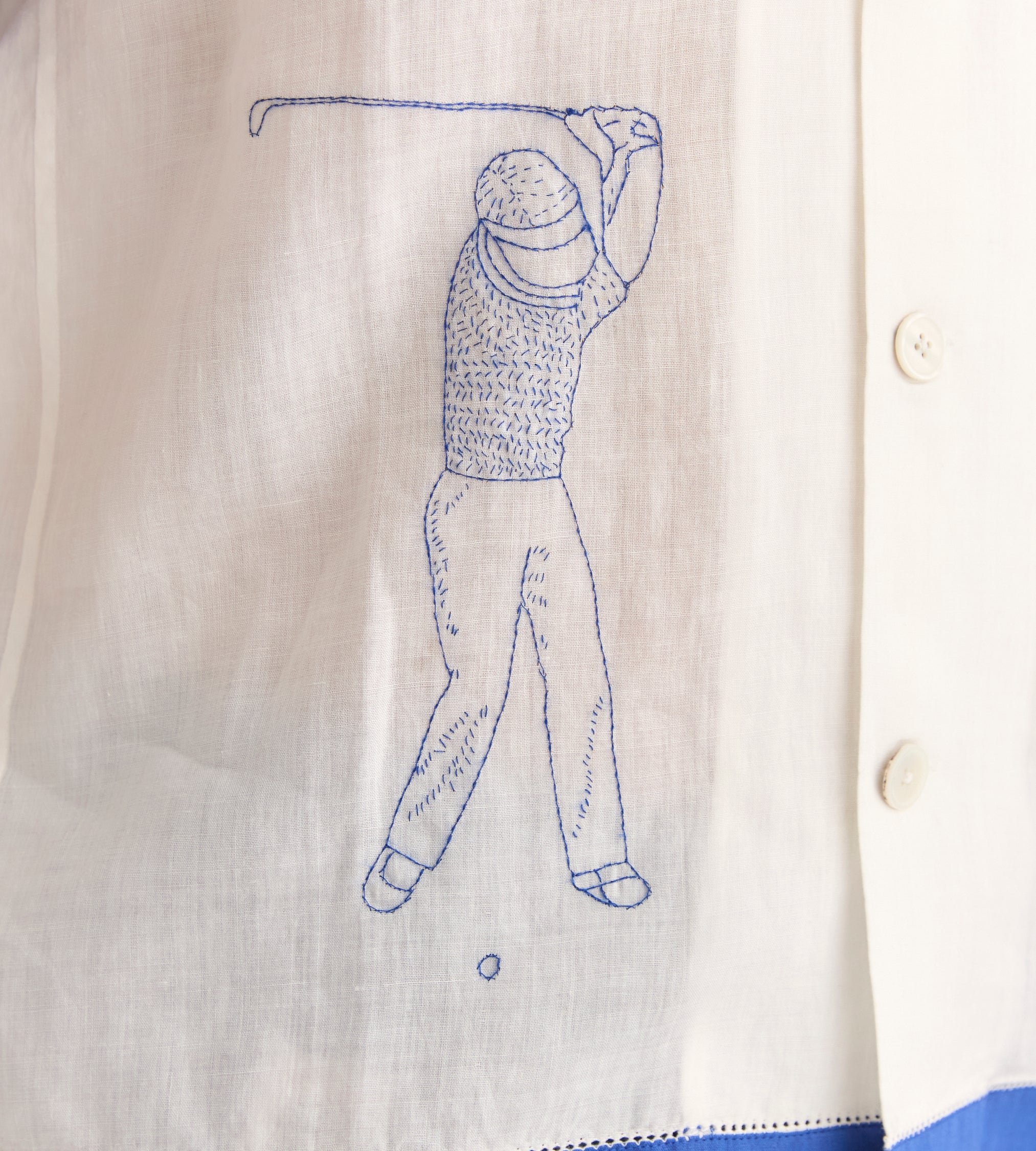 This shirt is inspired by a printed golf tablecloth from the 1980s. We reproduced motifs from the original pattern—a player, a hole, and a golf cart—for this style, embroidered in a delicate single-thread style. The shirt features appliquéd trim around the collar, hem, and cuffs.