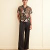 This shirt is inspired by a printed golf tablecloth from the 1980s. We reproduced motifs from the original pattern—a player, a hole, and a golf cart—for this style, embroidered in a delicate single-thread style. The shirt features appliquéd trim around the collar, hem, and cuffs.