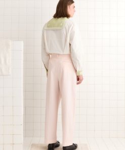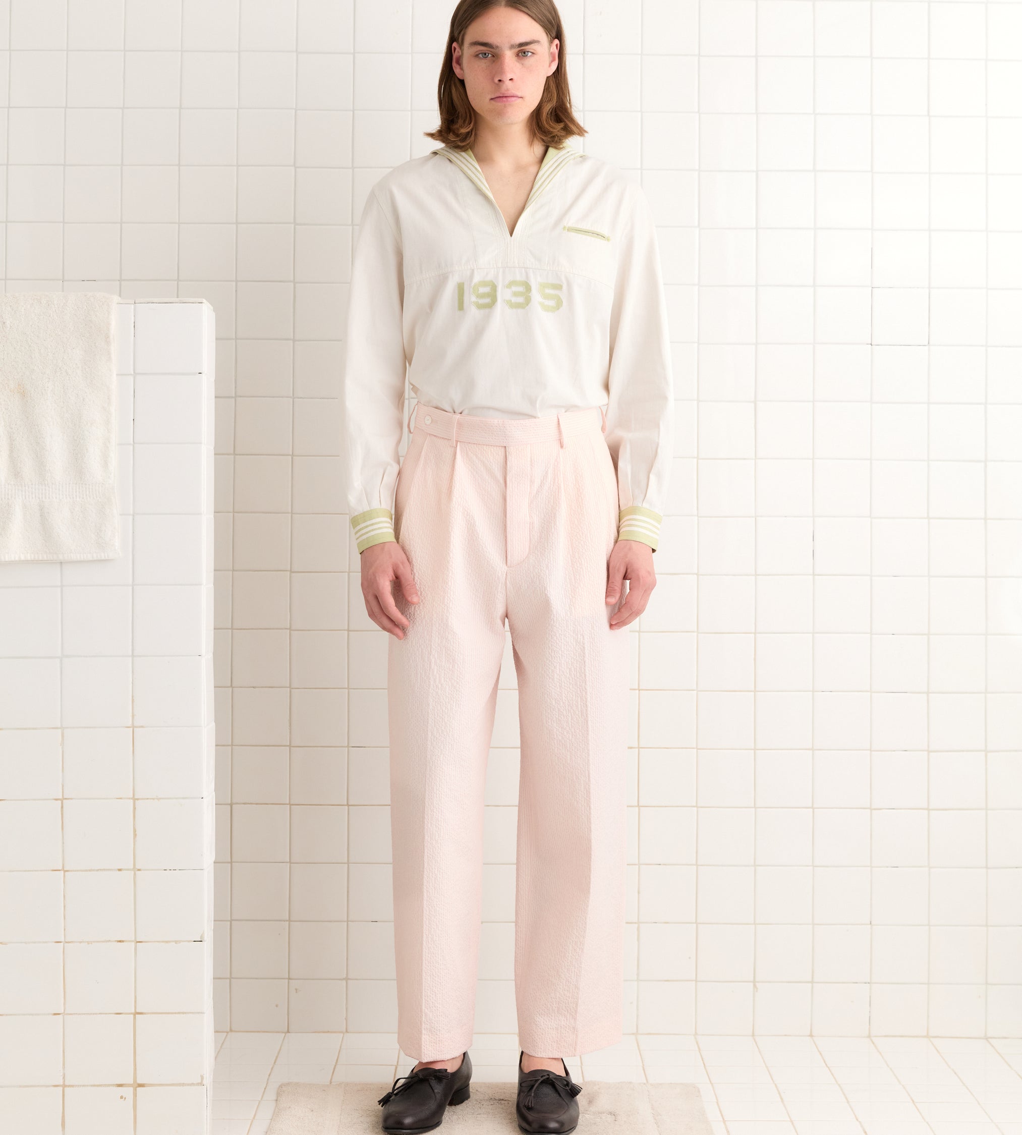 These trousers are inspired by men’s suiting from the 1950s-1960s. We reproduced the silhouette in pink seersucker. The trousers have a high rise and a wide leg.