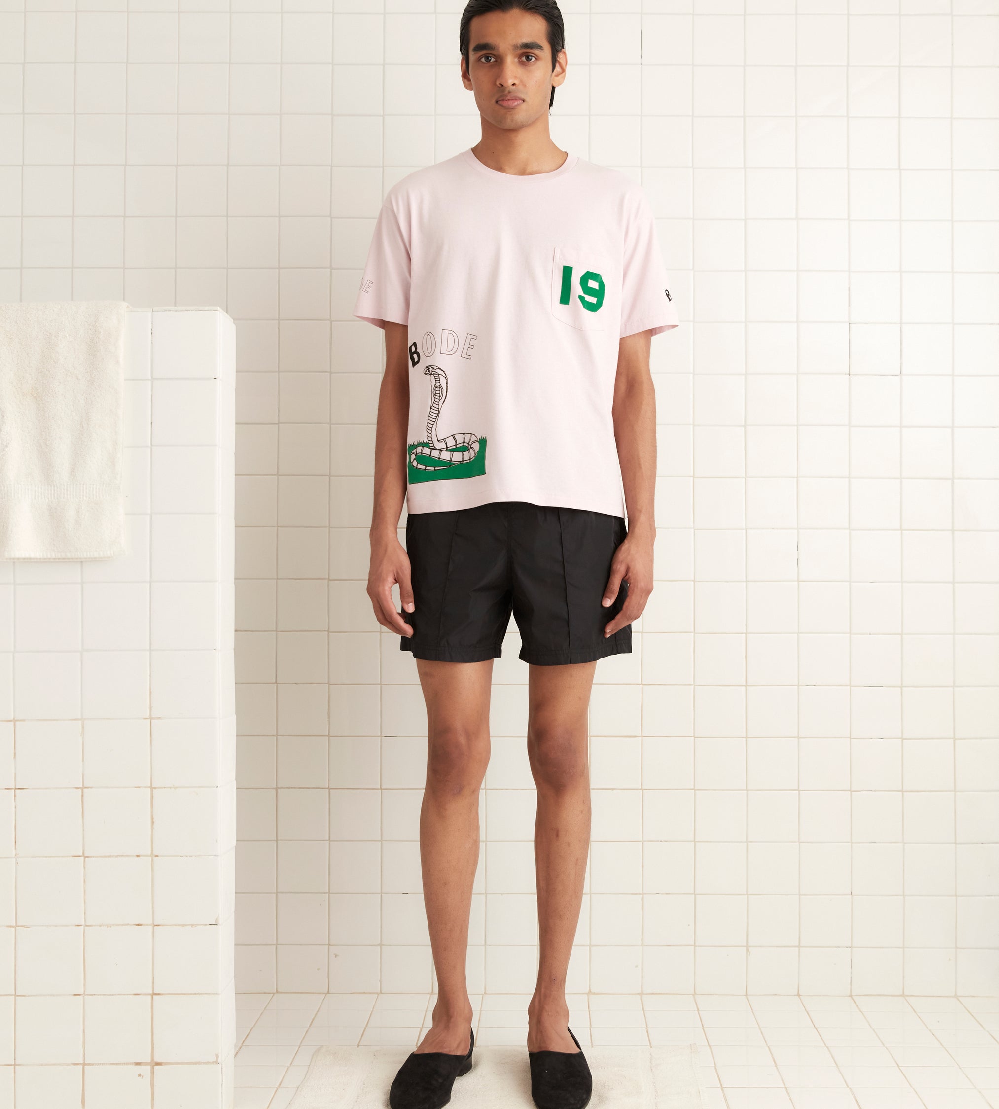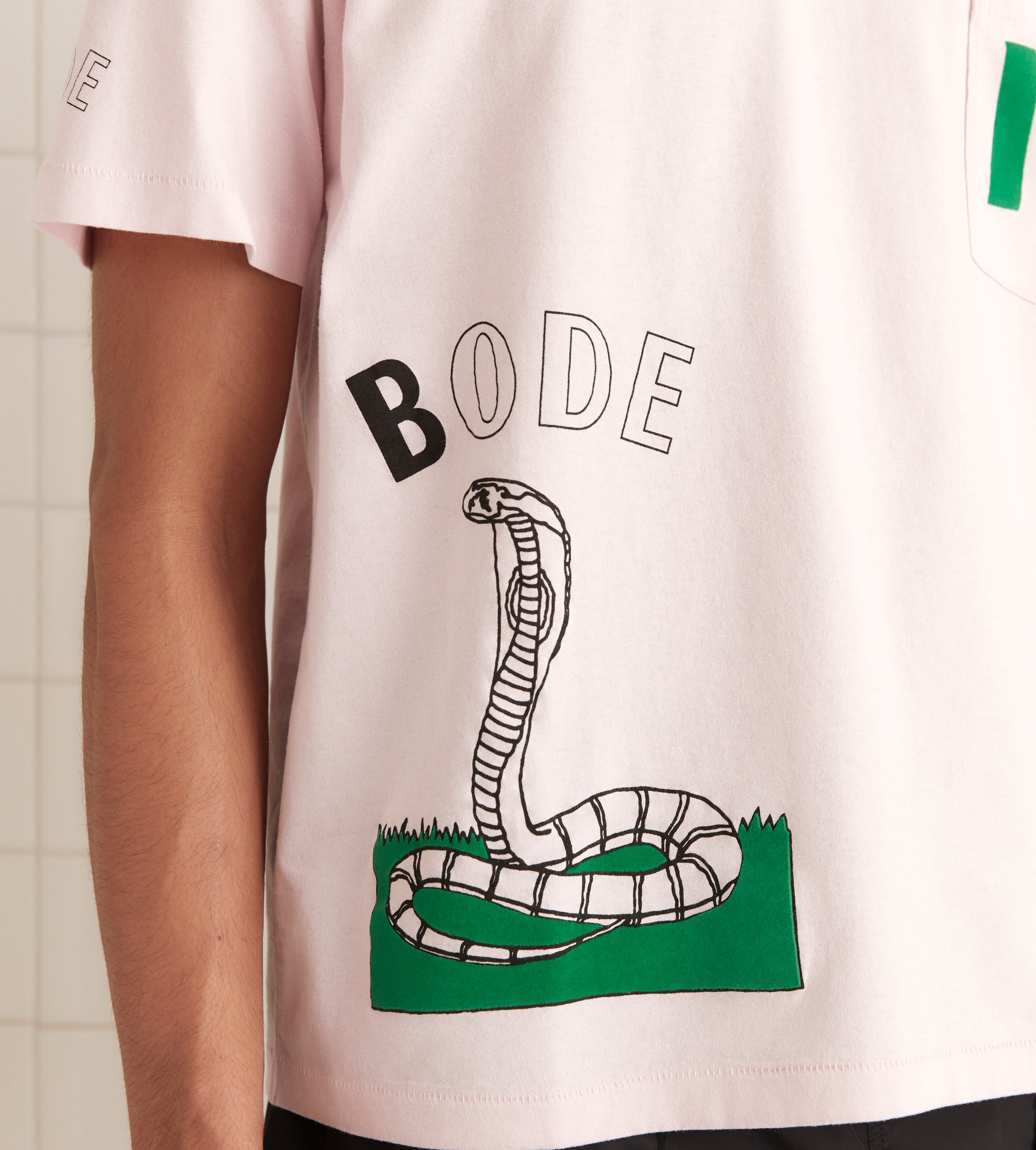 This shirt is inspired by a vintage tee from the 1980s. We reproduced the cobra print in the bottom corner, adding “Bode” and a 19 on the pocket.