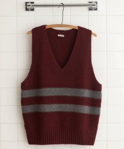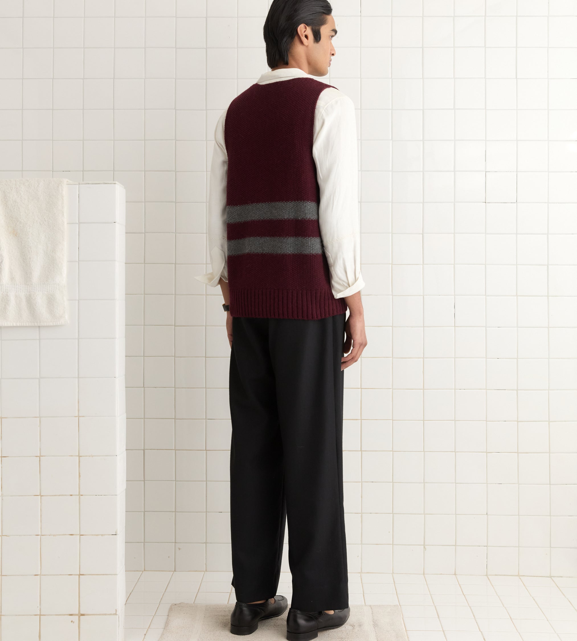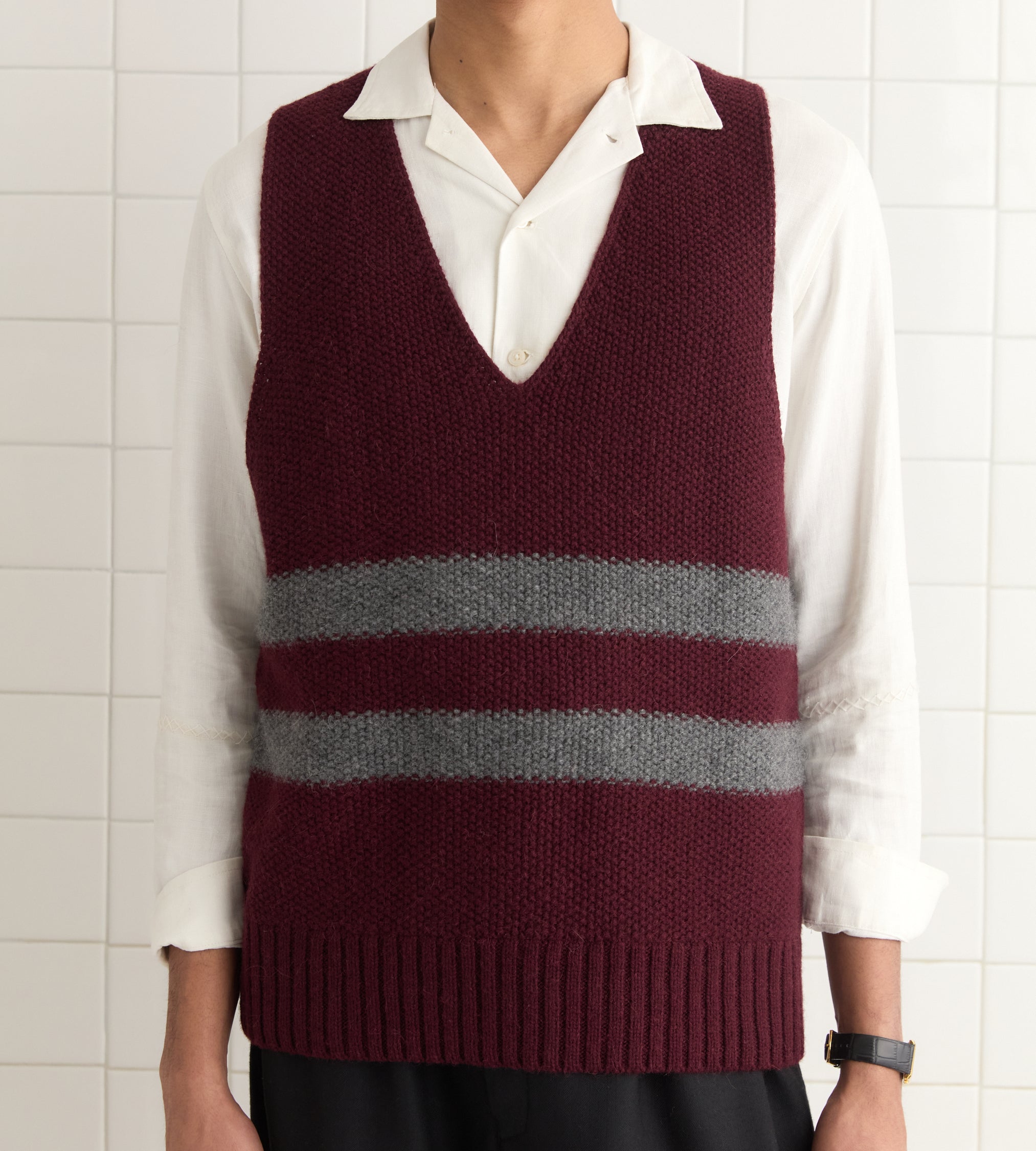 This sweater vest is a historical reproduction of a homemade vest from the 1950s. It is knit in a textured seed stitch and has two grey stripes on a burgundy ground.