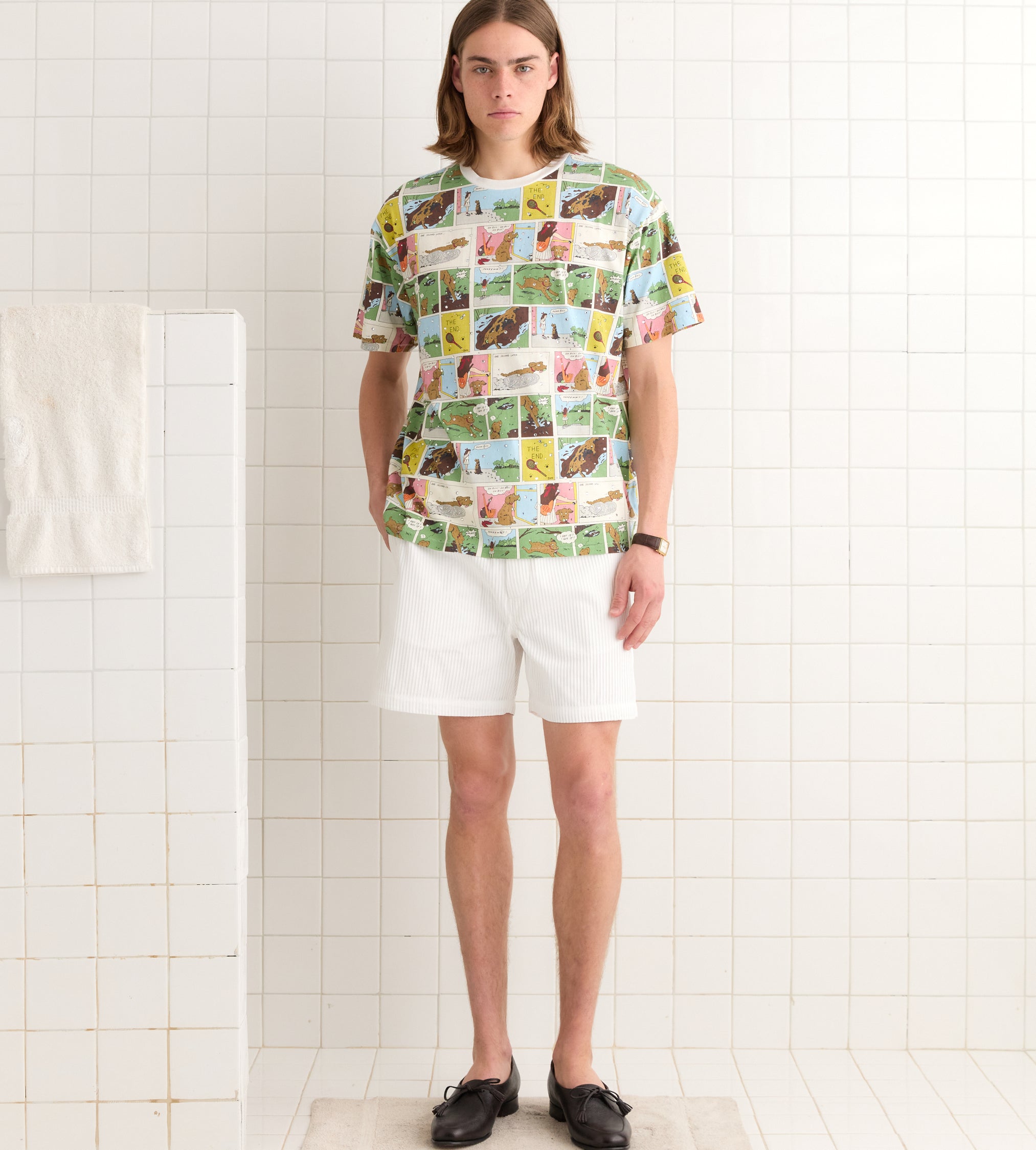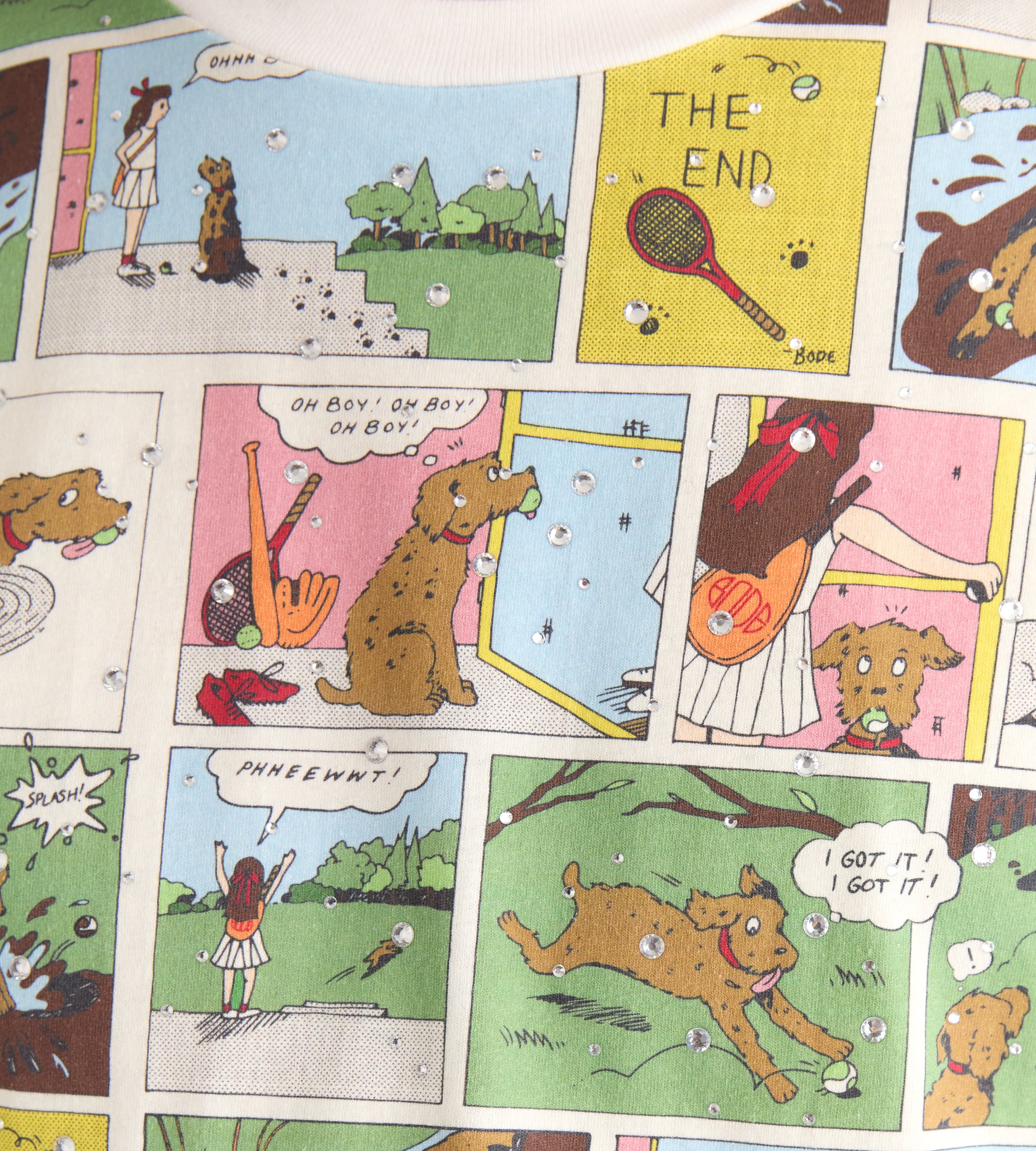 This tee is inspired by novelty yardage from the early 1950s, printed with a comic-strip pattern. We reimagined the comic strip for this style, which is covered in rhinestones.