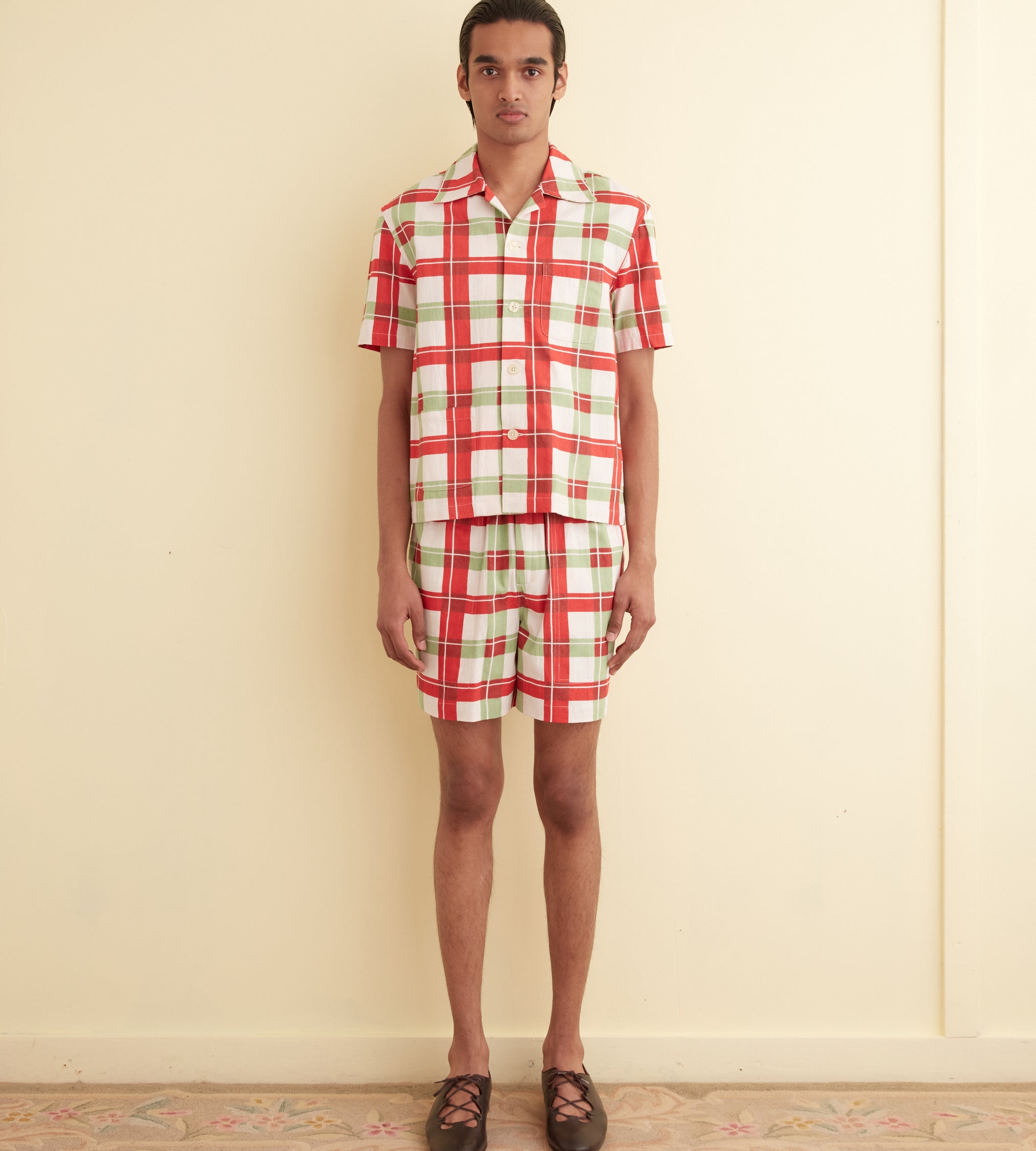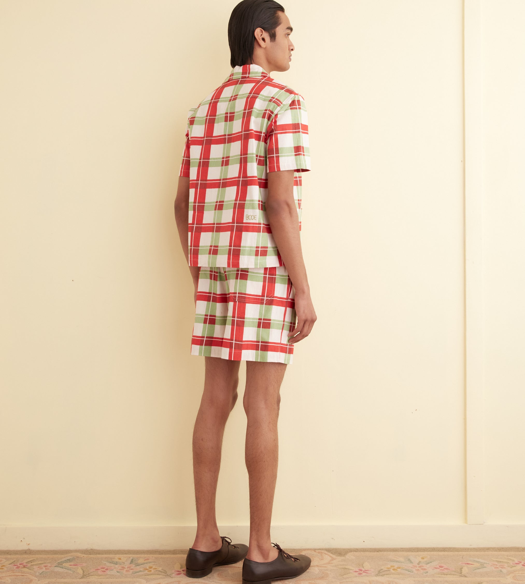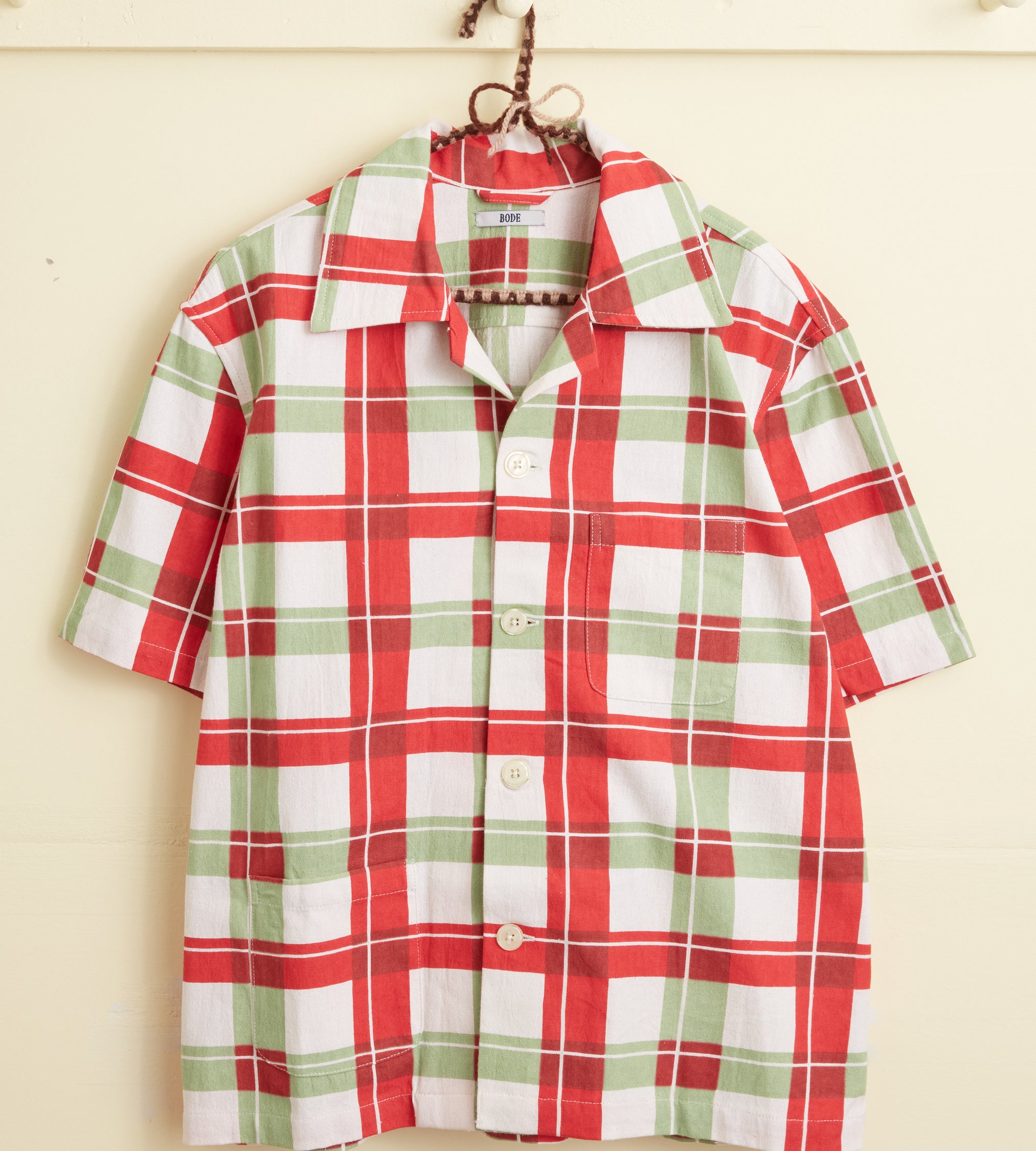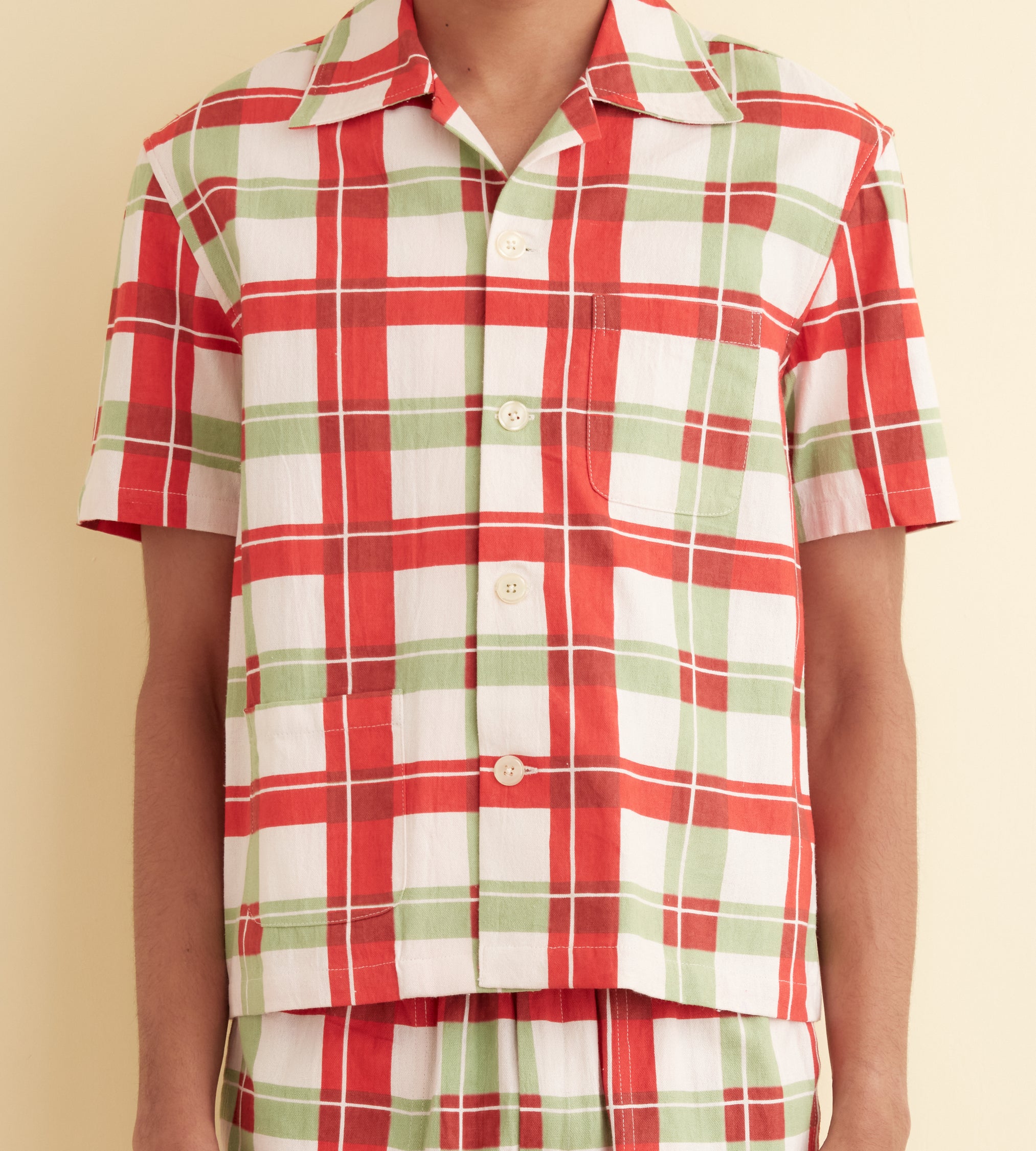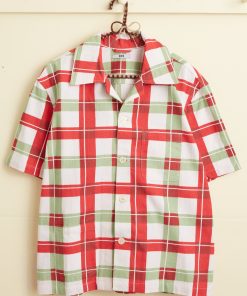 This shirt is inspired by a 1950s tea towel. We reproduced the green and red plaid pattern for this style.