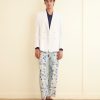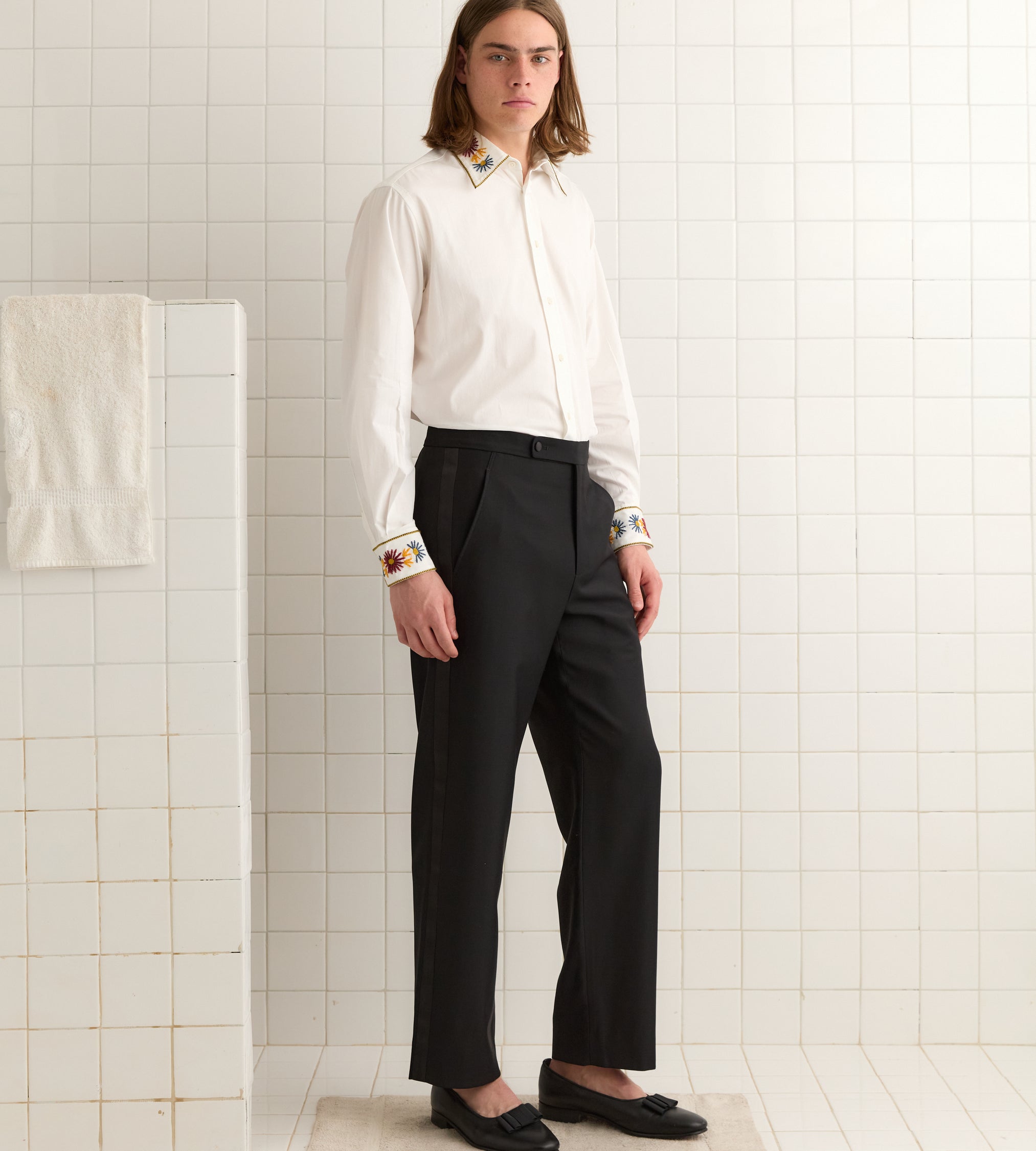 These trousers are inspired by men’s tuxedo pants from the 1950s-1960s. We reproduced the silhouette in fine black wool with a satin side stripe.