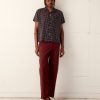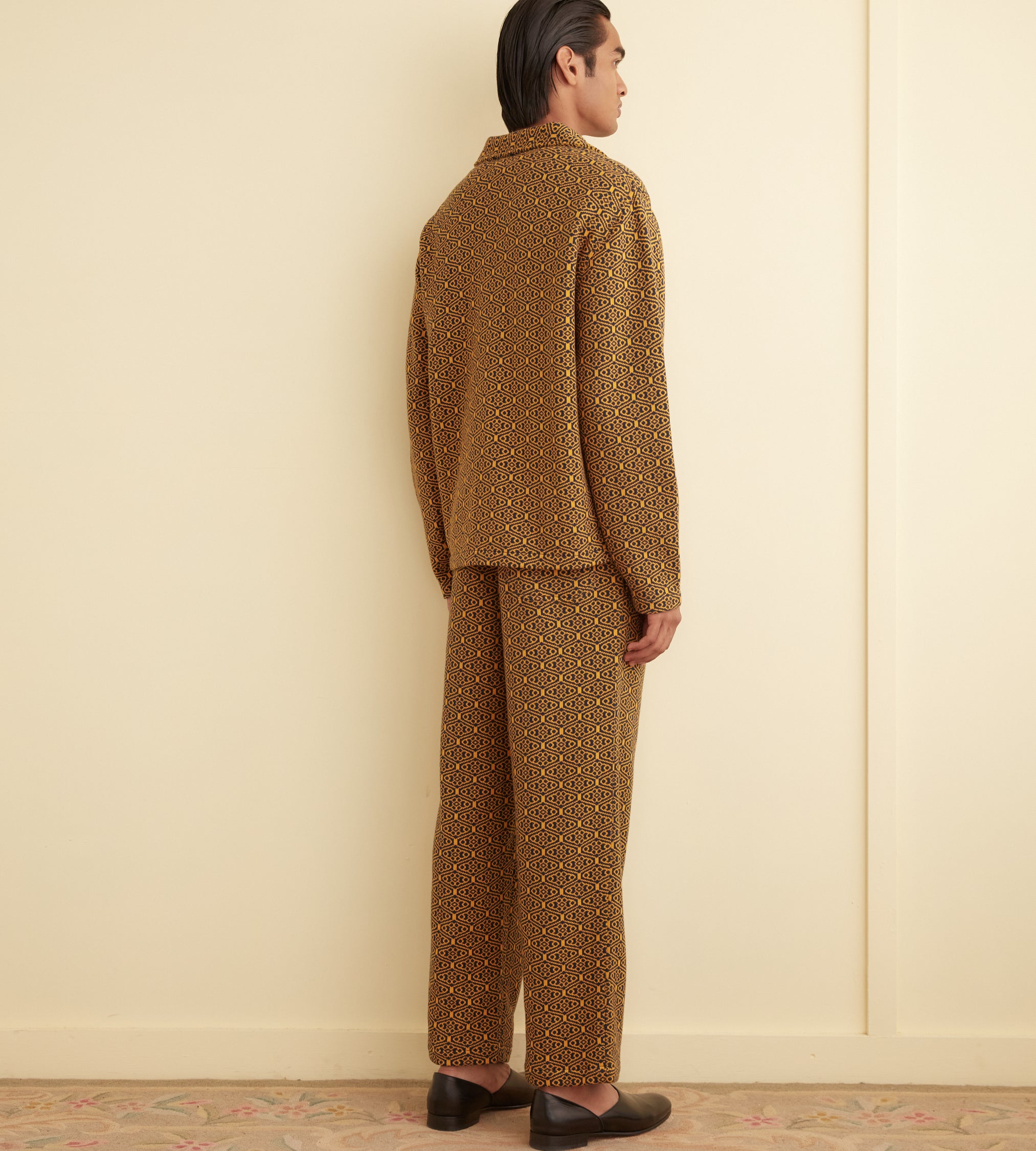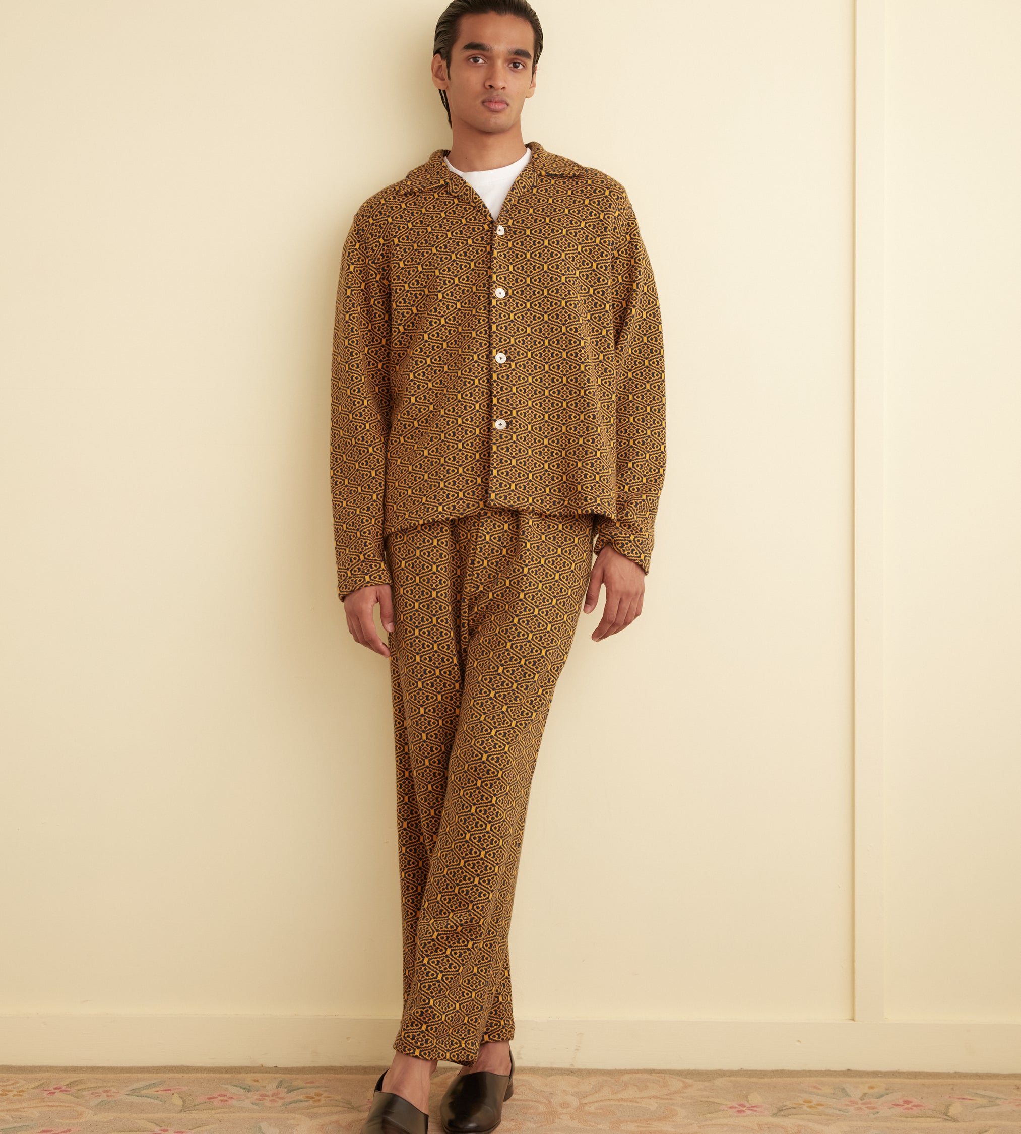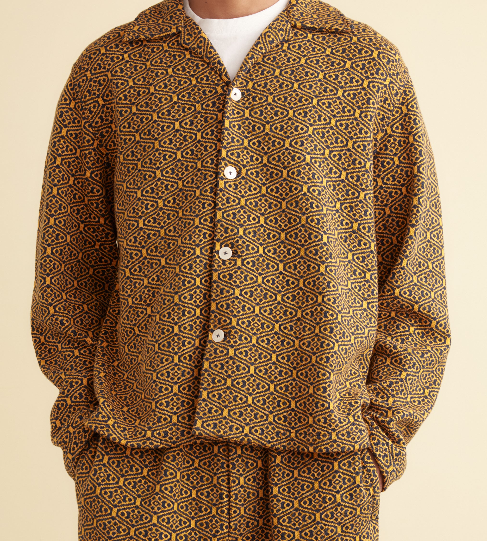 This shirt is inspired by a sweater from the 1960s-1970s. We reproduced the jacquard knit—a gold and navy geometric pattern—for this style.