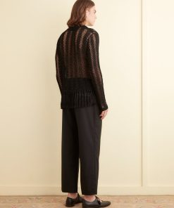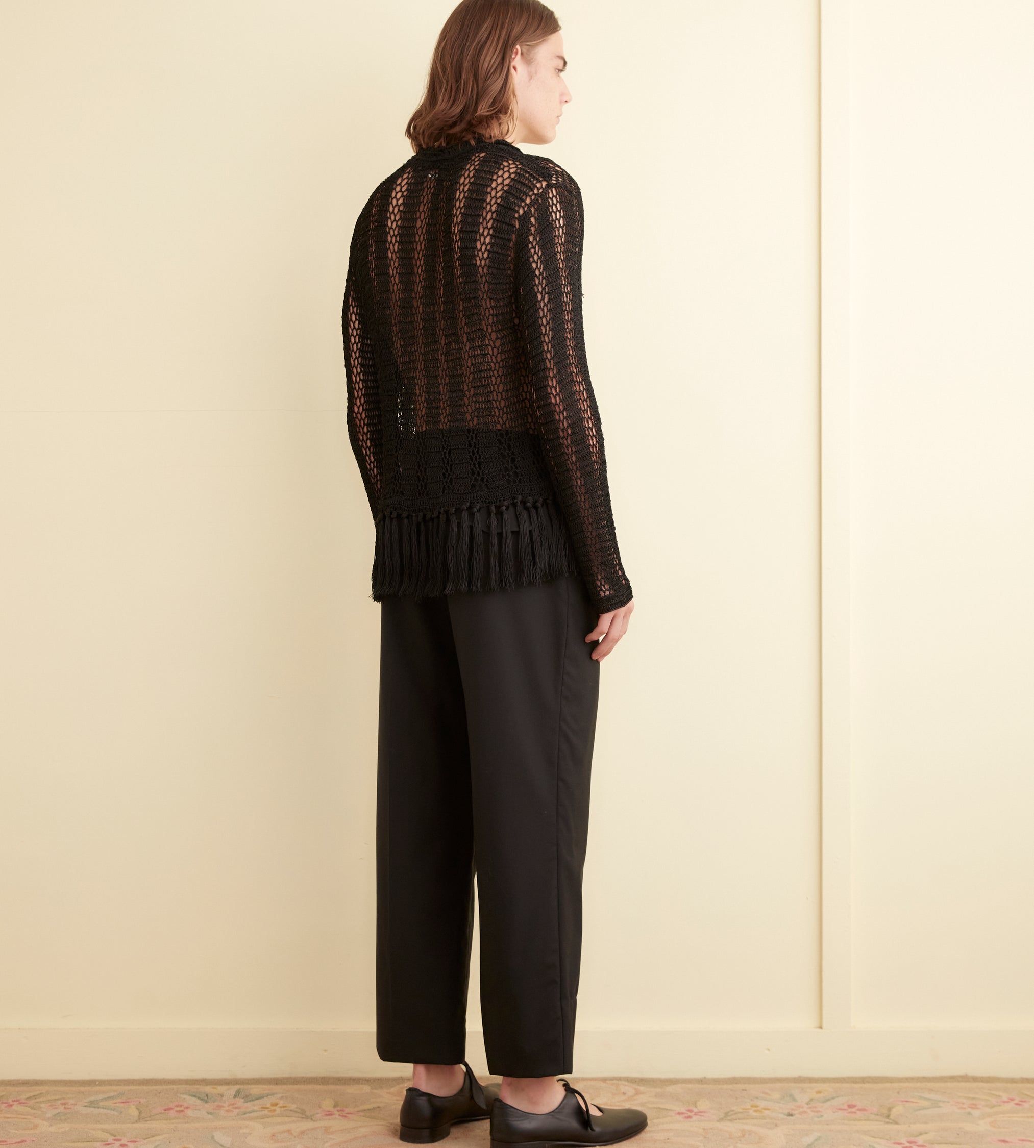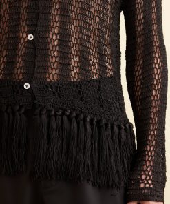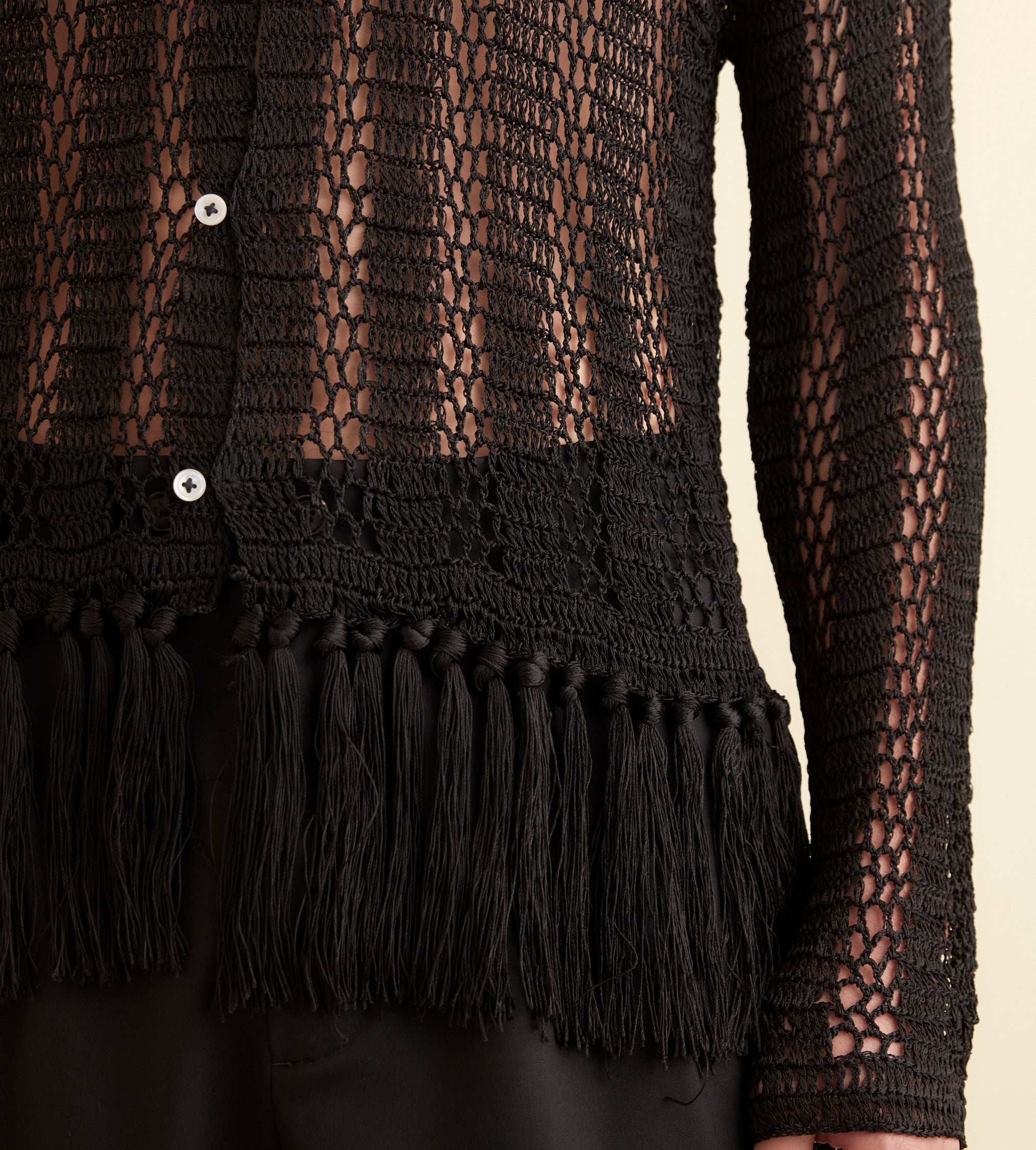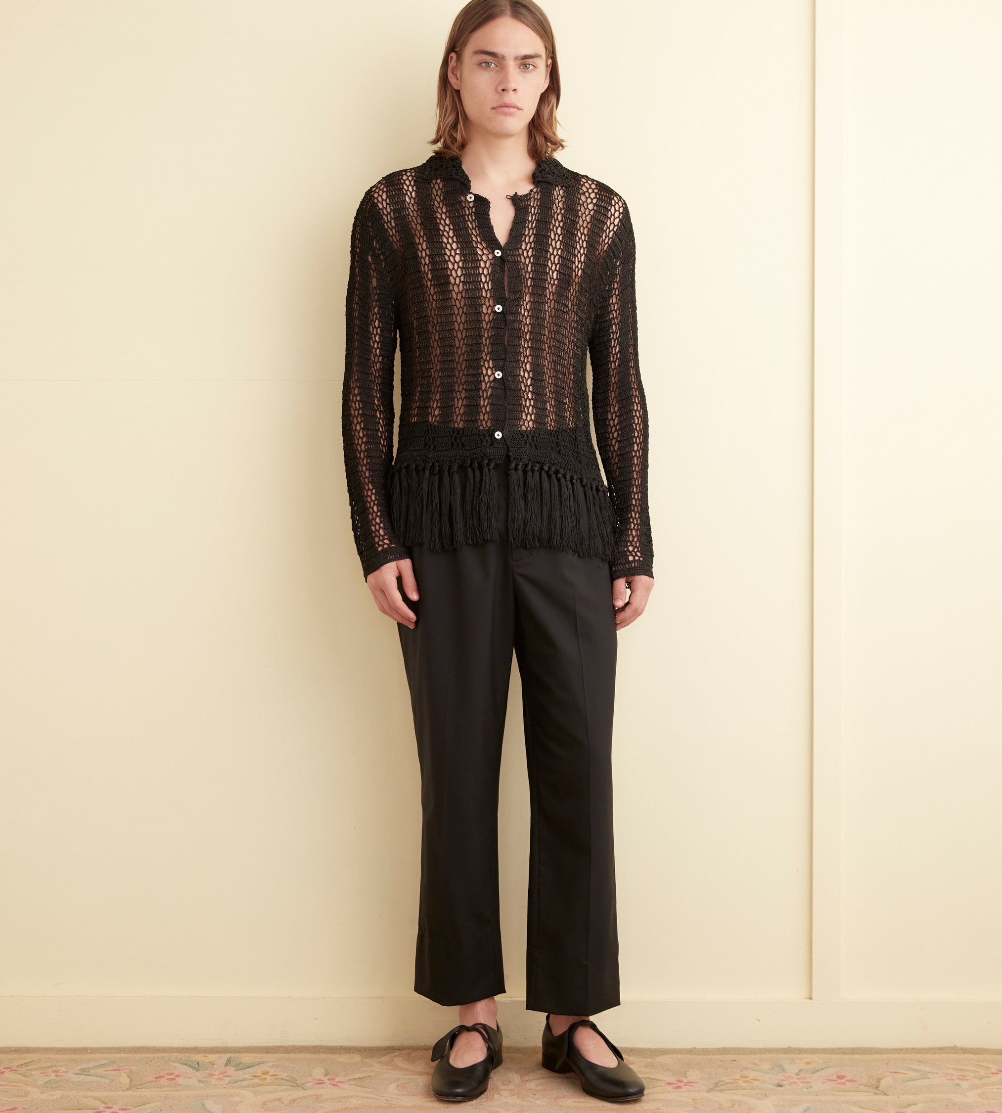 This shirt is inspired by vintage crochetwork, circa 1920s. Crochet is a comparably easy way to make lace and was widely used in the early 20th century for clothing, tablecloths, decorative trims, etc. This shirt is made of silky crocheted stripes and finished with knotted fringe.