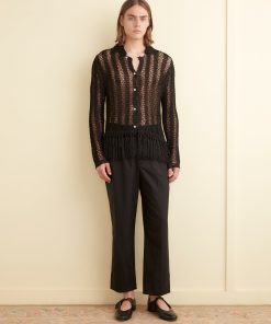 This shirt is inspired by vintage crochetwork, circa 1920s. Crochet is a comparably easy way to make lace and was widely used in the early 20th century for clothing, tablecloths, decorative trims, etc. This shirt is made of silky crocheted stripes and finished with knotted fringe.