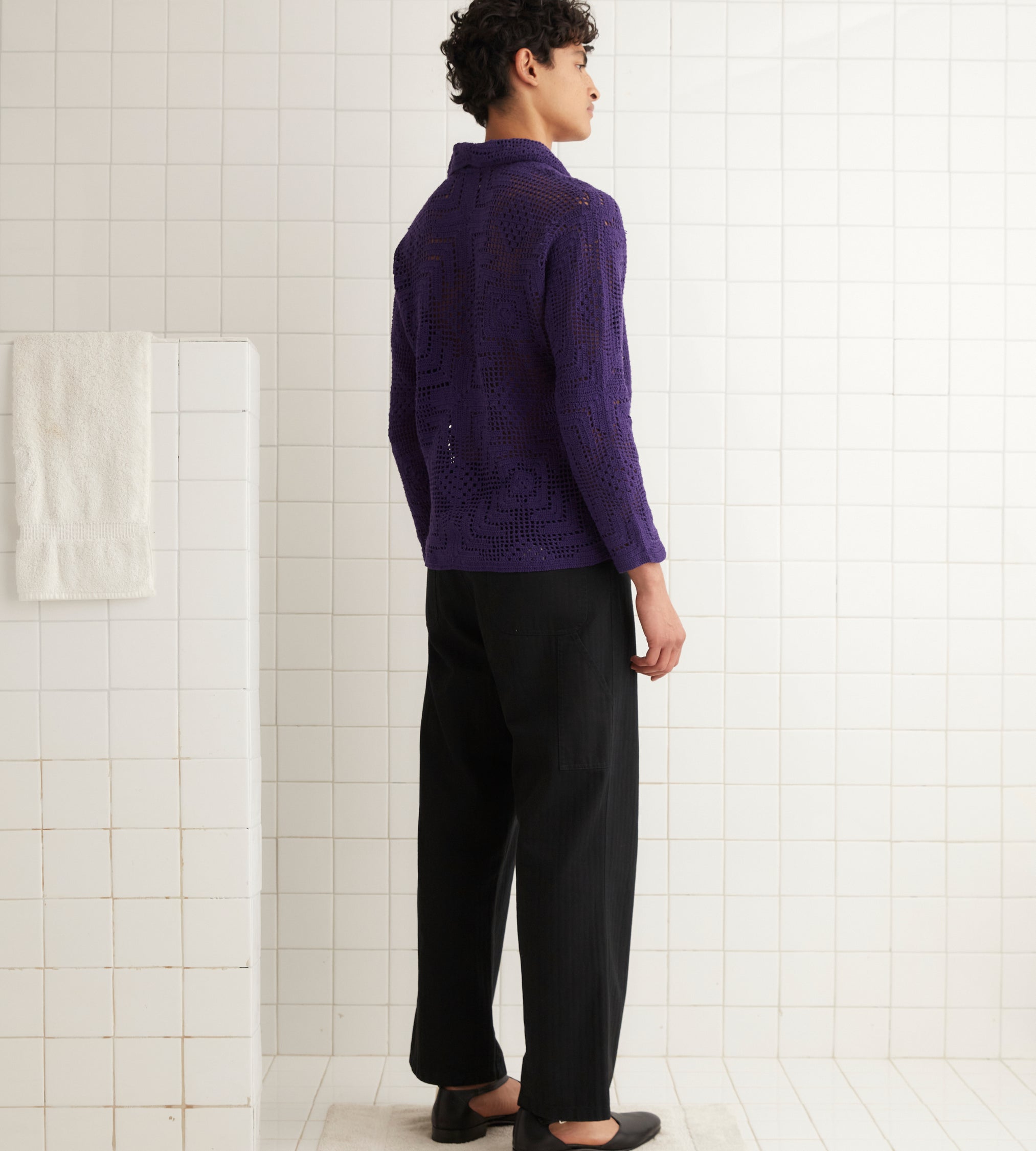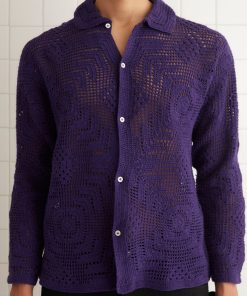 This overshirt is inspired by crochet tablecloths widely common thorughout the 1930s-1940s. We reproduced a crochet pattern in deep purple yarn for this style.