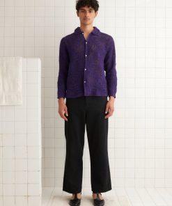 This overshirt is inspired by crochet tablecloths widely common thorughout the 1930s-1940s. We reproduced a crochet pattern in deep purple yarn for this style.