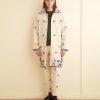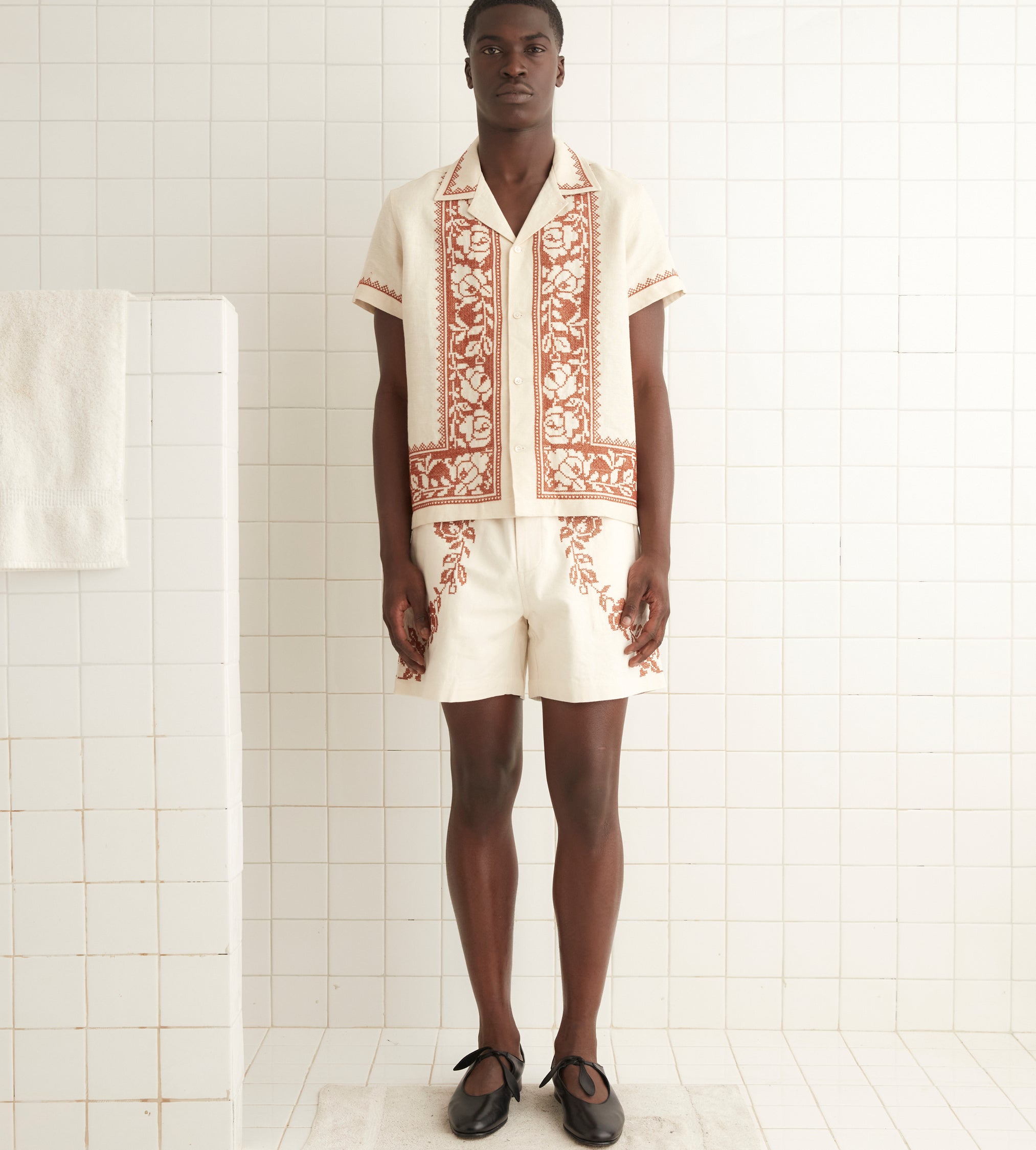 This shirt is inspired by a tablecloth from the 1910s-1930s. We reproduced the embroidered rose border, worked in terracotta-colored cross-stitching, for this style. The shirt is embroidered with “Bode” on the back.