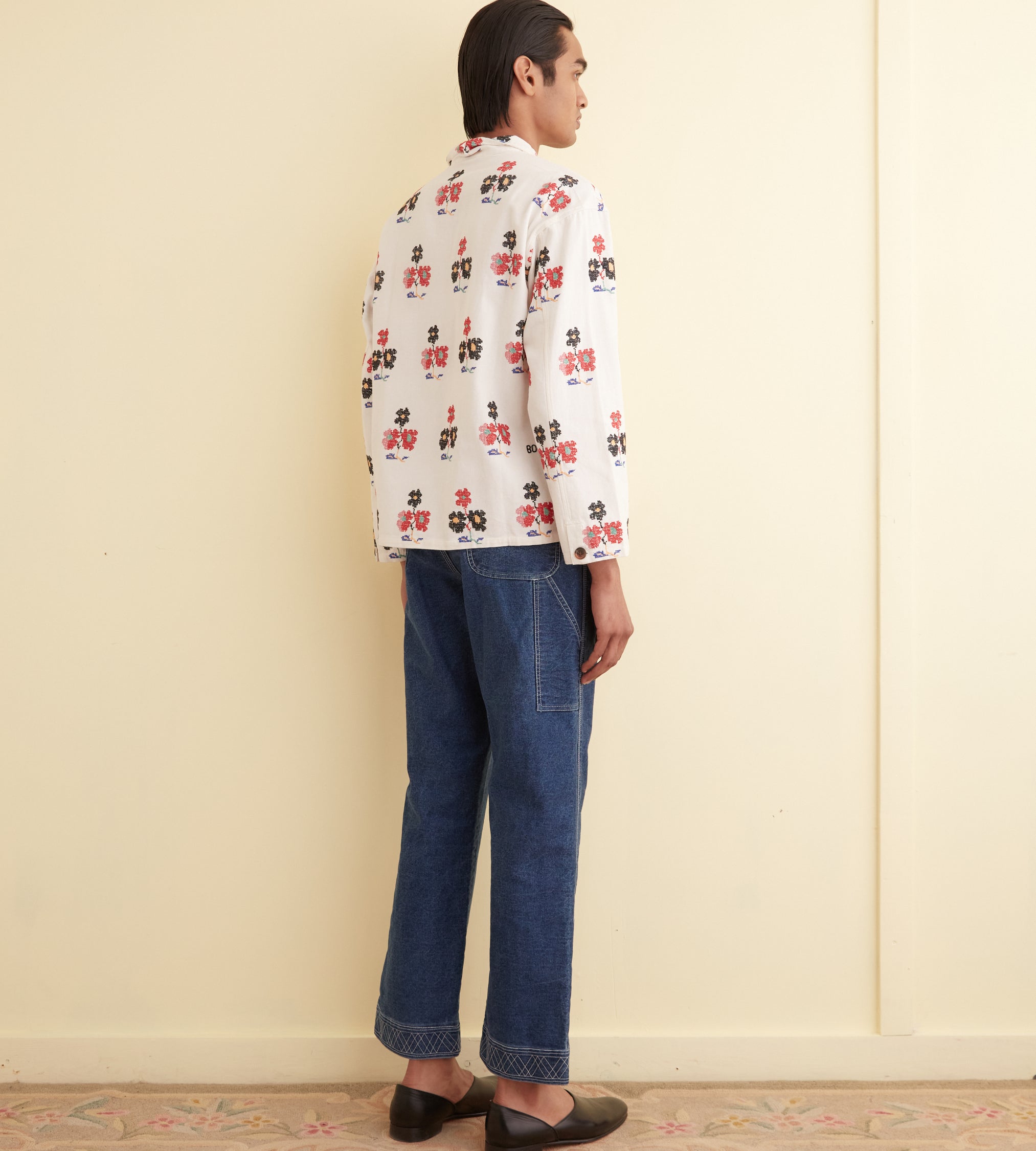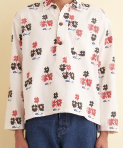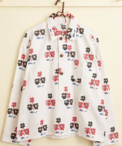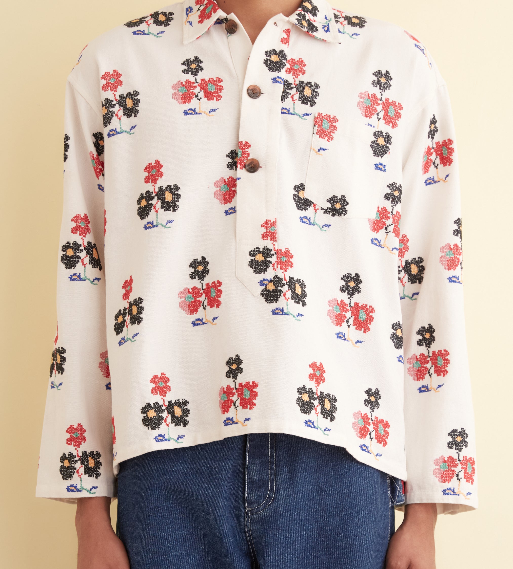 This pullover is inspired by Ukrainian folk embroidery from the early 20th century. We reproduced the red, blue, and black floral pattern for this style.